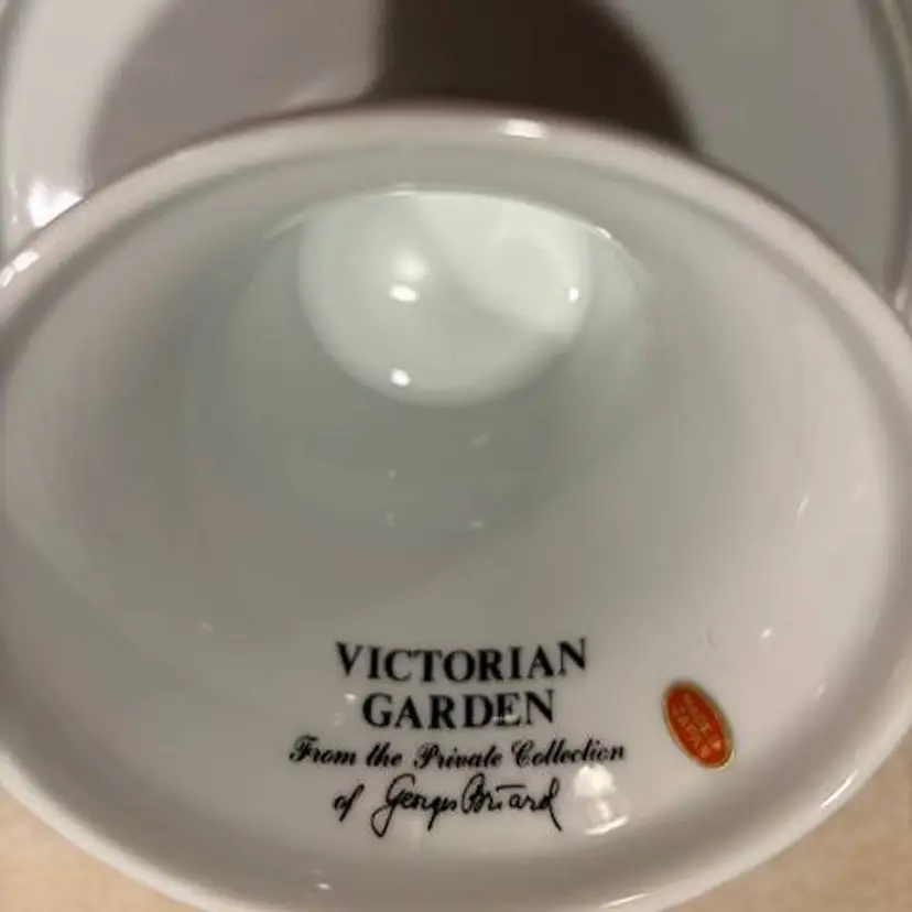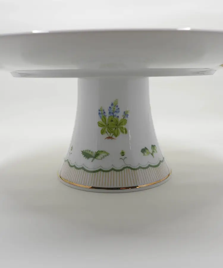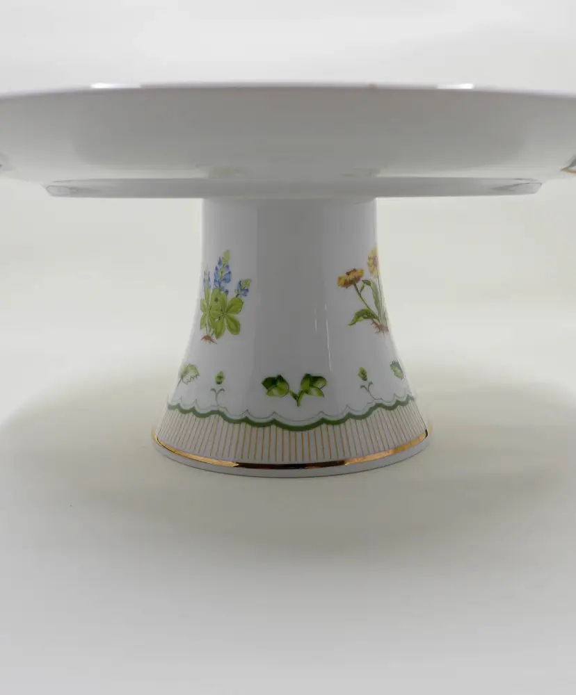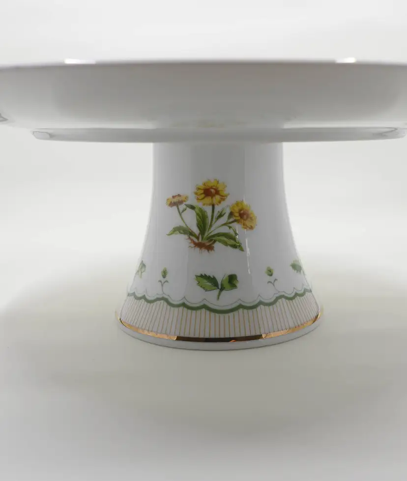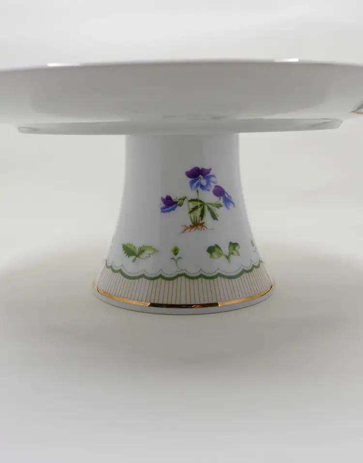 A porcelain pedestal cake stand with a classic round plate and a flared base. The piece is decorated with a delicate hand-painted floral motif with cyclamen flowers, and has a gold-trimmed rim. The base of the stand is also decorated with a floral pattern and a green and gold striped band. The bottom is marked Victorian Garden From the Private Collection of Georges Briard - Made in Japan. Approx. size: 10.5" round x 4.5" tall, the piece is in excellent condition with no chips or cracks.