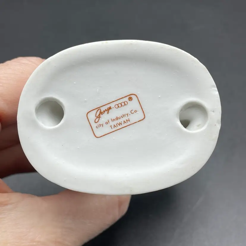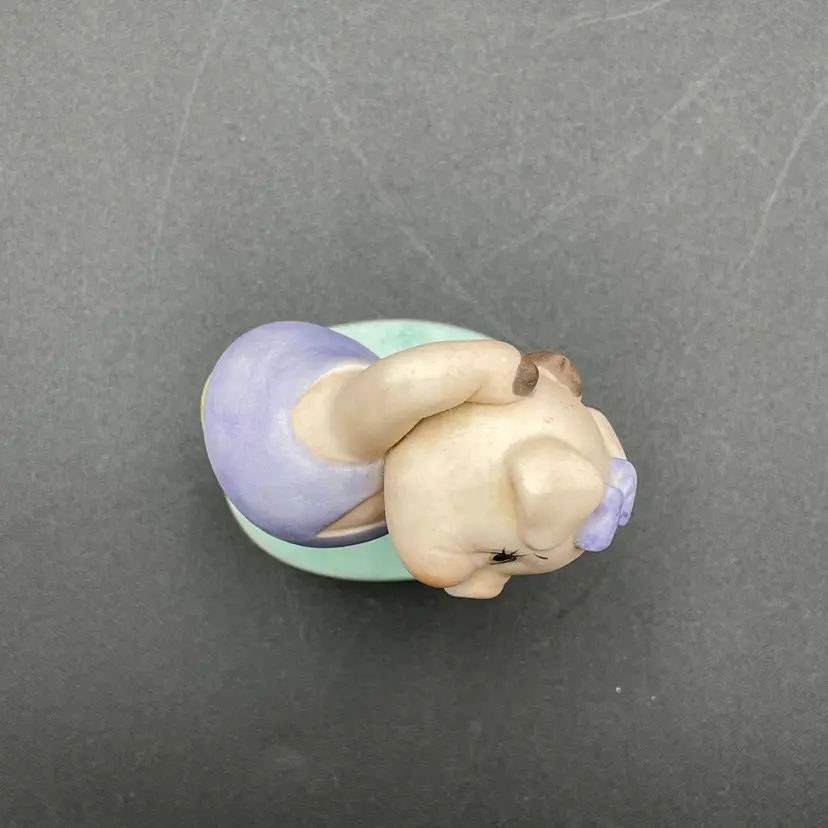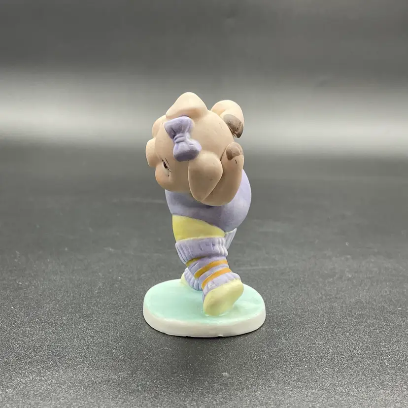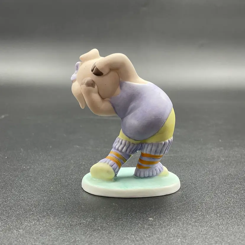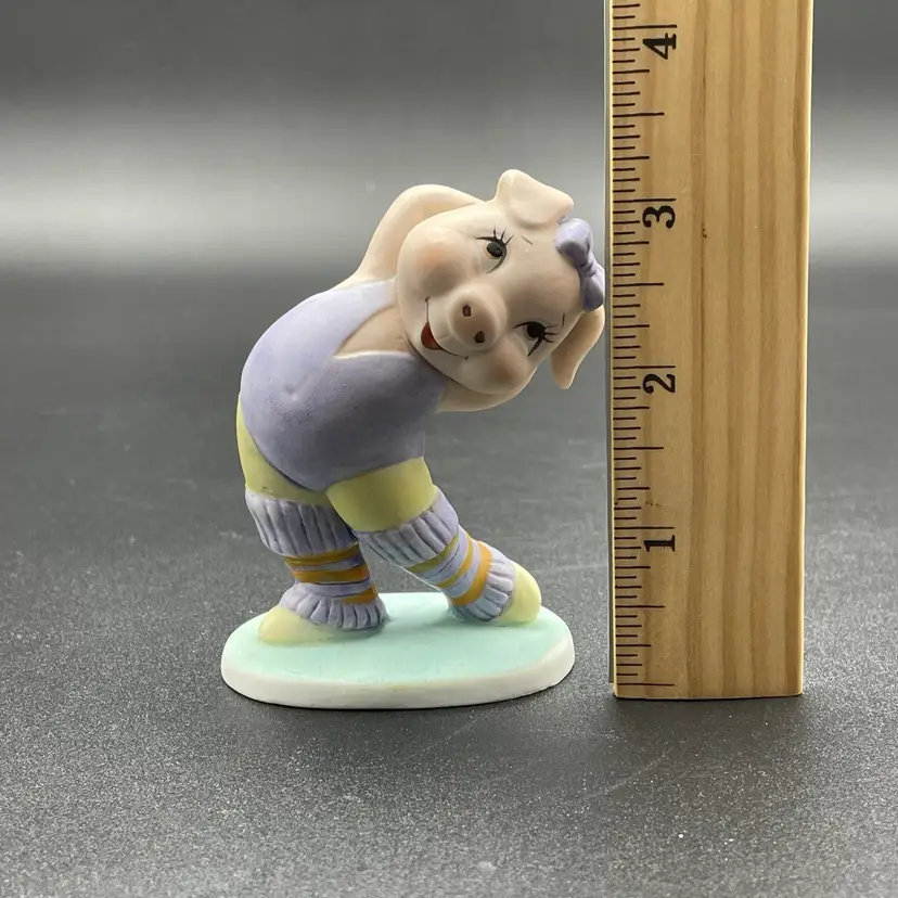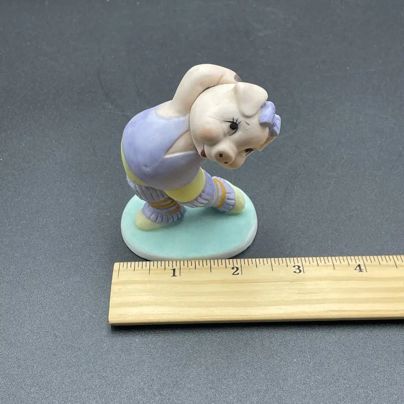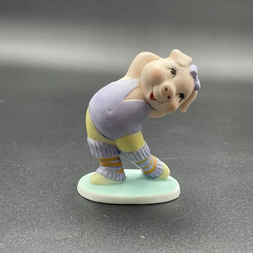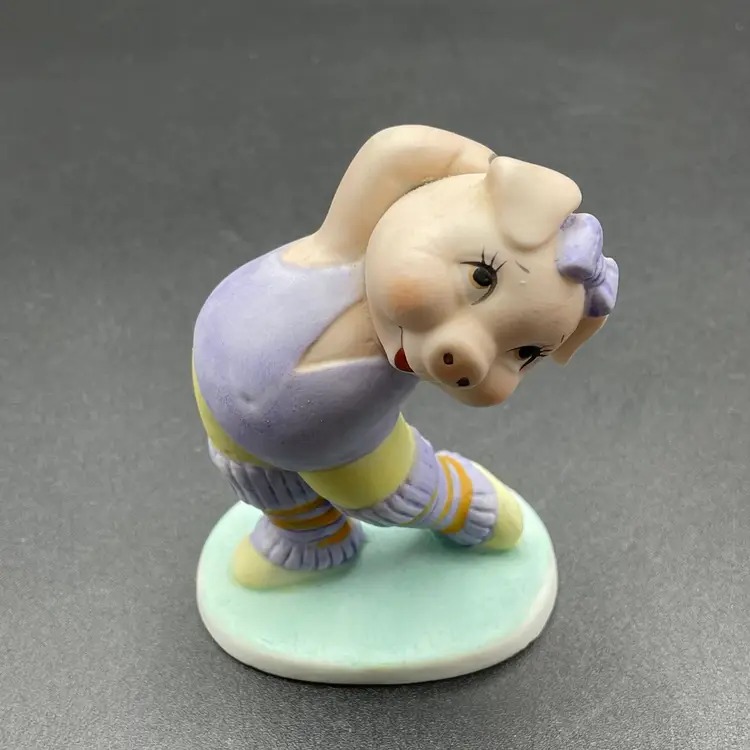 This is a vintage George Good porcelain anthropomorphic aerobics girl pig in purple leg warmers and leotard figurine. Measures approximately 3.5" tall. Made in Taiwan. No chips or cracks.