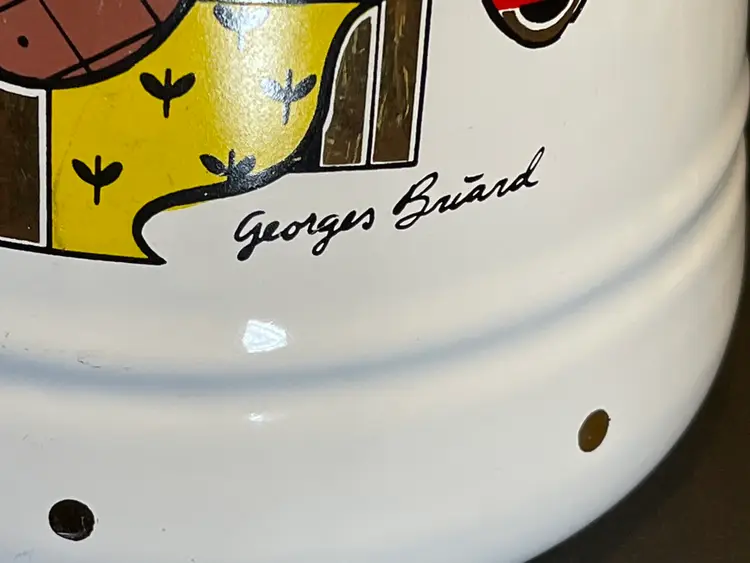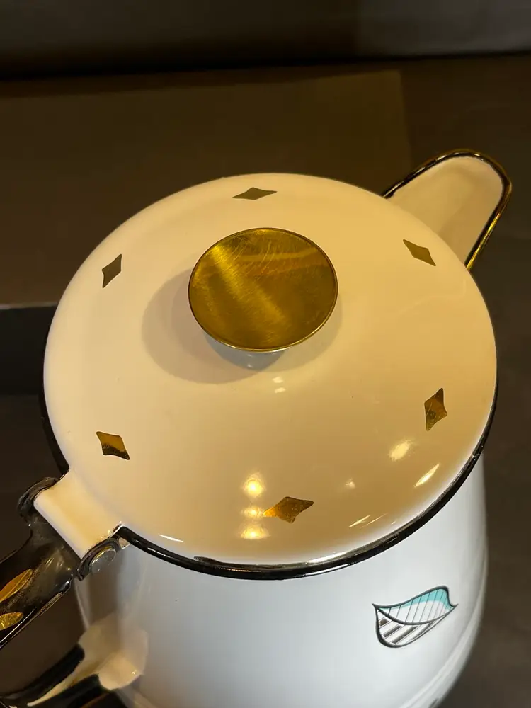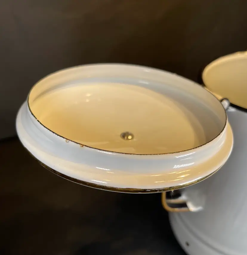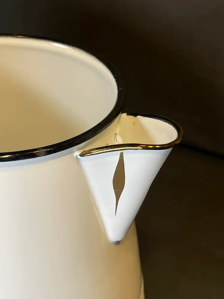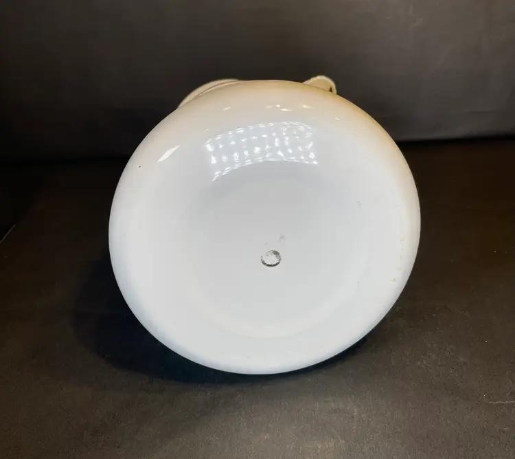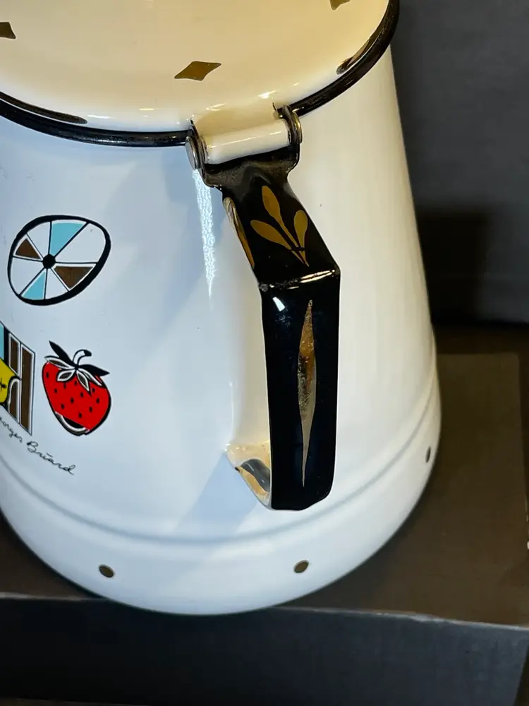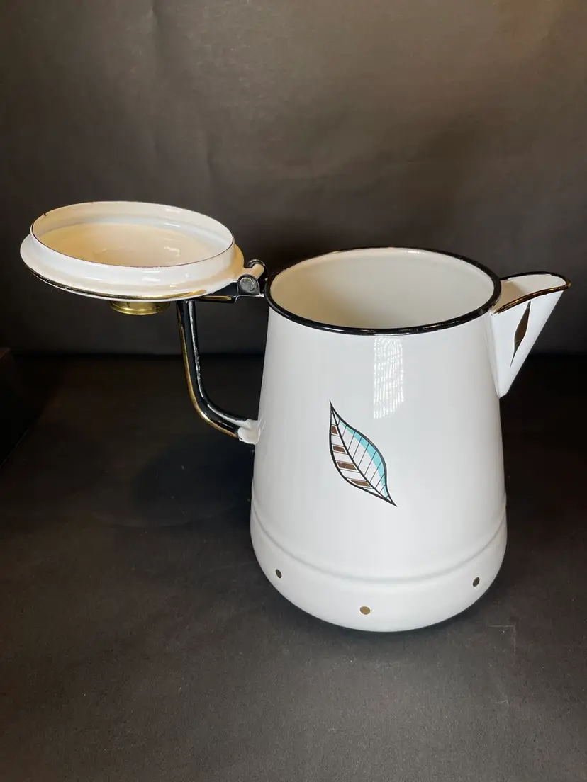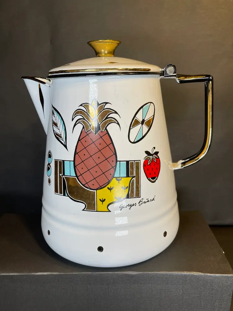 This 11” pitcher features a beautiful pineapple ambrosia design, has a hinged lid, and has an enamel finish. It’s in good condition with minor ware.