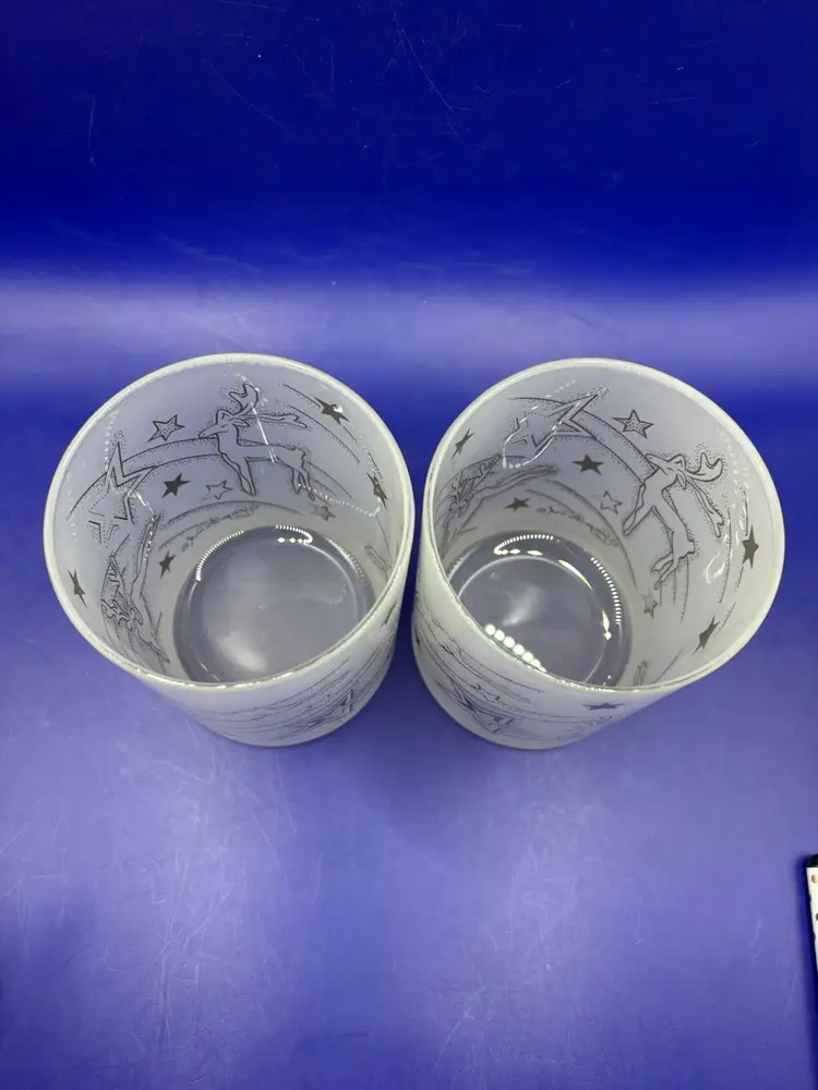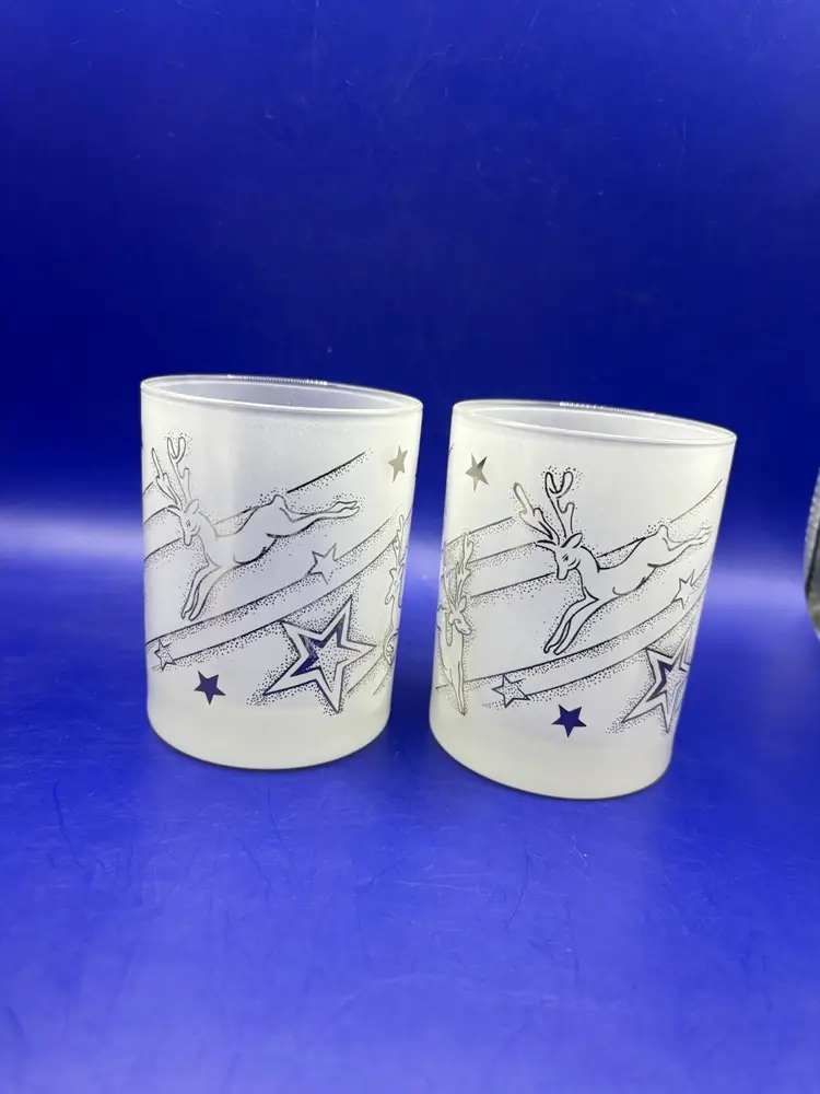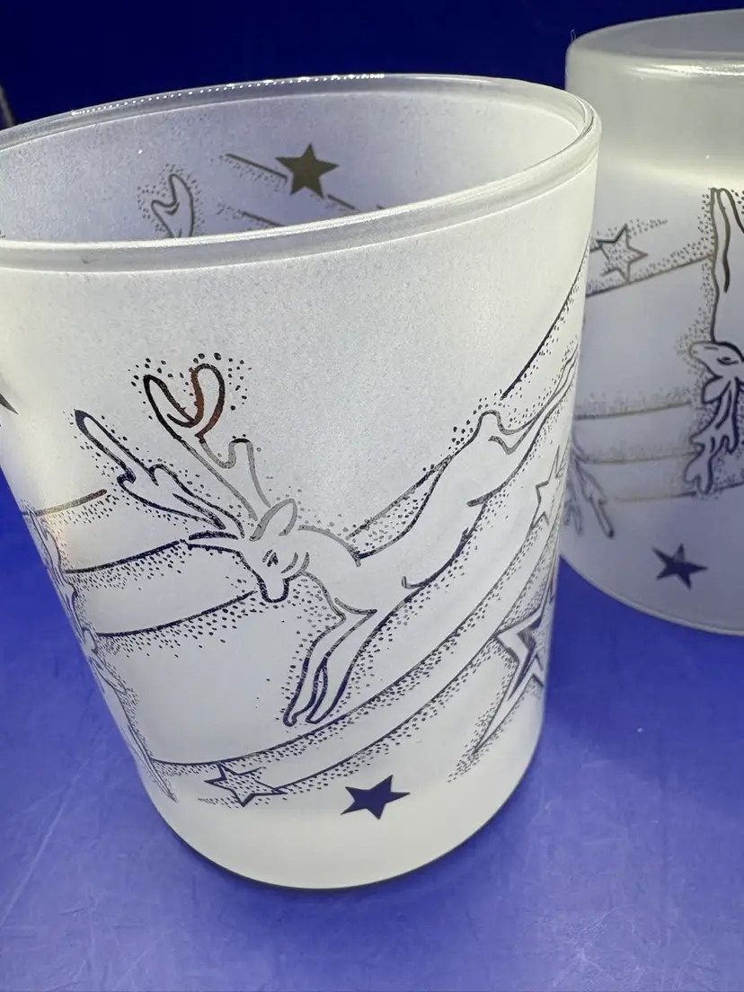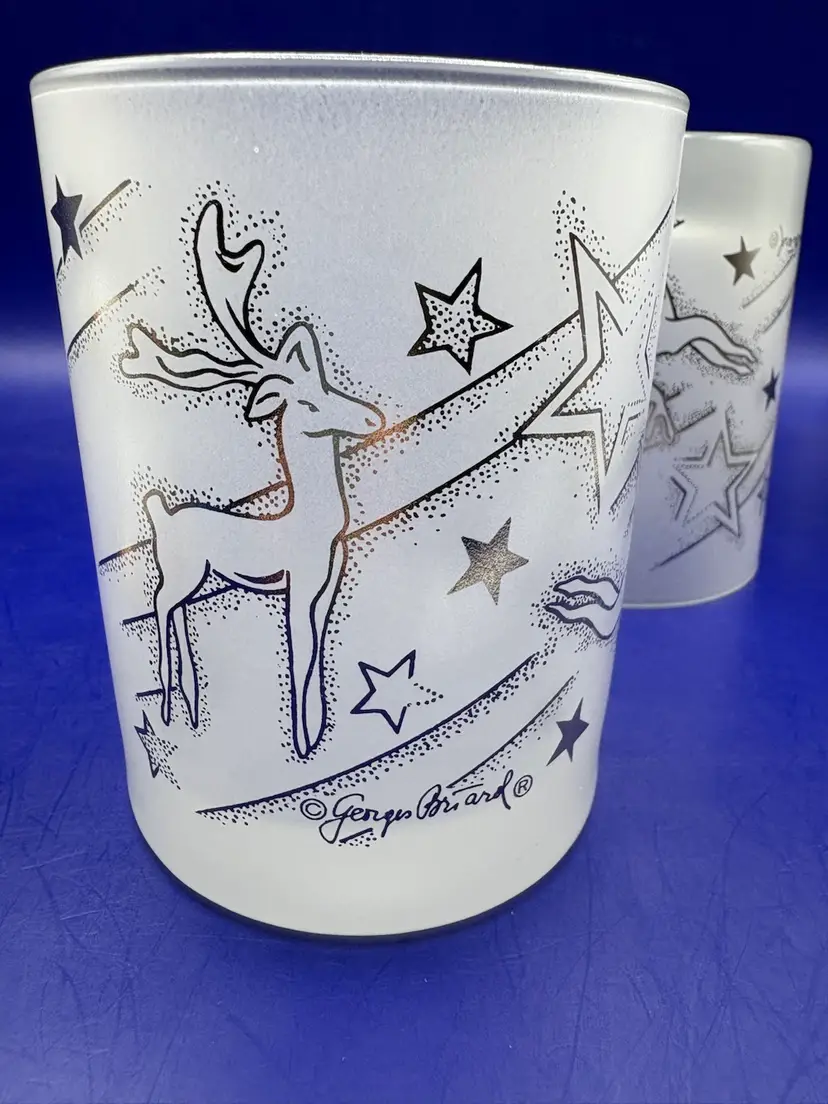 Georges Briard Old Fashion Glasses Set of 2 Called “Silver Reindeer” Frosted glasses with silver outlined reindeer and stars Signature on both Measures 4 inches tall with mouth opening of 3 1/4 inches Excellent condition except one reindeer on one glasses is slightly faded…see photo