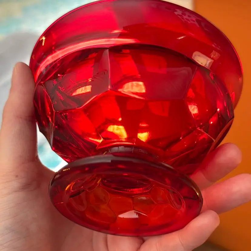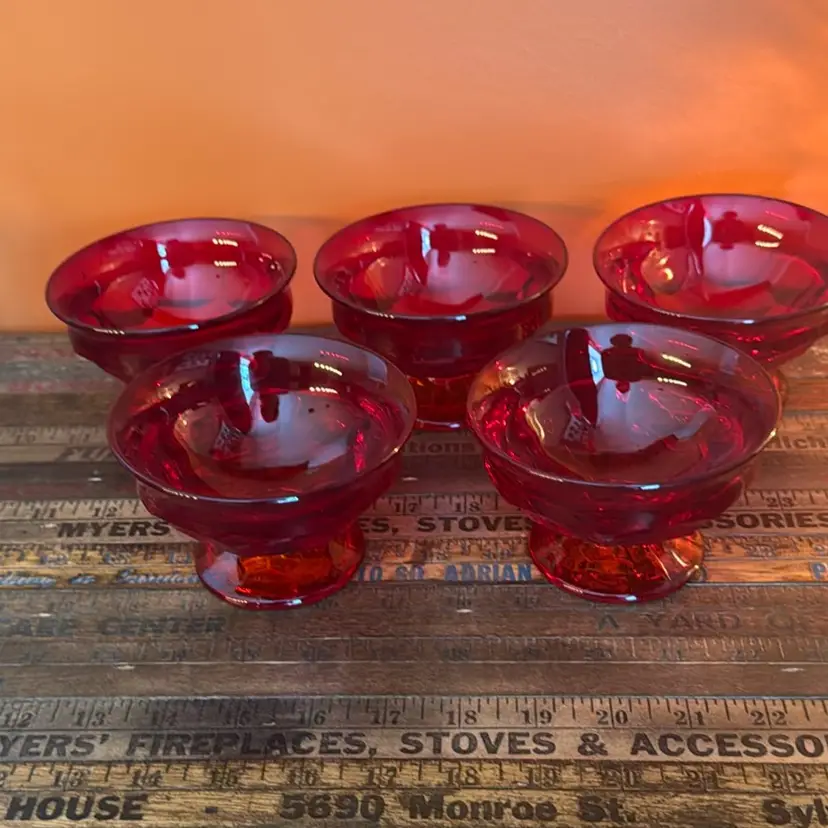 5 count of great condition Viking ruby dessert or sherbet dishes. Some bubbles on the bottom of the dishes. Great condition otherwise with no chips or cracks.