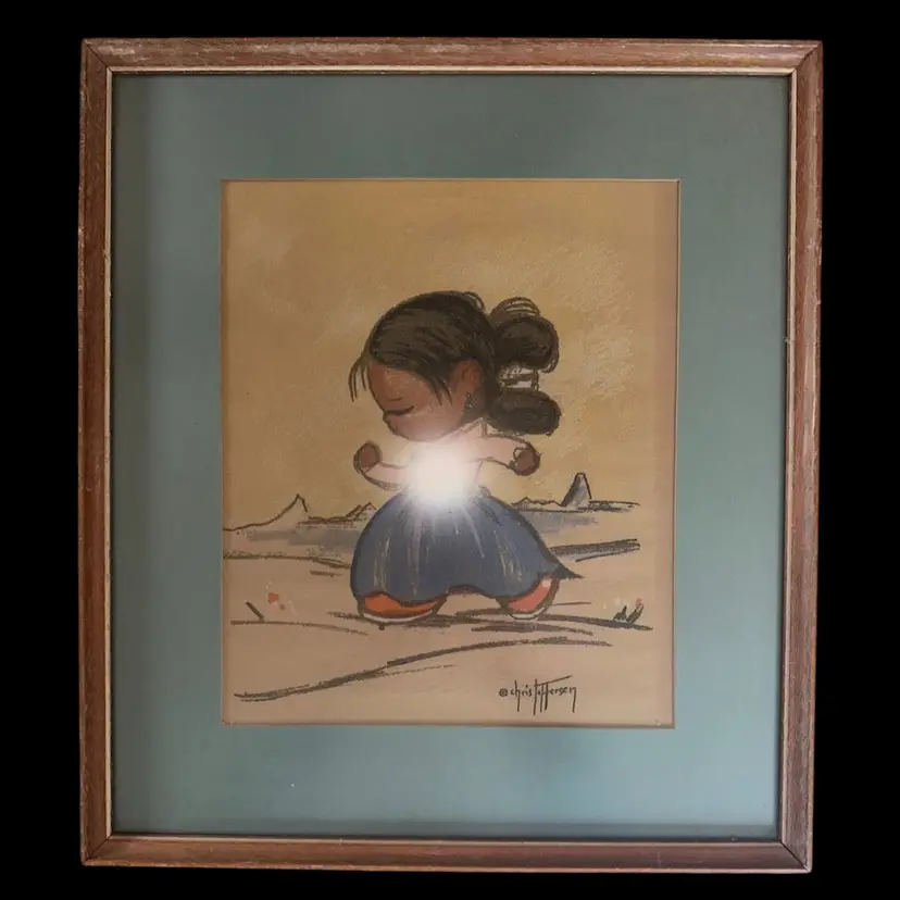 Gerda Christoffersen Professionally Framed Vintage Native American Boy & Girl Medium: Pastel On Silkscreen Callout: these are professionally framed however, it looks like the littles girl picture has shifted in the frame. Unsure if it can be put back without taking the backing off. Total measurements: each measures 17 3/4 inches tall by 15 3/4 inches wide and just over 3/4 of an inch deep Info about the artist: Gerda Christoffersen (1917-2012) was an internationally know painter. She was born in Denmark and had spent most of her life in Canada and the United States studying the culture of North American Indians.
