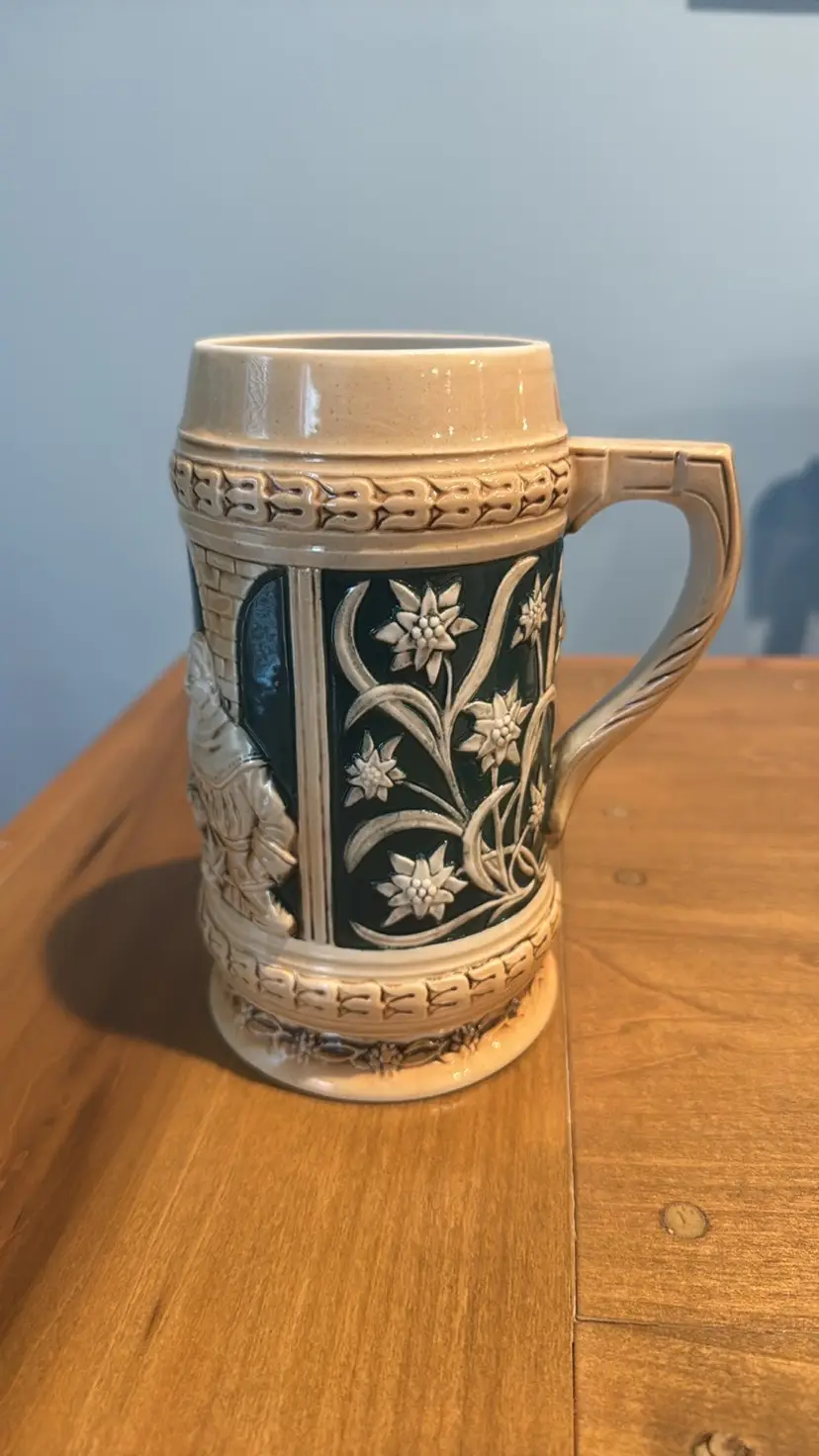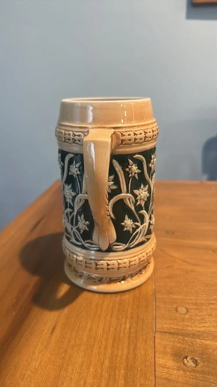 German Beer Stein Sitzendorfer Porzellanfabrik; Early 1900s 6.75” tall 3” diameter This vintage ceramic beer stein features intricate designs with tan and green accents, perfect for adding a classic touch to your home decor. Sitzendorfer Porzellanfabrik Gebrüder Voigt A.G. / (V.E.B.) Sitzendorfer Porzellanmanufaktur (A.G.) (G.m.b.H) Hauptstrase 26, Volkstedt. (& Unterweißbach 1890 - 1928). Thuringia.Hersteller: Founded by Wilhem Liebmann in 1850 after selling his first factory to Gebrüder Heubach (the famous bisque doll manufacturer). The company was nearly destroyed by fire in 1858 so Wilhelm Liebmann decided to retire. Alfred and Carl Wilhelm Voigt became joint chairmen and rebuilt the factory. In 1896 the company became a limited company with a stock holding of one million marks. The major shareholder was Albert Schönau. It is his initial "S" which in 1902 became part of the Sitzendorfer "Crown over S" mark. Excellent condition with no breaks or chips looks almost new (73075254)