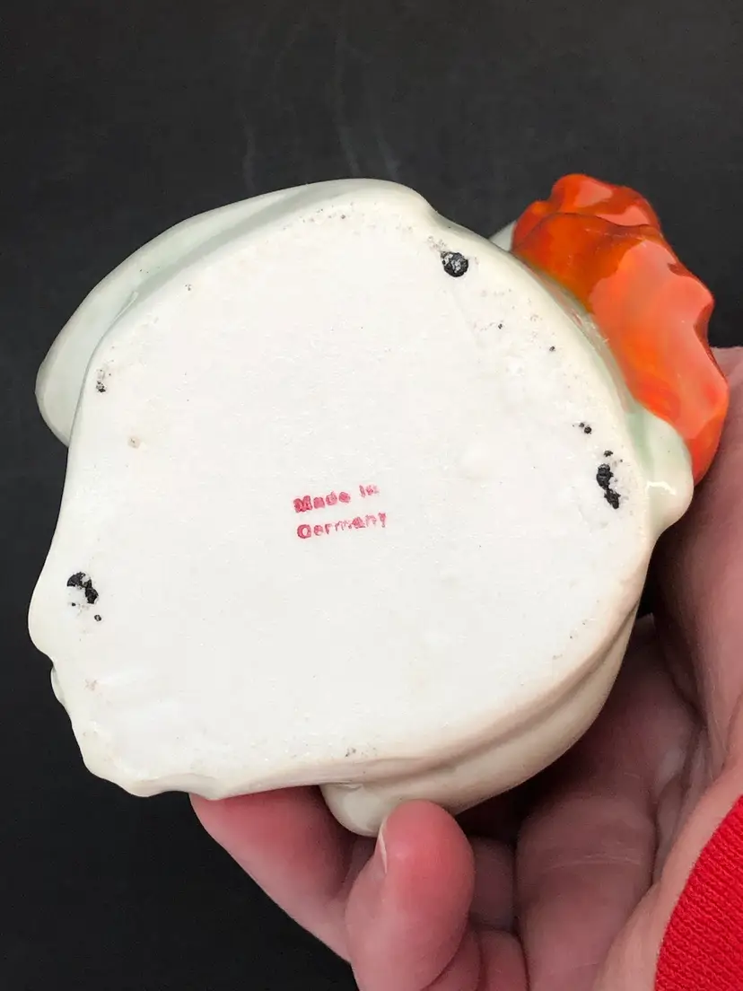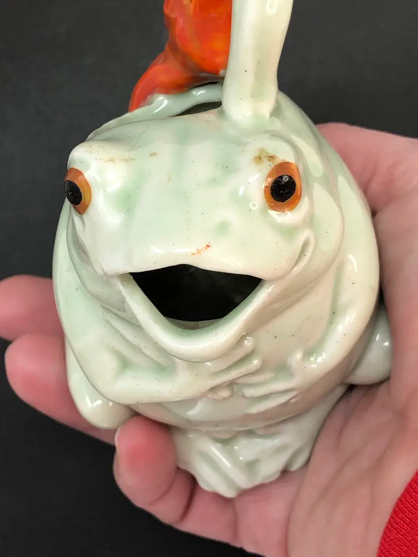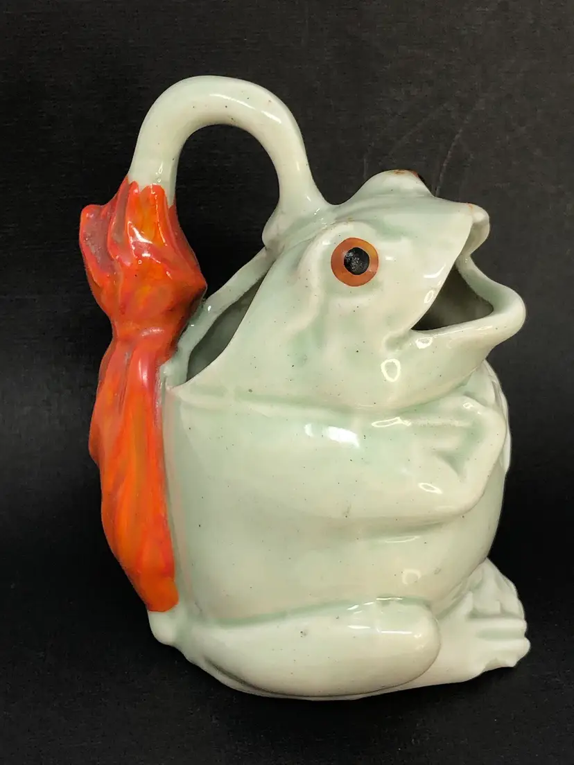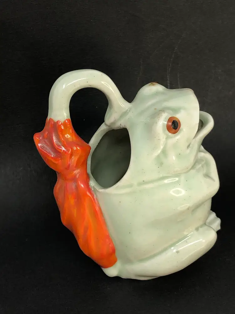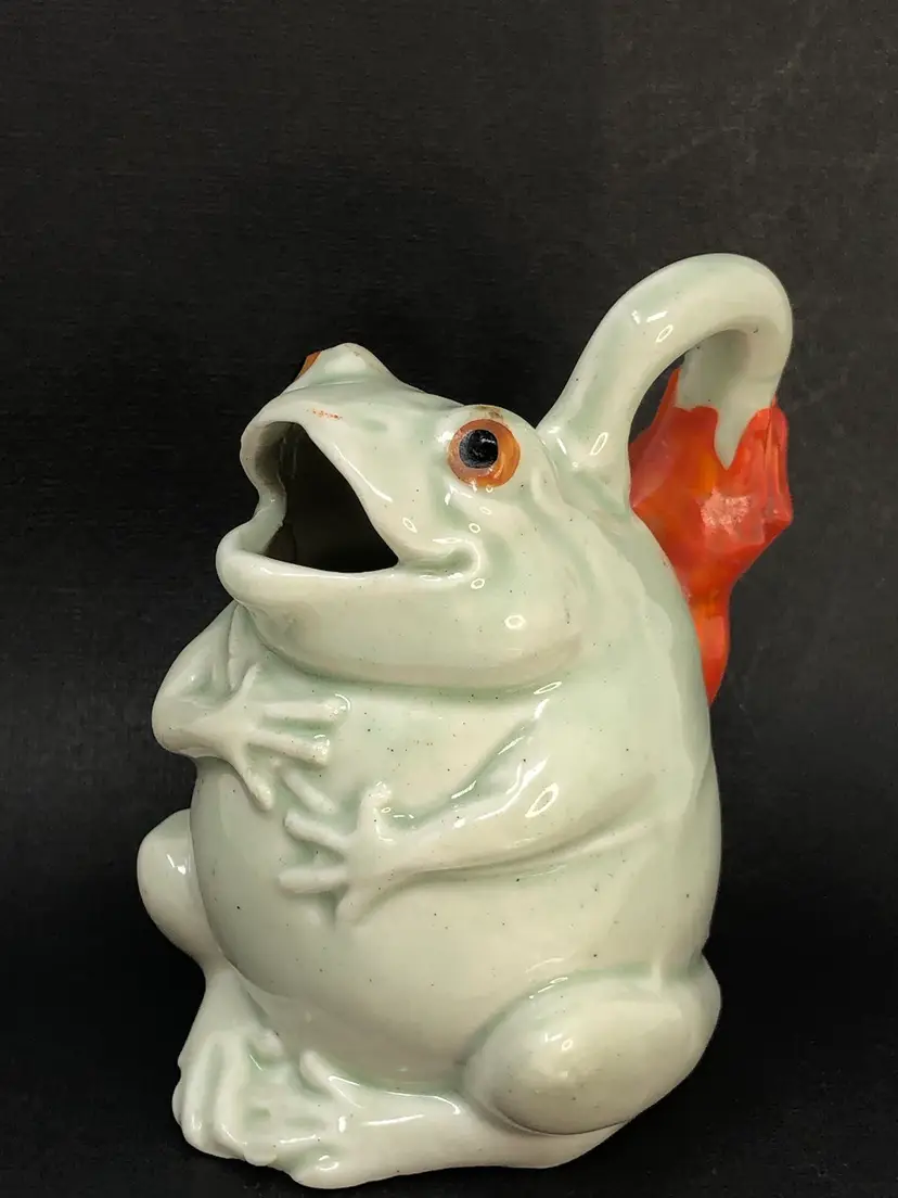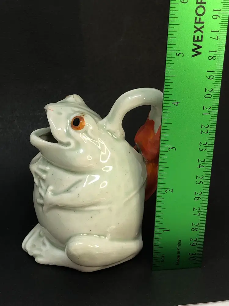 4" tall ceramic frog cream pitcher with umbrella handle. Made in Germany stamped on the bottom, no chips or cracks