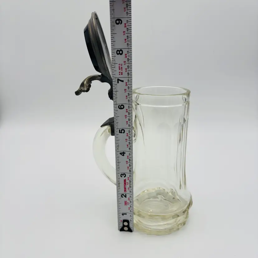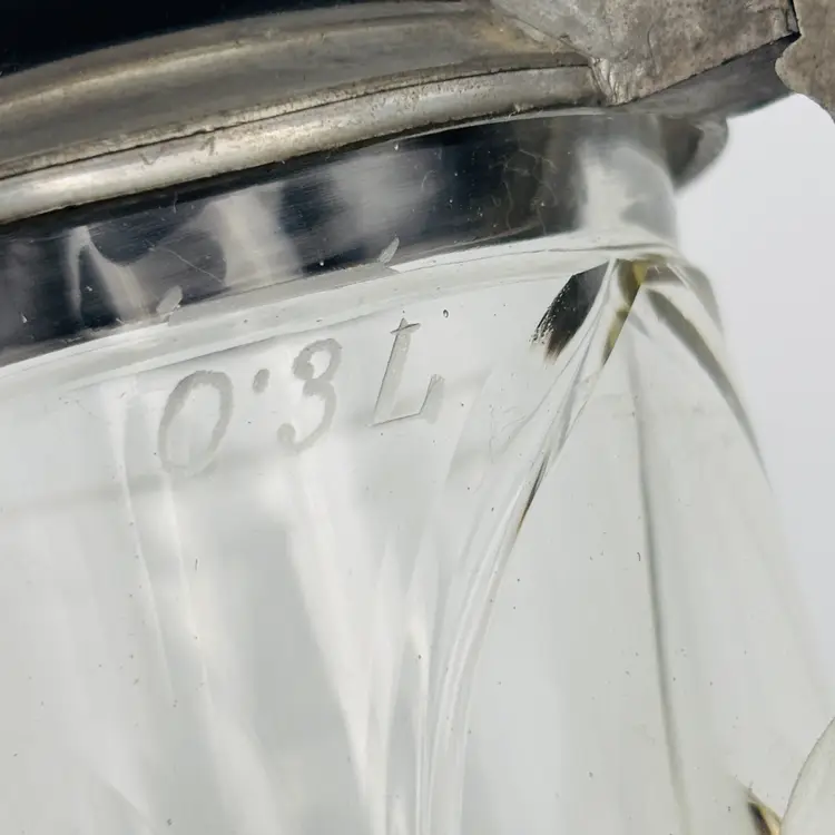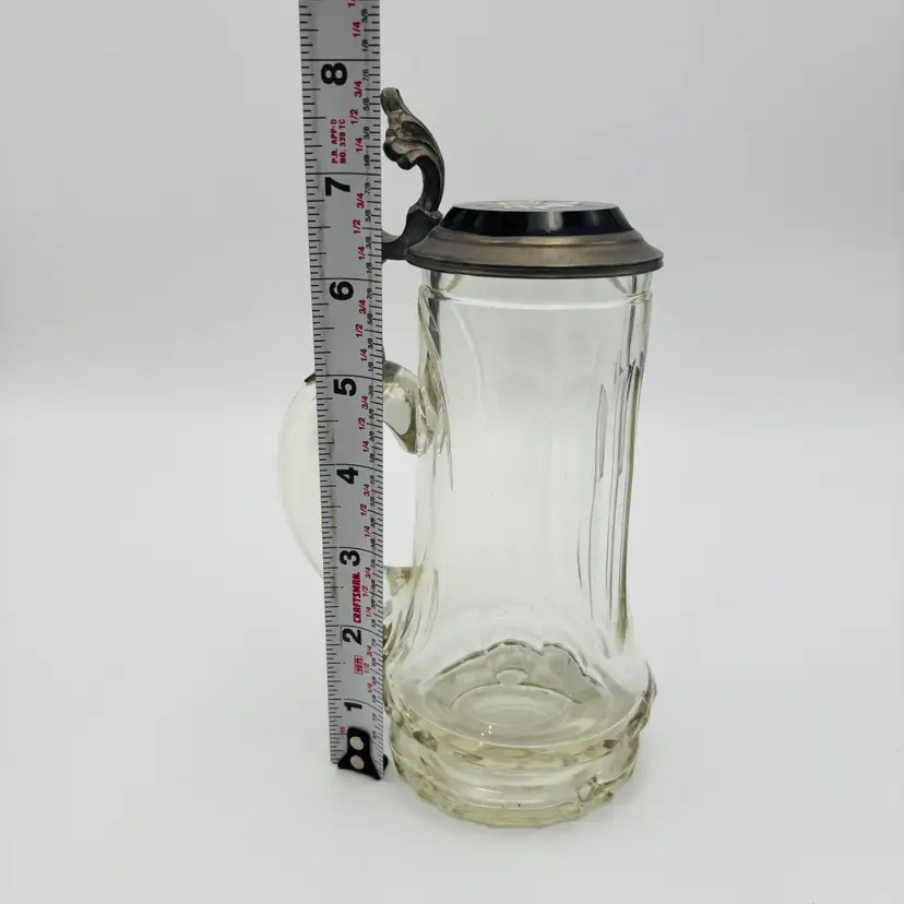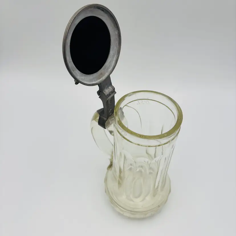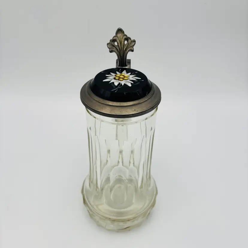 Features: The lid is pewter with an amethyst glass insert handpainted with Edelweiss flower. It is cut glass with an etching of "0.3L".