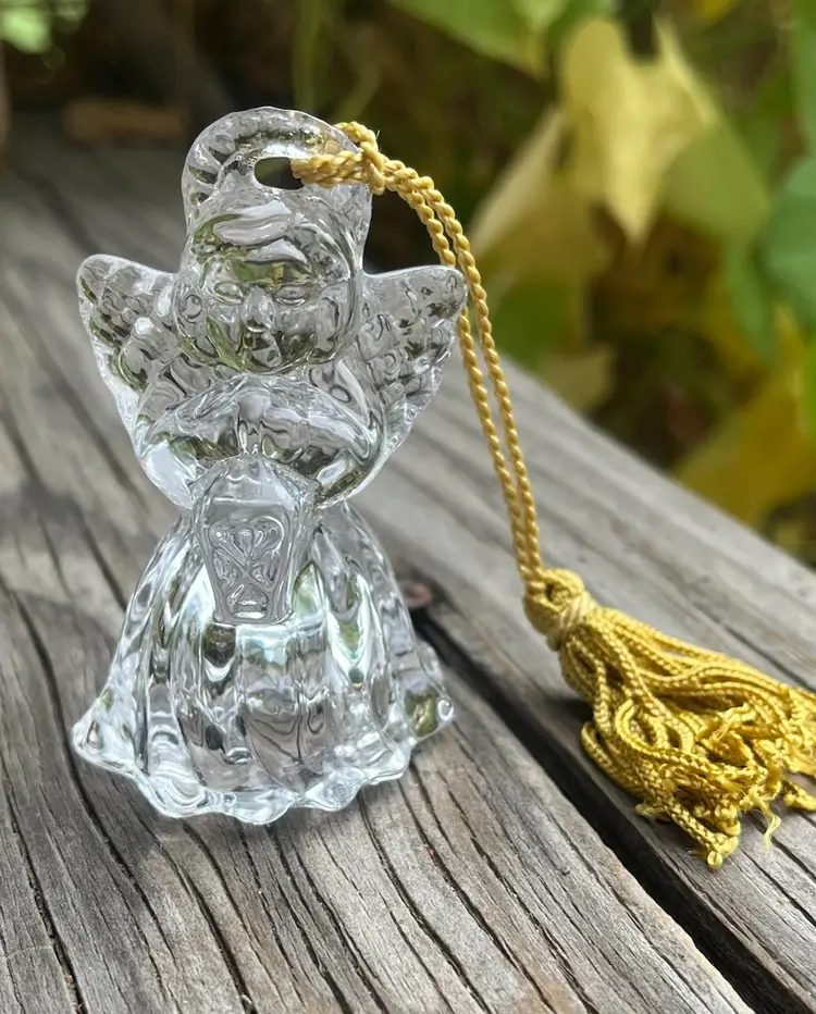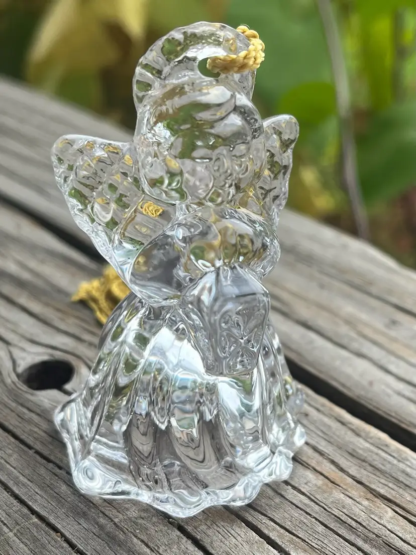 A German Gorham made lead crystal angel. She is approximately 2 3/4 inches tall and 1 3/4 inches wide. She can be used as a Christmas tree ornament or remove the gold cord and use as a display. No nics and such.