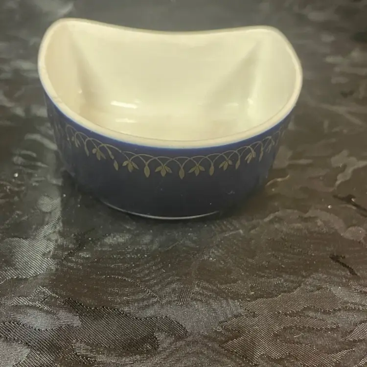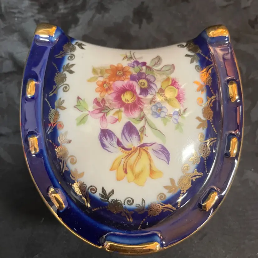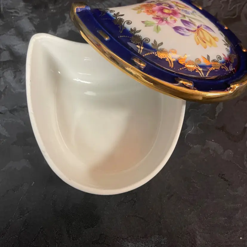 Cobalt blue horseshoe shaped trinket box on cobalt blue base with gold detailing. Measurements: 3.5” wide x 3.5” long x 1.5” high