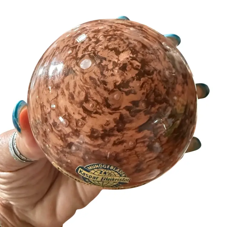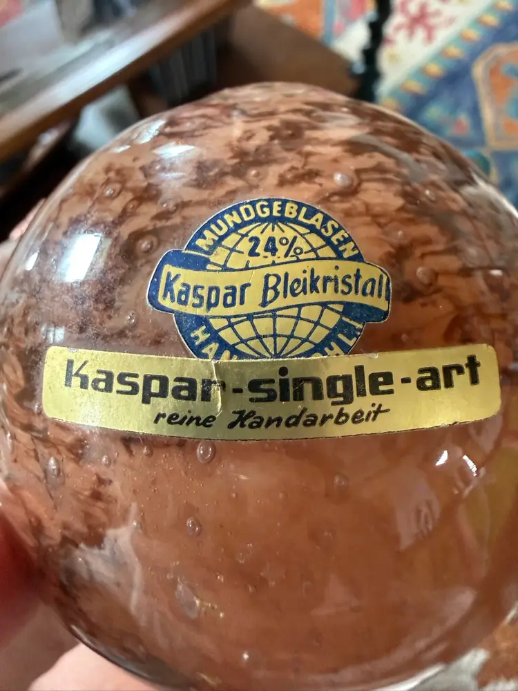 Manufacturer: Kaspar Bleikristall, a German brand known for its high-quality lead crystal products. Material: The labels indicate it is 24% lead crystal (Bleikristall). Craftsmanship: It is "Mundgeblasen" (mouth-blown) and "reine Handarbeit" (pure handwork), signifying it was individually handcrafted rather than mass-produced in a mold. Series: It belongs to the "Kaspar-single-art" collection, which often features unique, artistic glass pieces like this decorative paperweight. These items were popular mid-century decorative collectibles and are often sought after today as vintage German glass art.