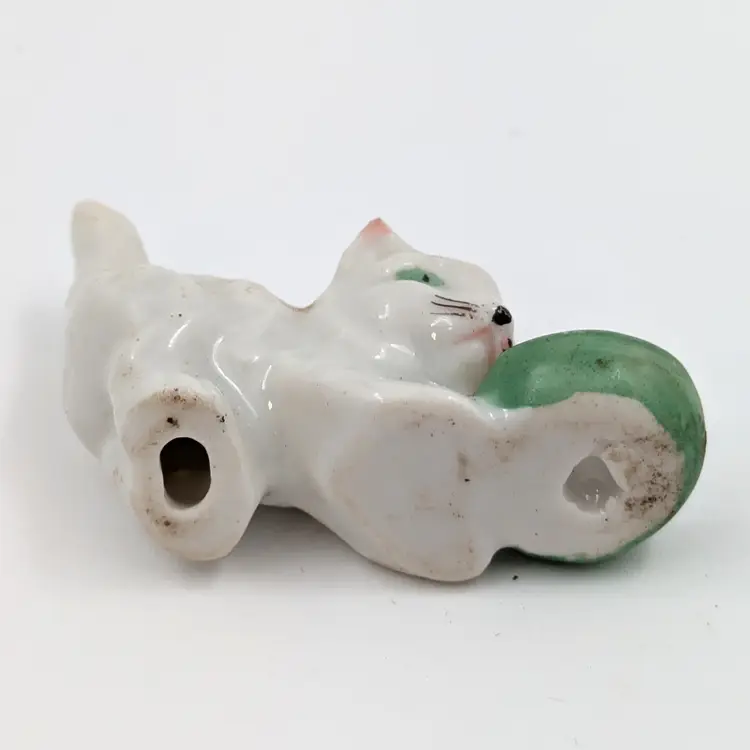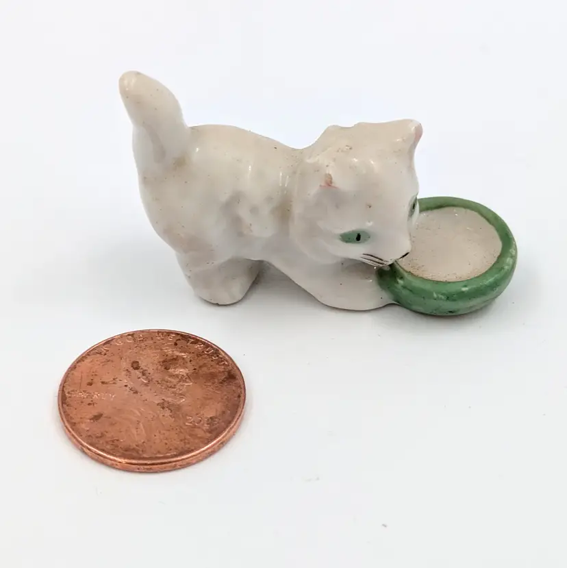 Adorable vintage ceramic figurine of a playful kitten with a green dish. Perfect for cat lovers and collectors of whimsical animal figures. No chips or cracks, just a bit of dust.