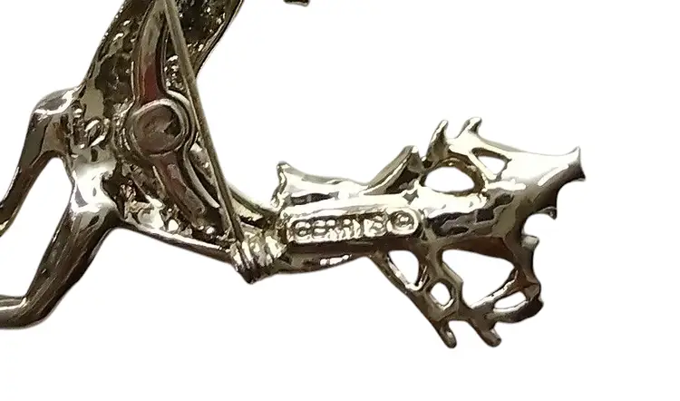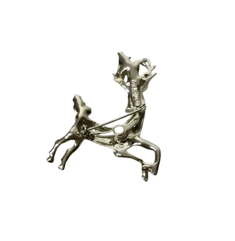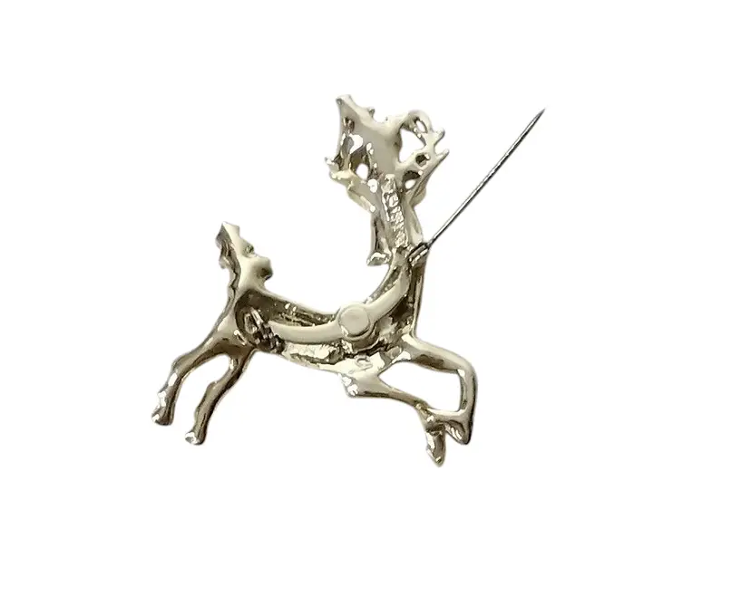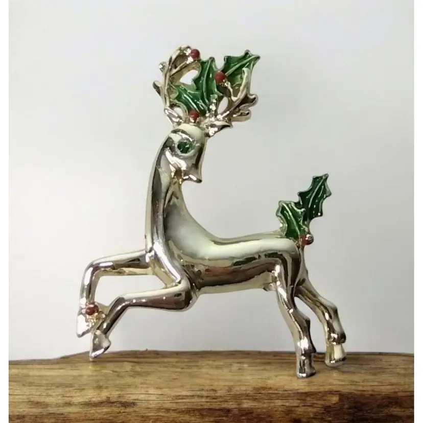 Item is pre-owned and in very good condition with no major flaws. Smoke free environment. This is a beautiful gold tone brooch of a reindeer with Holly leaves and a green rhinestone eye. Brooch measures 1.75" long x 2.25" tall.