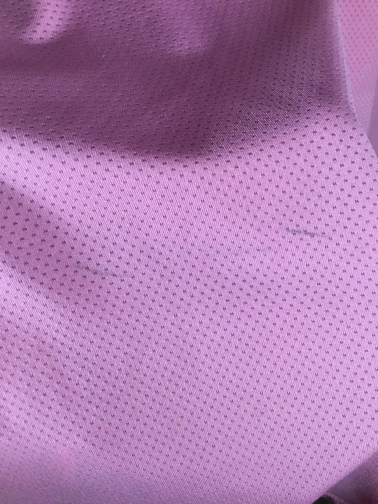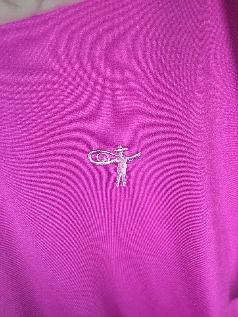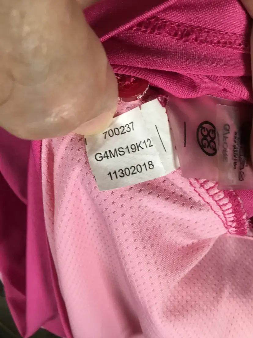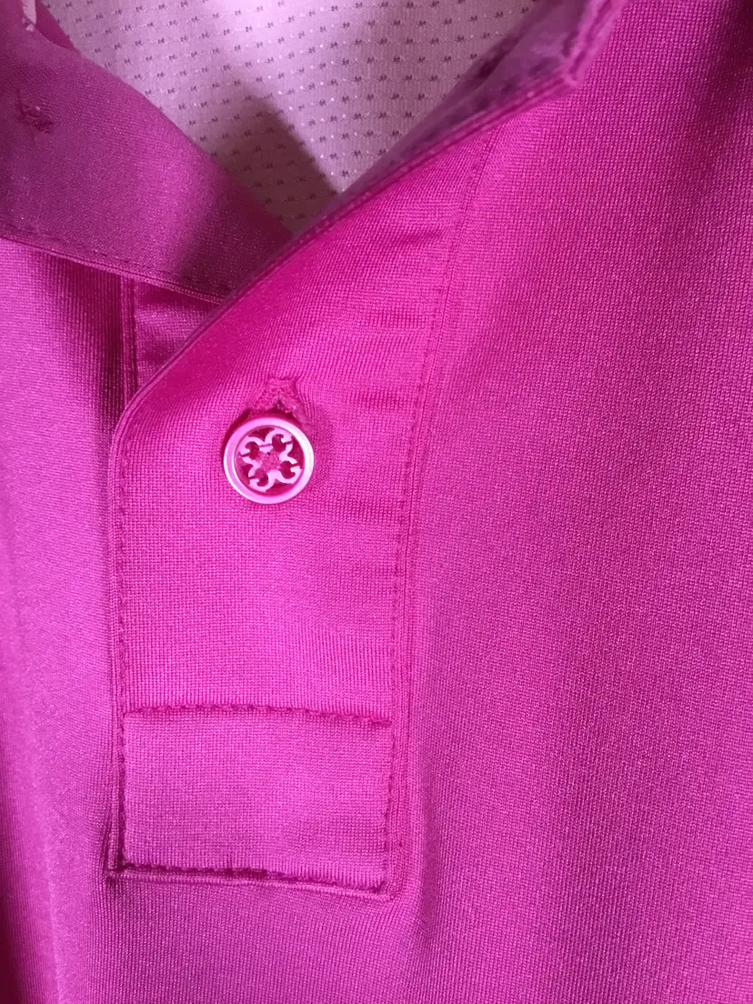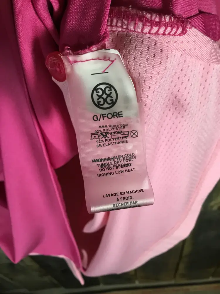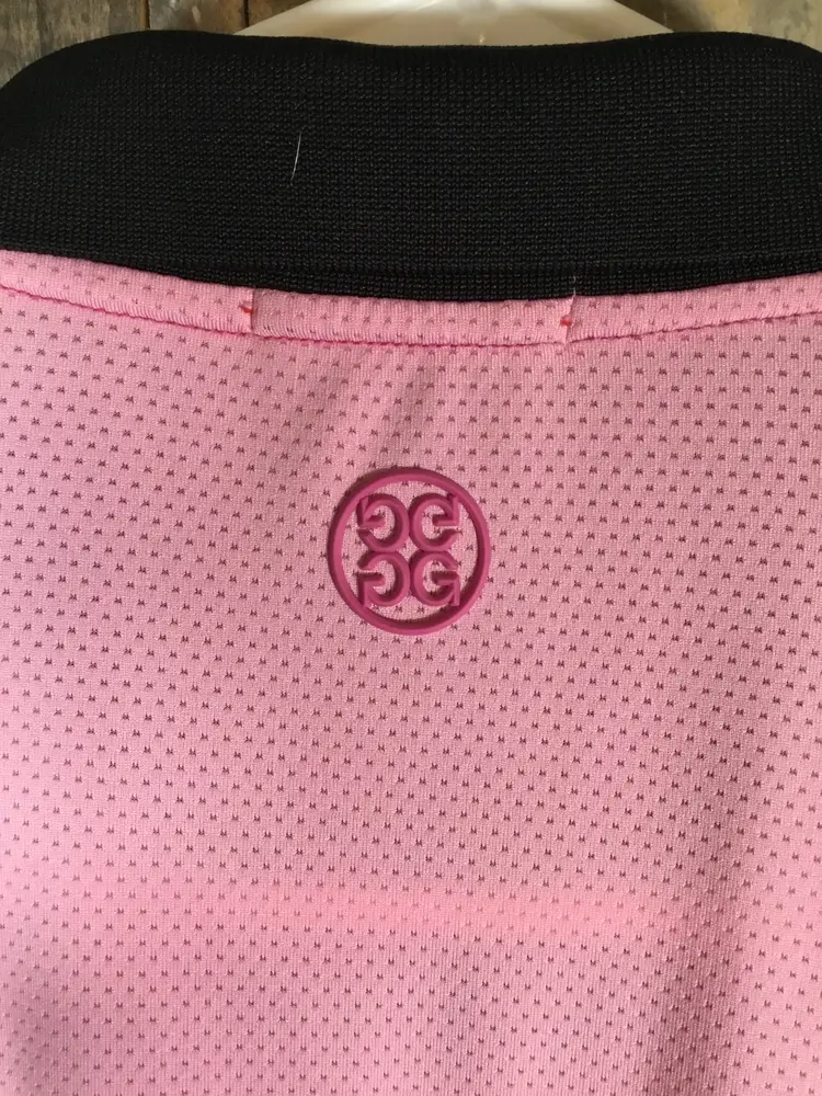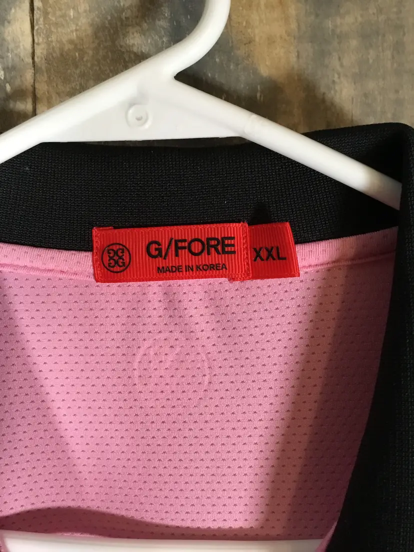 G/Fore polo shirt Mens XXL Bright pink on front, lighter pink on back with black collar Entire back panel is vented material, very lightweight shirt for summer Polyester and spandex fabric Unknown logo embroidered on left chest A couple of stains on back that probably won’t be noticeable when tucked in
