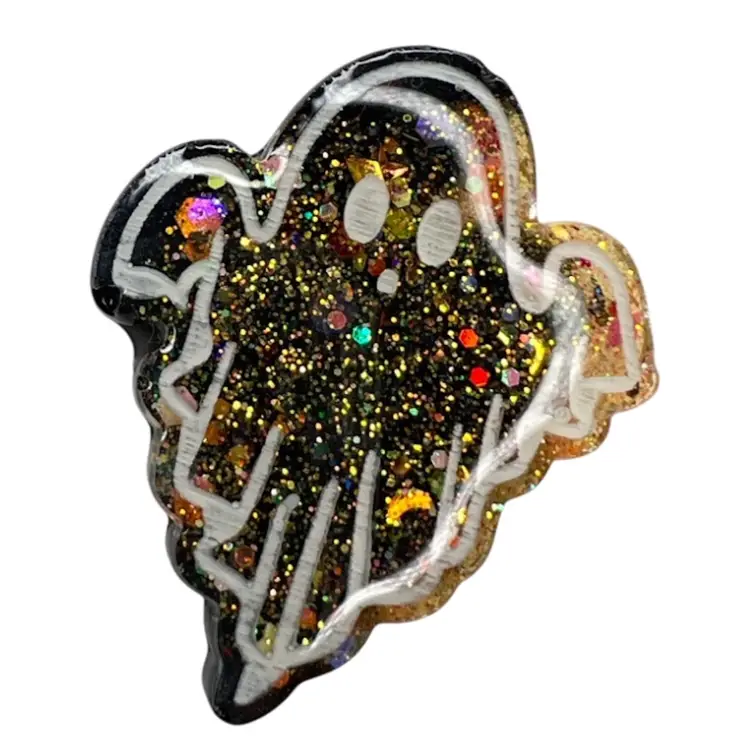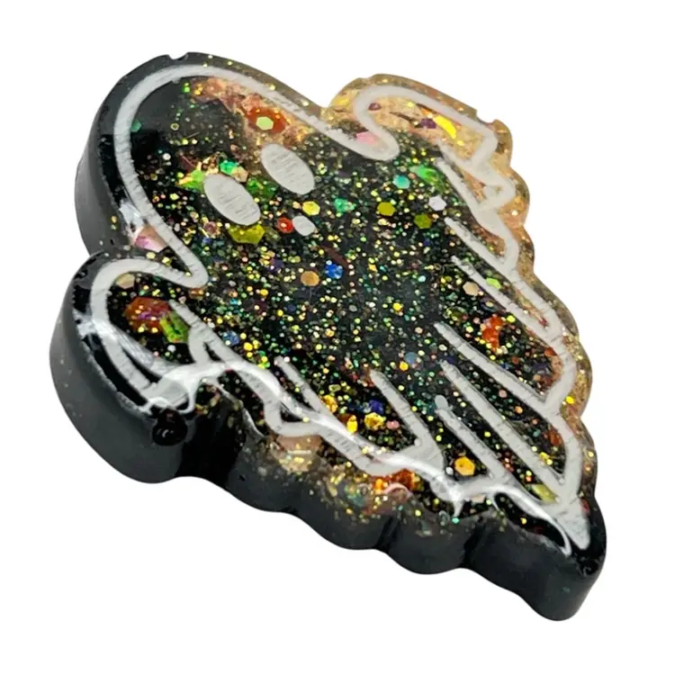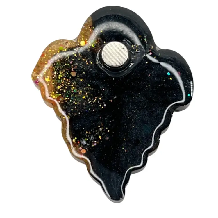 Handmade and hand-painted by me 🫶 Ghost Halloween Resin Magnet. Black & Orange Glitters. Strong neodymium magnet. 1-5/8" length x 1-1/2” wide x 1/4” depth
