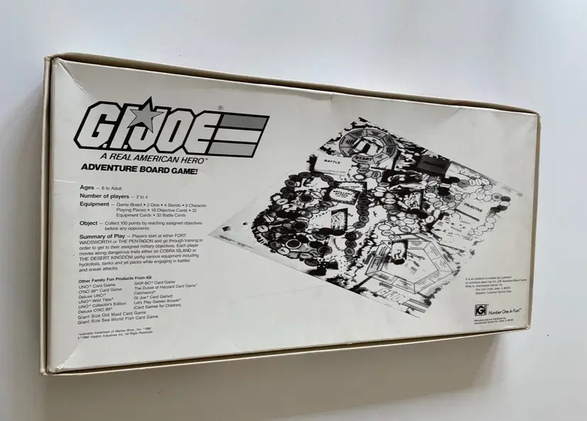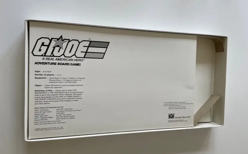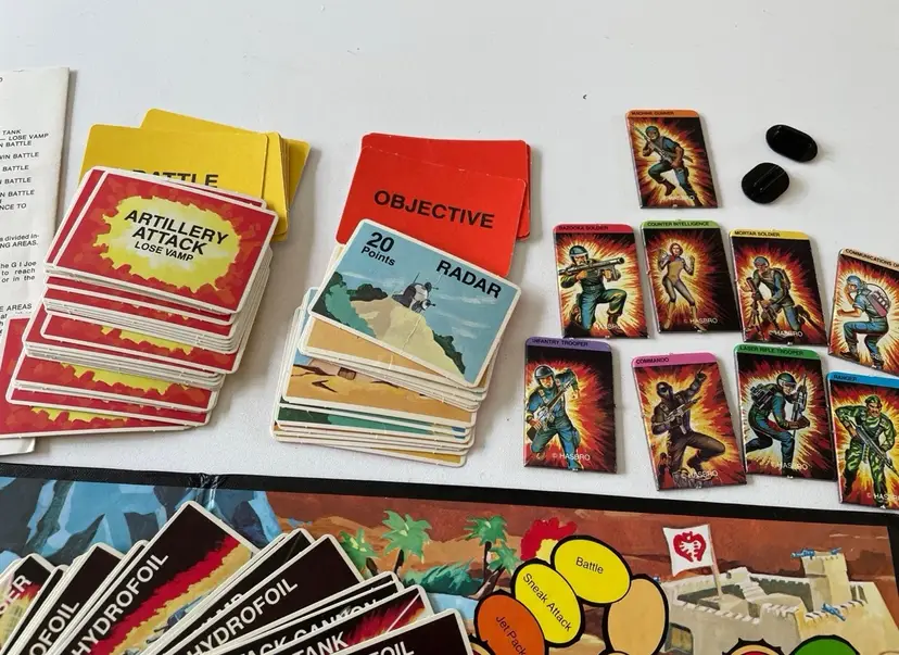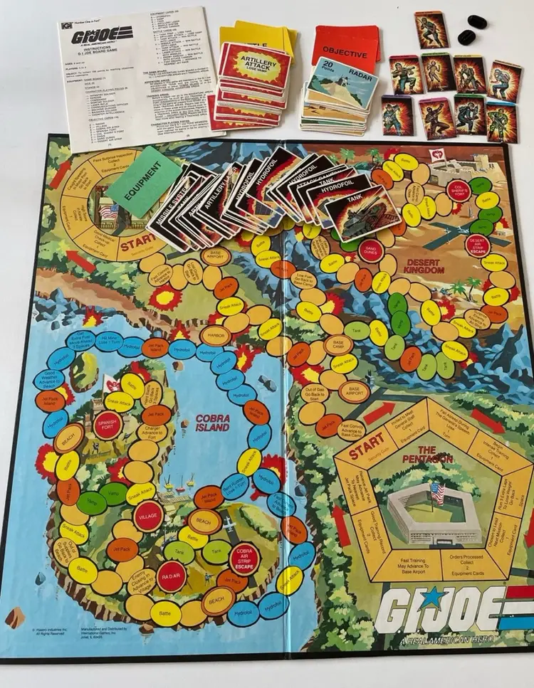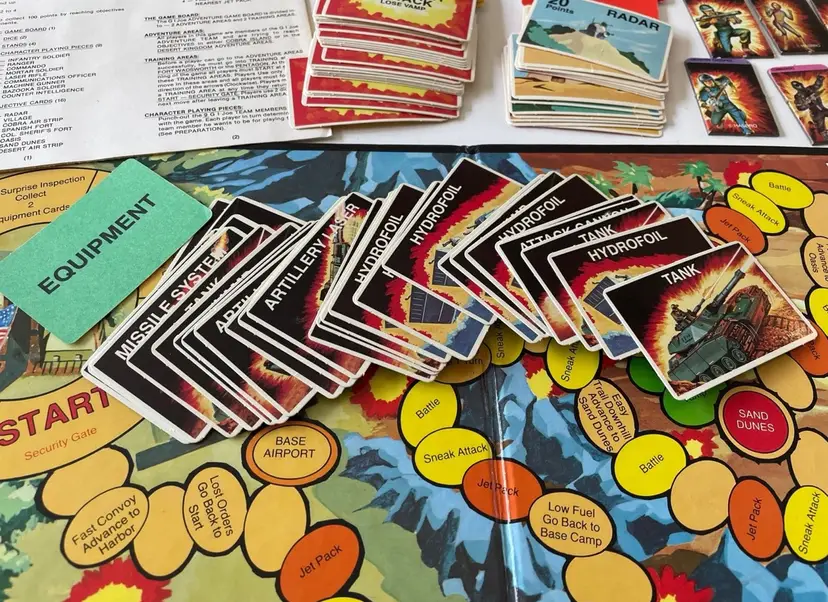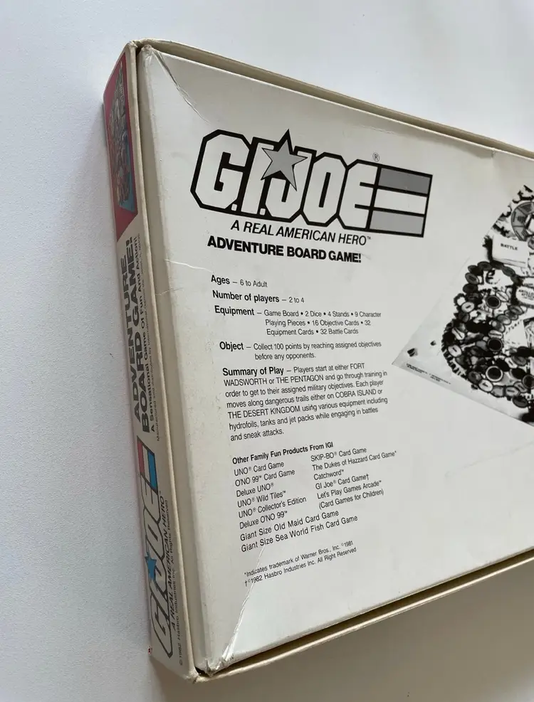 GI JOE ARAH 1982 ADVENTURE BOARD GAME by IGI NEAR COMPLETE. Game is in great condition for age. MISSING- 1 Equipment card, 2 Character bases and 2 dice. Minor wear as seen. Comes as seen in pictures.