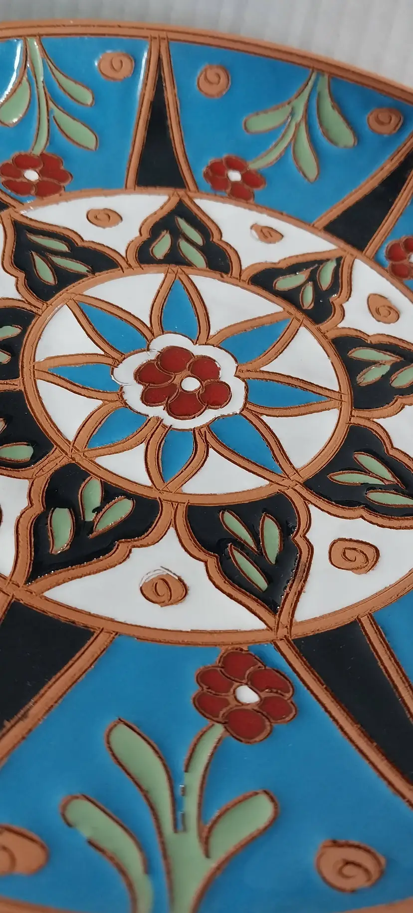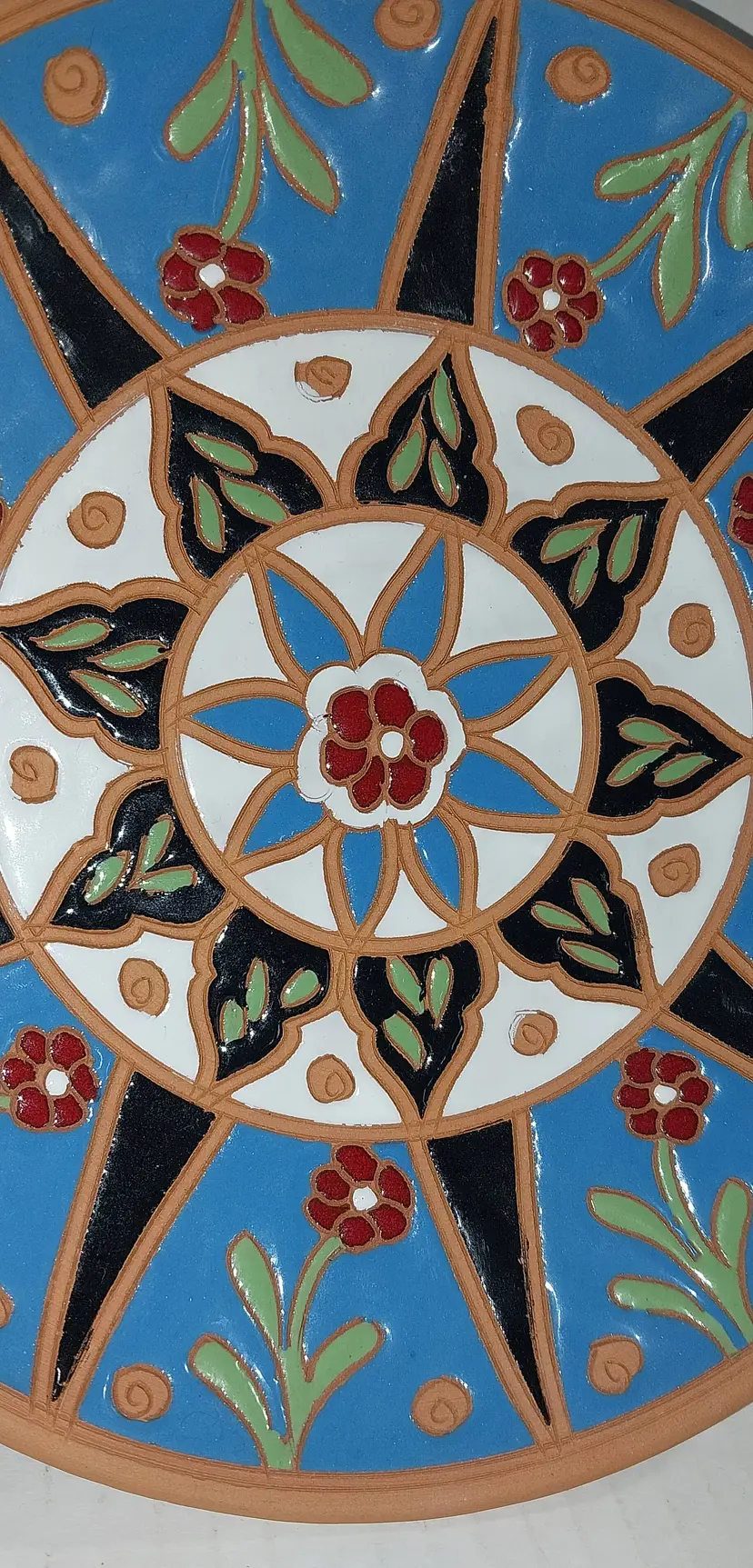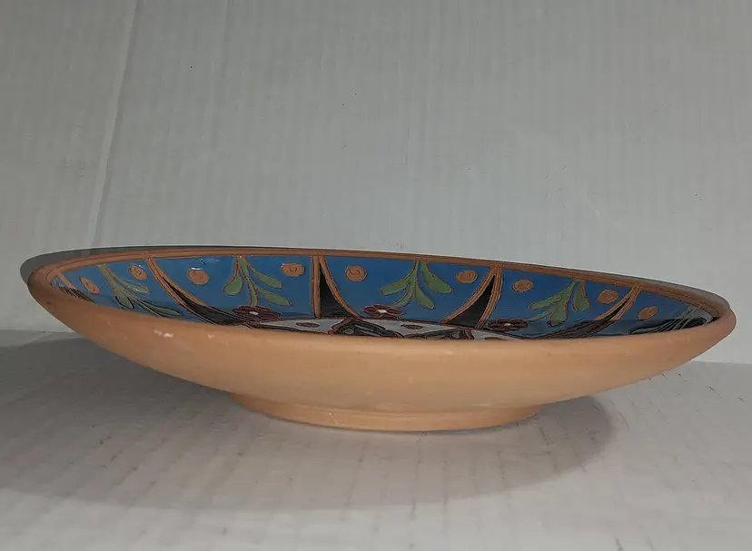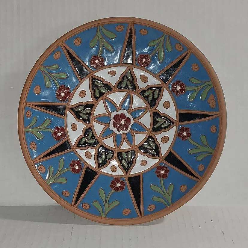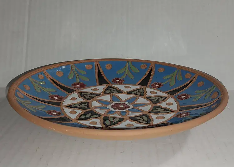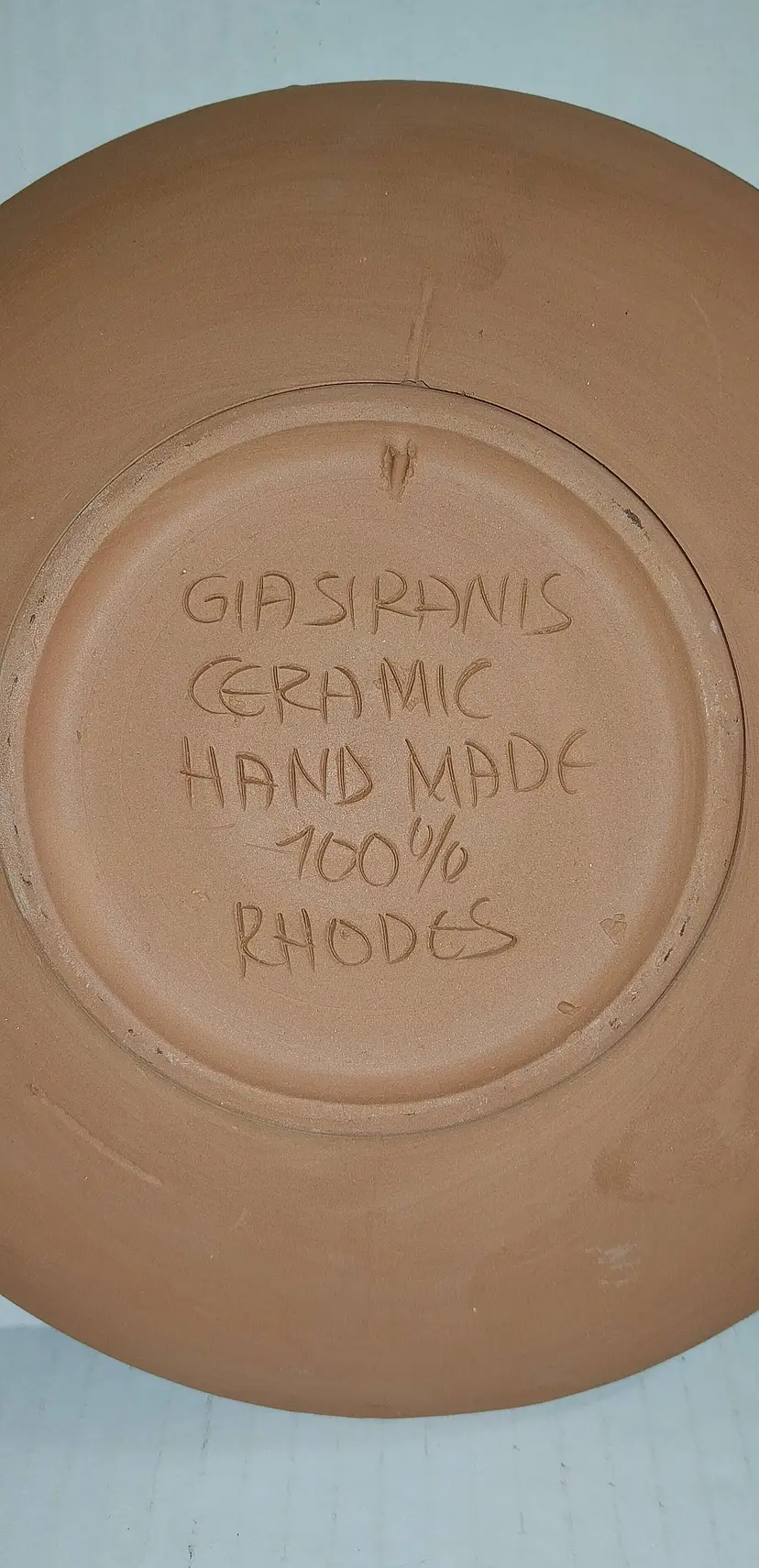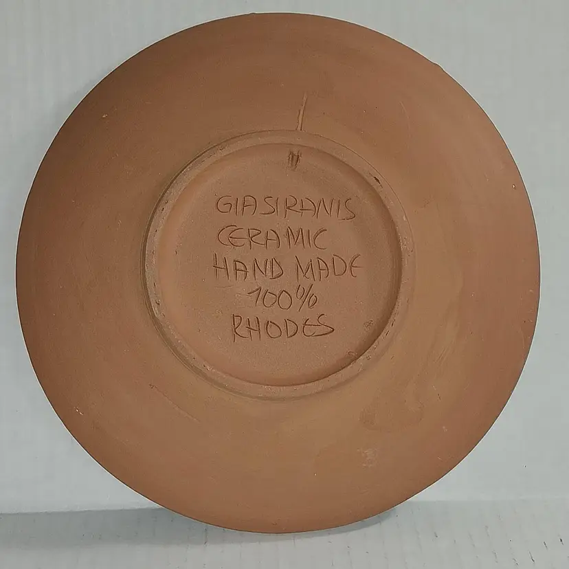 100% Handmade Rhodes Enamel on Clay Terracotta Plate. This is a gorgeous, vintage, handmade terracotta plate with, originating from Rhodes, Greece, by artist Gia Siranis. It is beautifully hand-enamel on clay and features a multicolor design, making it a one-of-a-kind piece.