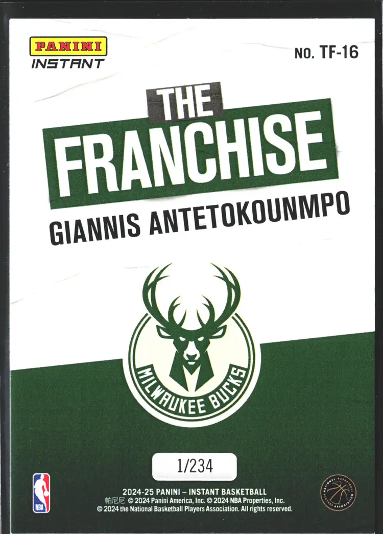1st time buyer? Get $5 Off with code DISTRICT5 at checkout! Card as shown. All cards $20 and under ship PWE via lettertrackpro [https://www.letter-track.com/registerap.asp?AFID=8757] Manufacturer: Panini Team: Milwaukee Bucks Player/Athlete: Giannis Antetokounmpo Sport: Basketball Type: Sports Trading Card Season: 2024-25 League: National Basketball Association (NBA) Set: 2024-25 Panini Instant NBA Features: Limited Edition, Short Print, Exclusive Parallel/Variety: Limited Autographed: No Card Condition: Near Mint or Better Material: Card Stock Original/Licensed Reprint: Original Vintage: No Graded: No Country/Region of Manufacture: United States