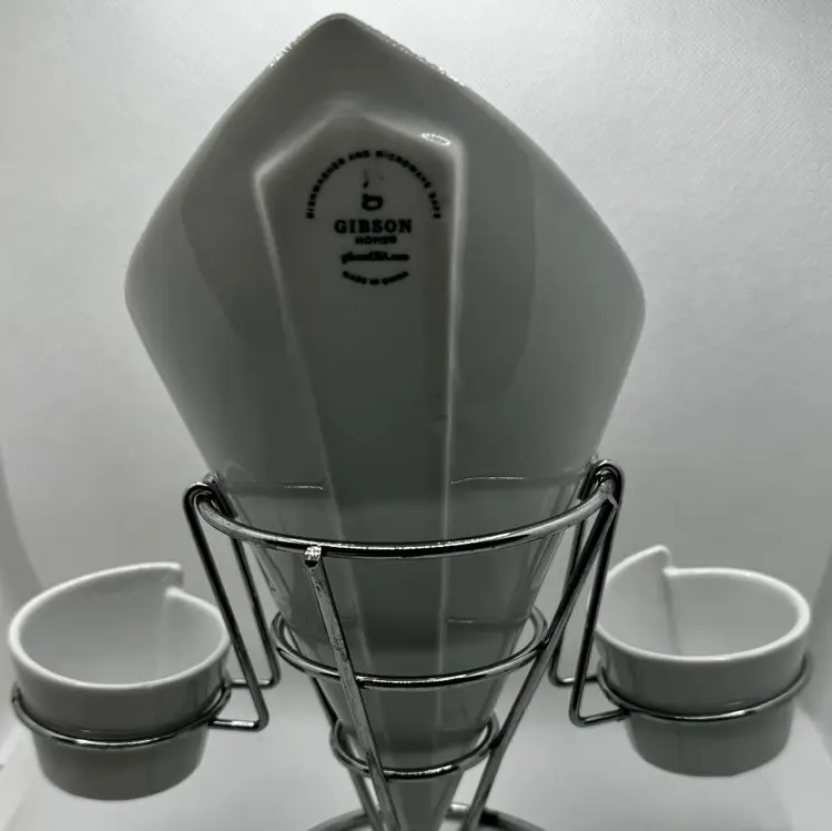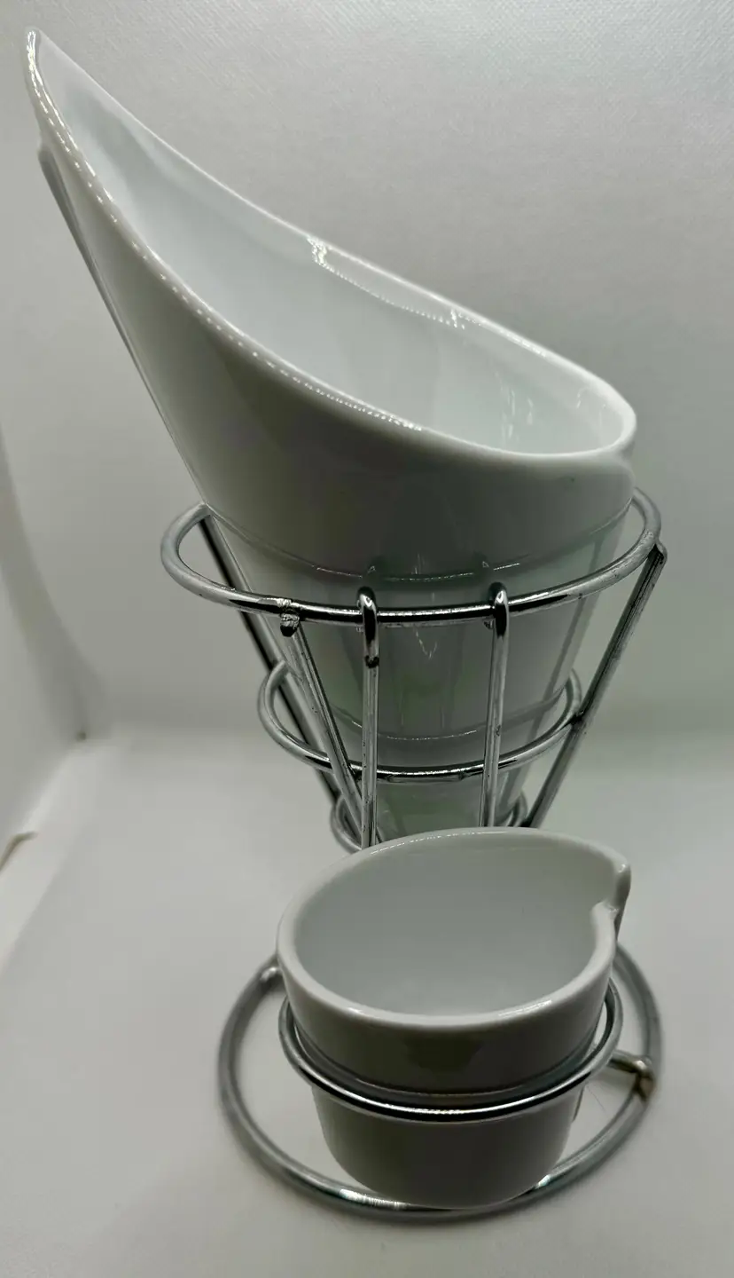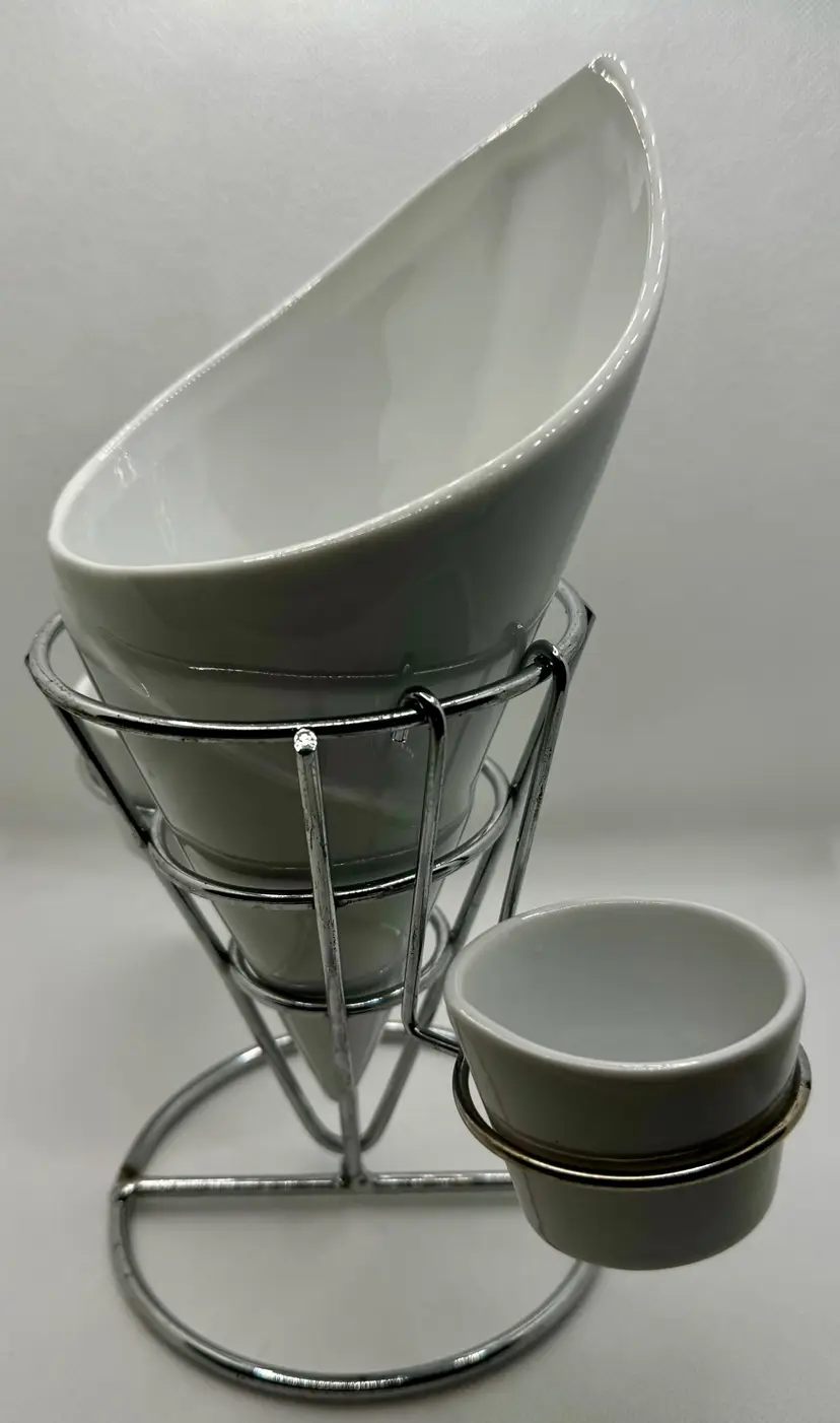 This unique vintage ceramic cone serving set comes with a sturdy metal stand and two smaller side dishes. Perfect for serving snacks, dips, or condiments at your next gathering. The sleek white ceramic and chrome stand add a touch of retro charm to any table setting. Excellent condition with no chips or cracks. Measures 7.5x9.25x4.5 inches. Weighs 2lbs.