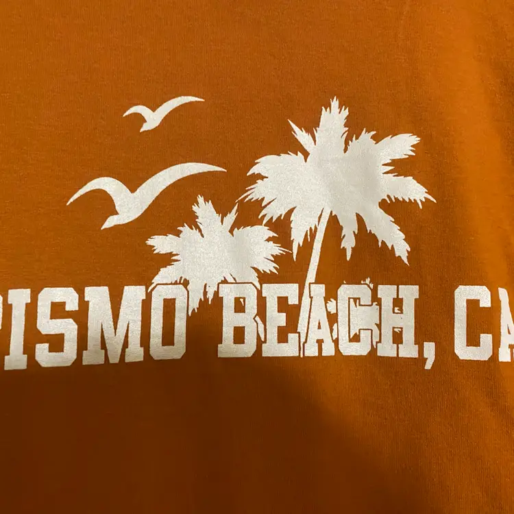 You are purchasing one Men's Size Large Orange & White Pismo Beach, CA Short Sleeve T-Shirt by Gildan. This T-Shirt is in great condition with no rips, stains or holes.