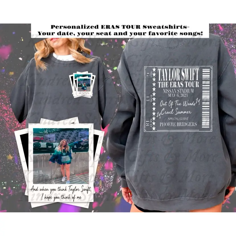 ⭐️Introducing our custom ERAS ticket sweatshirts-add your photo (choose the caption!) for the front design and your tour date, city, 2 fav songs from the night and your seat, for the back!