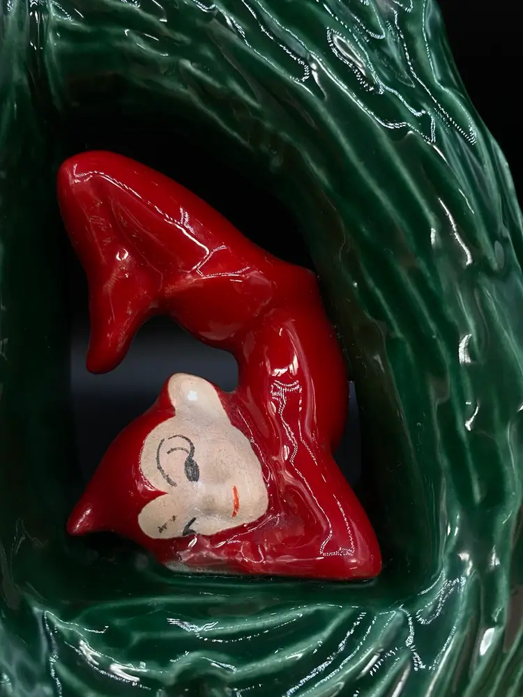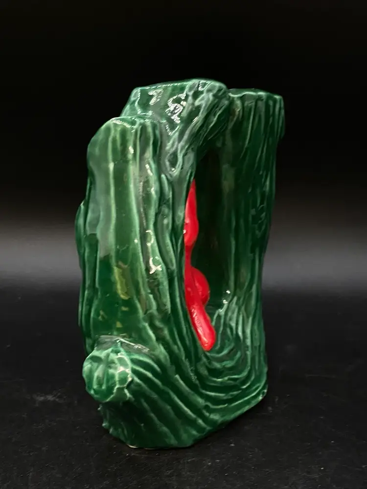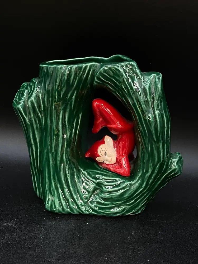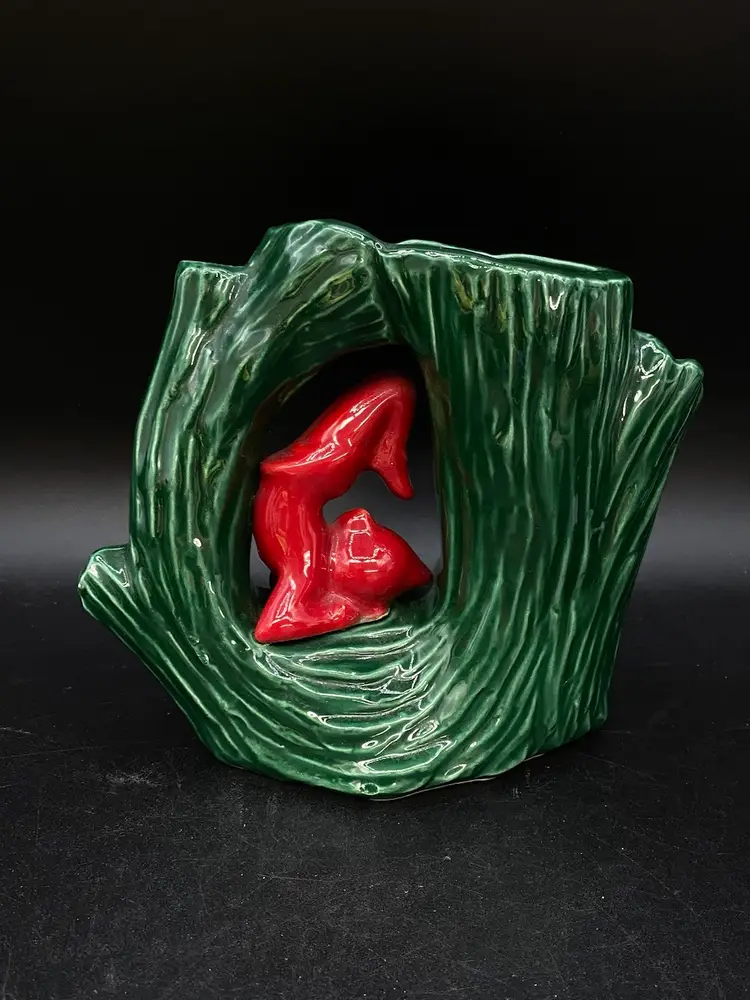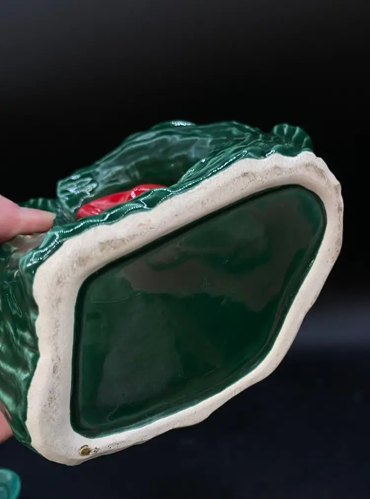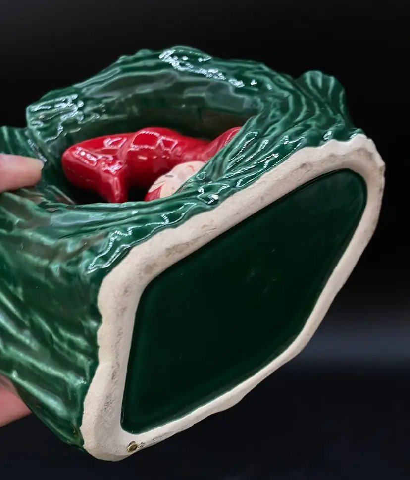 Gilner California Red Pixie Elf Tumbling Green Tree Large 5 3/4” Stump Planter Vintage. This is the larger planter & 6 1/2” wide.