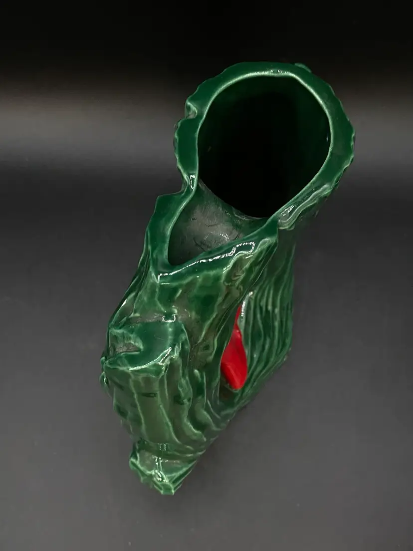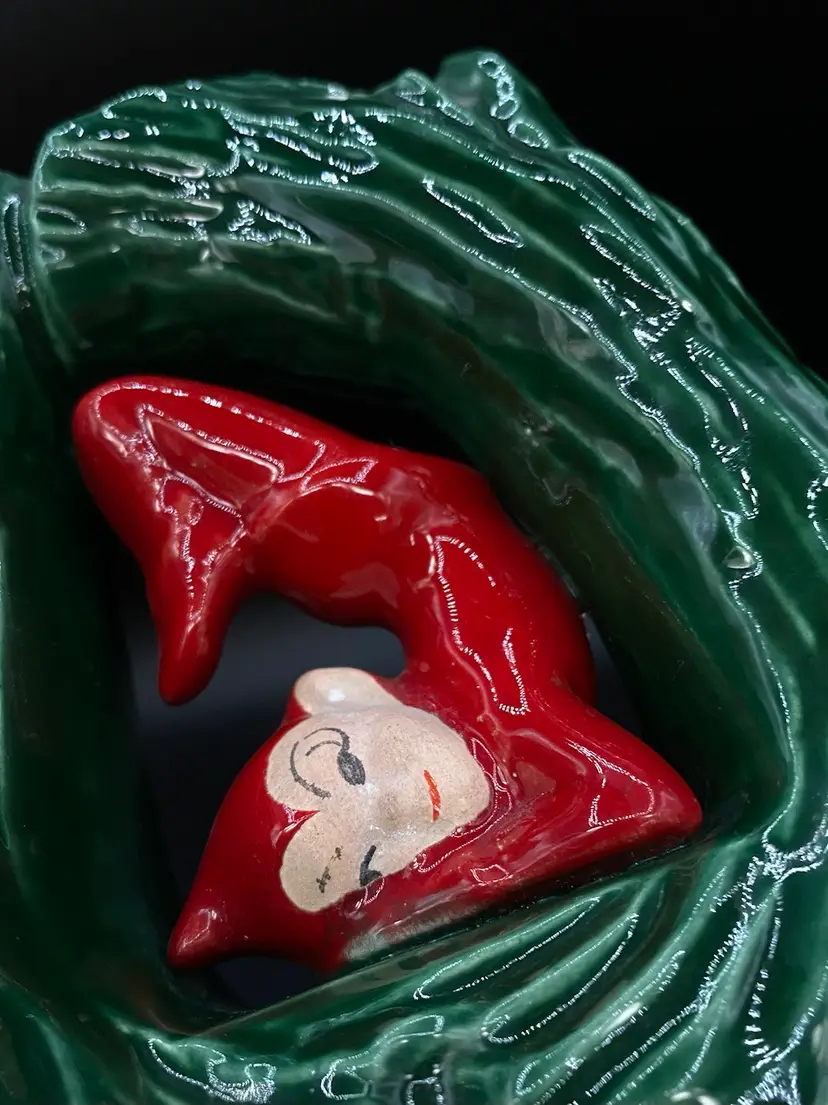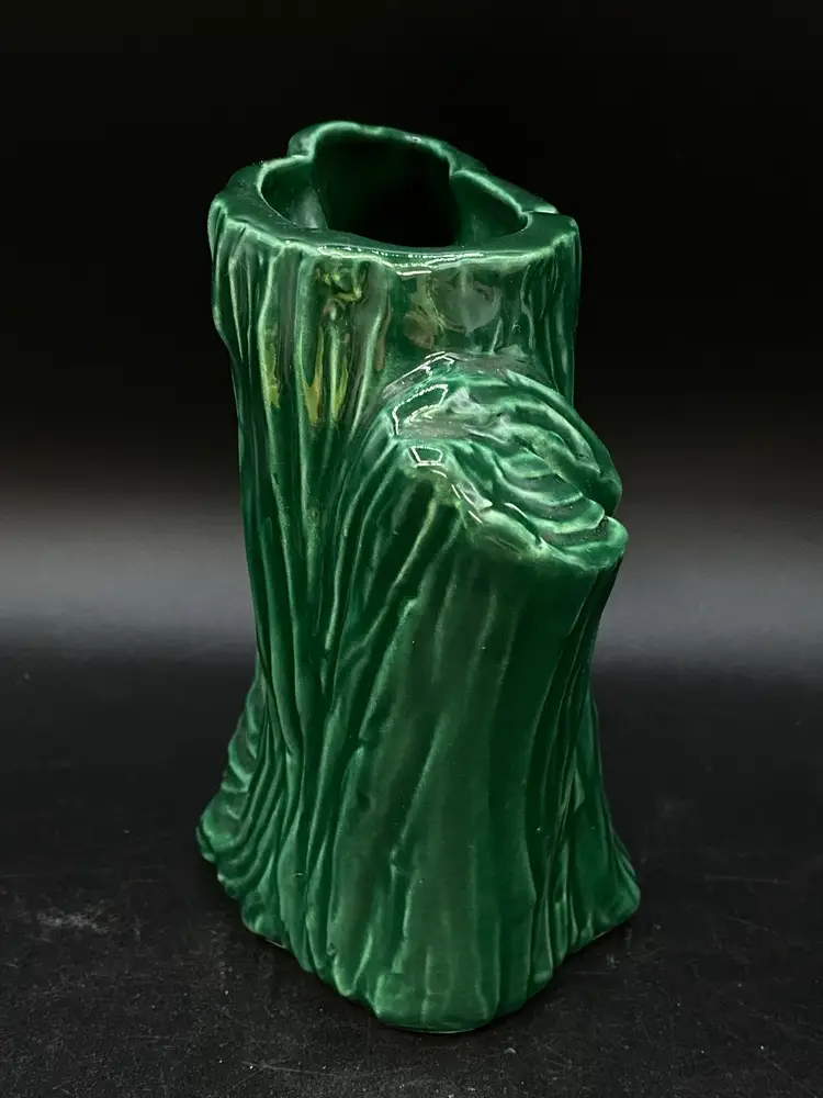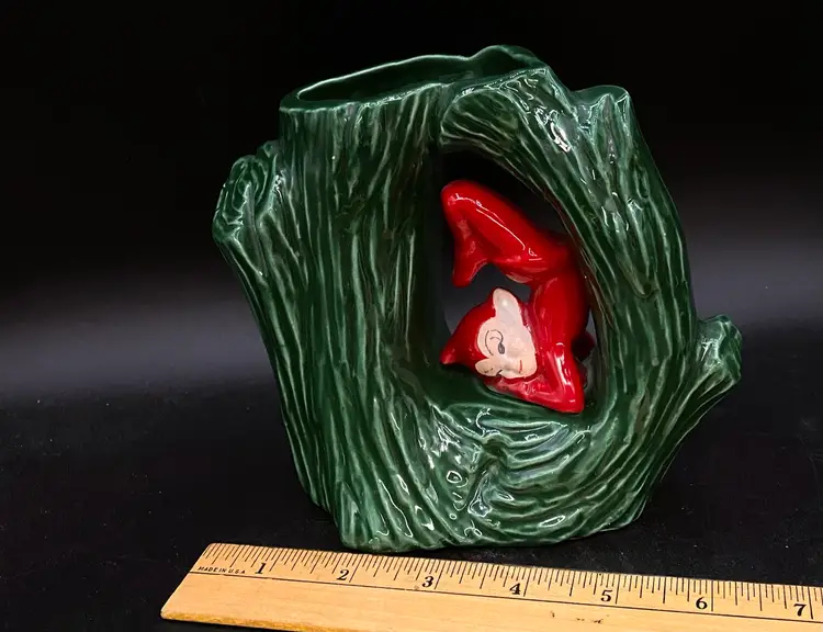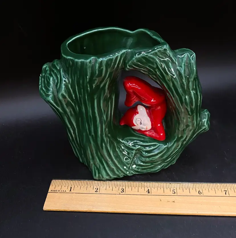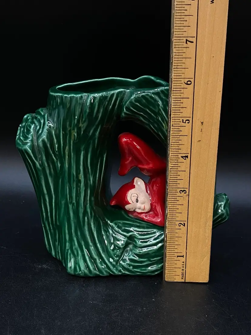 Gilner California Red Pixie Elf Tumbling Green Tree Large 5 3/4” Stump Planter Vintage. This is the larger planter & 6 1/2” wide.