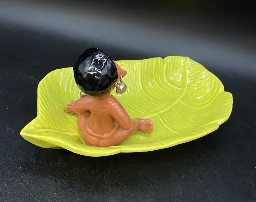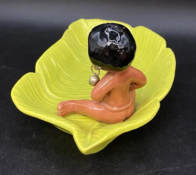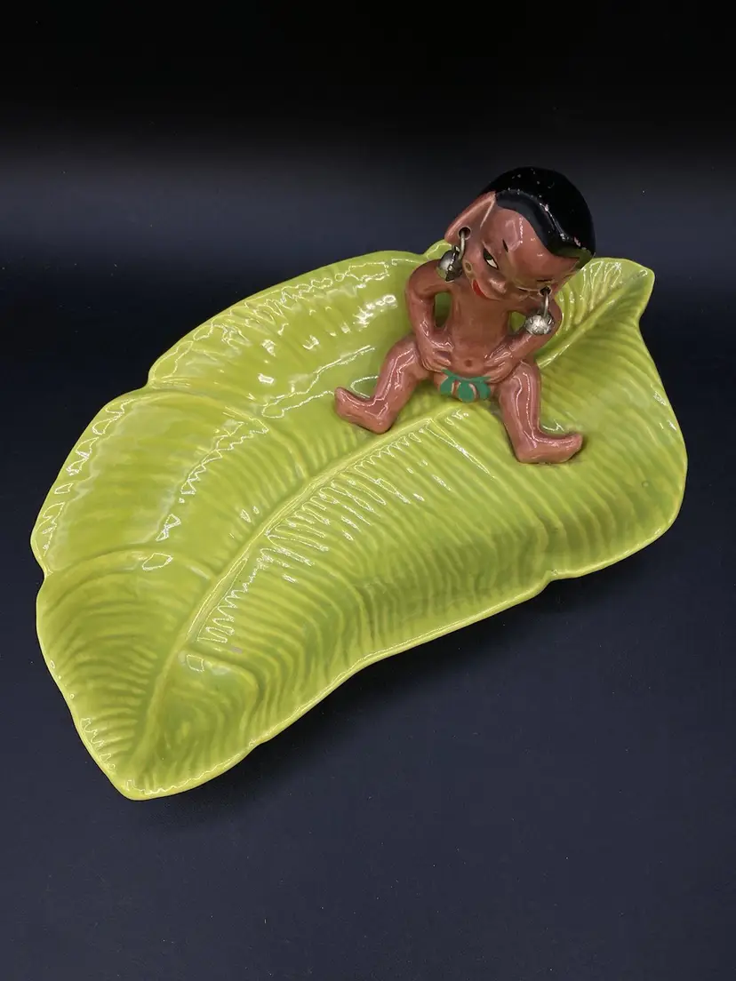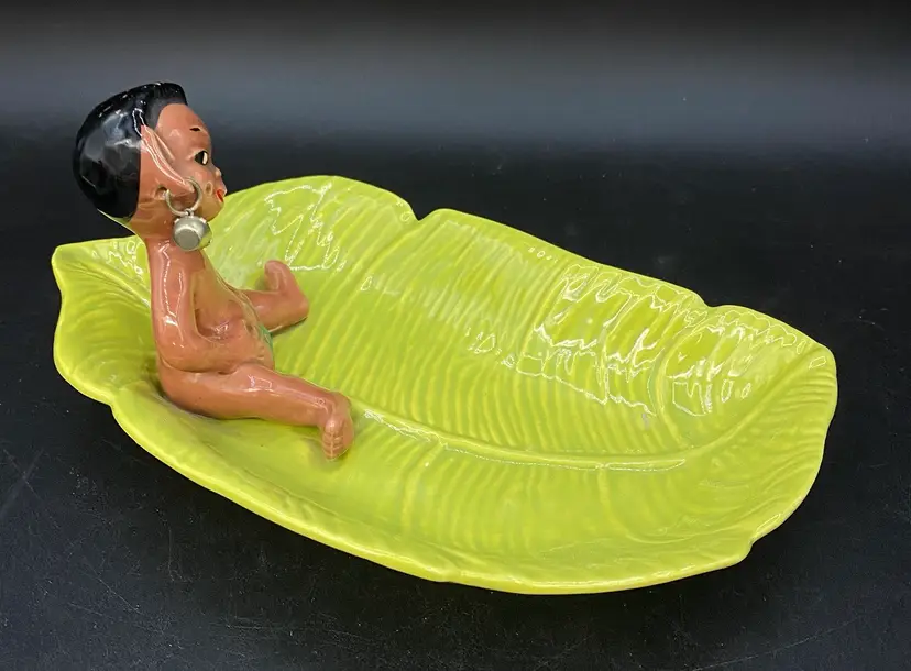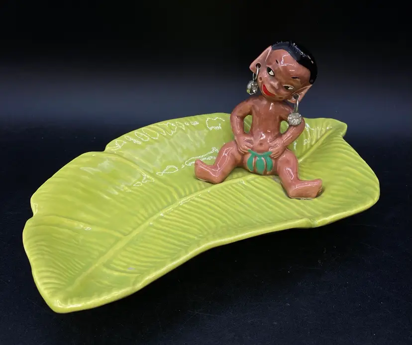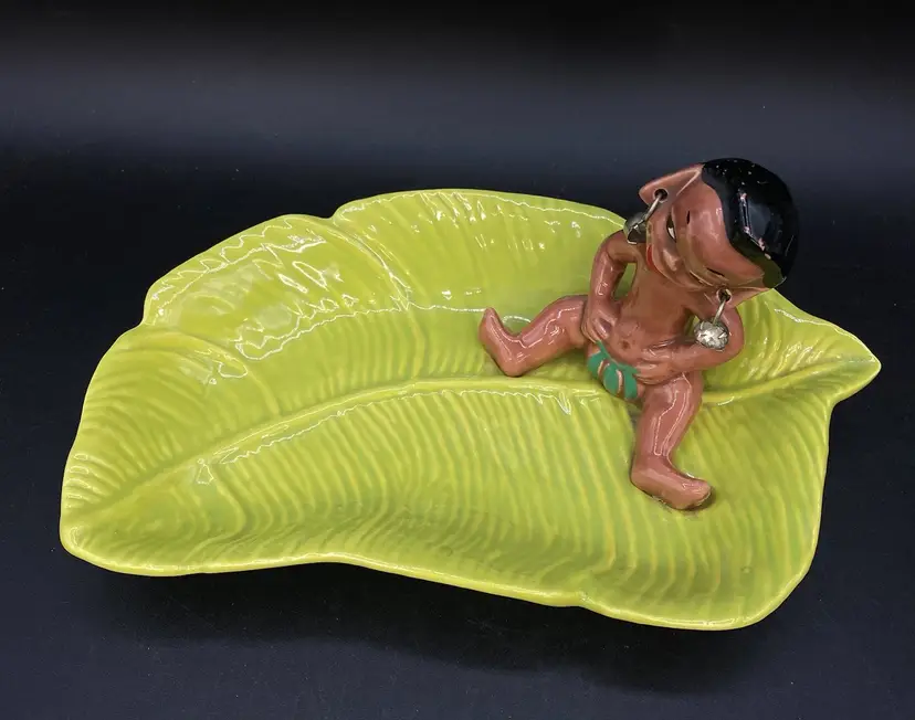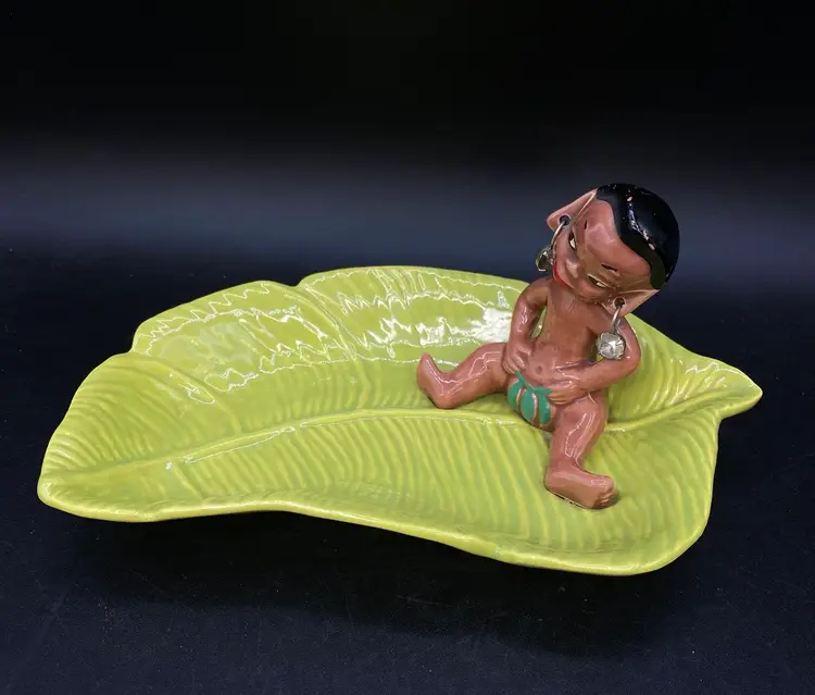 Gilner Pottery Happy Cannibal Native Pixie Elf Dish Banana Leaf. This is a very hard to find dish with it in good condition. It has its earrings as well. He is so cute and has pointed ears like an elf.