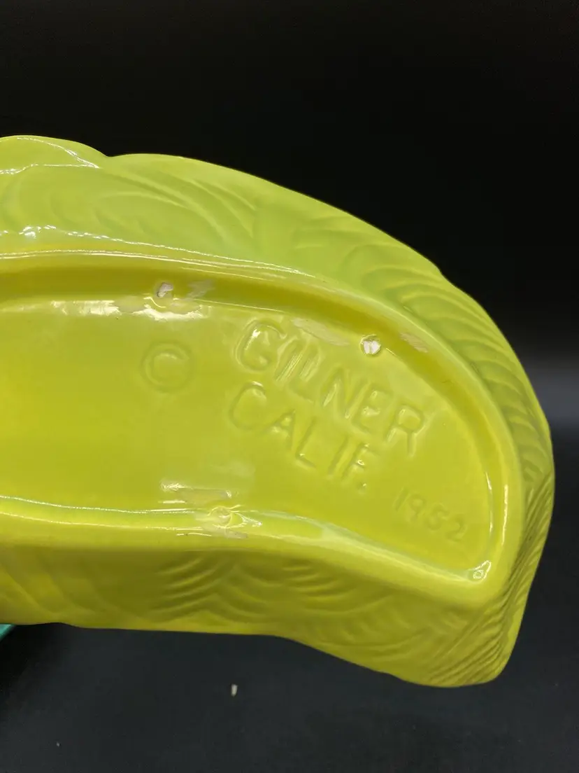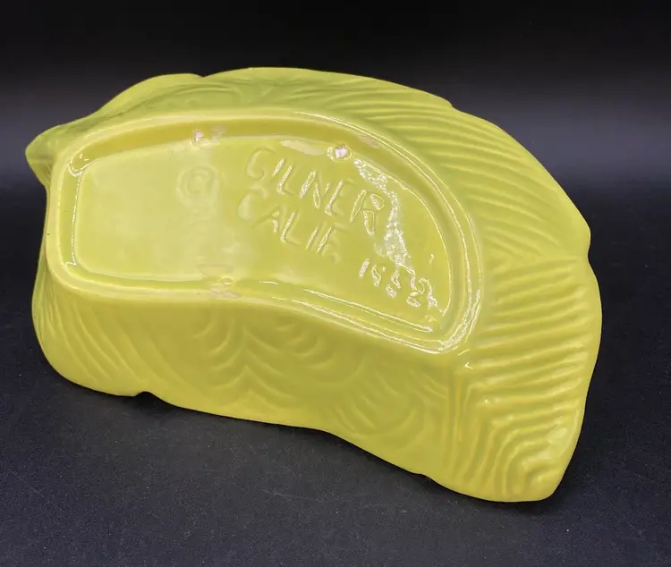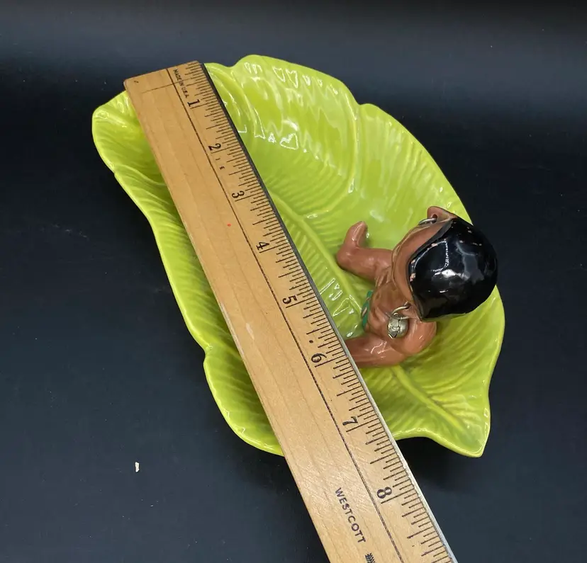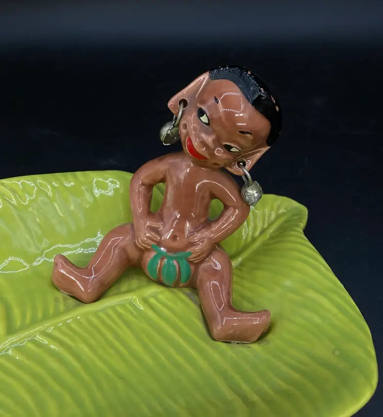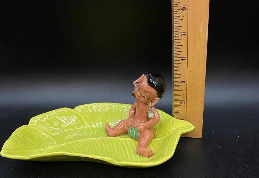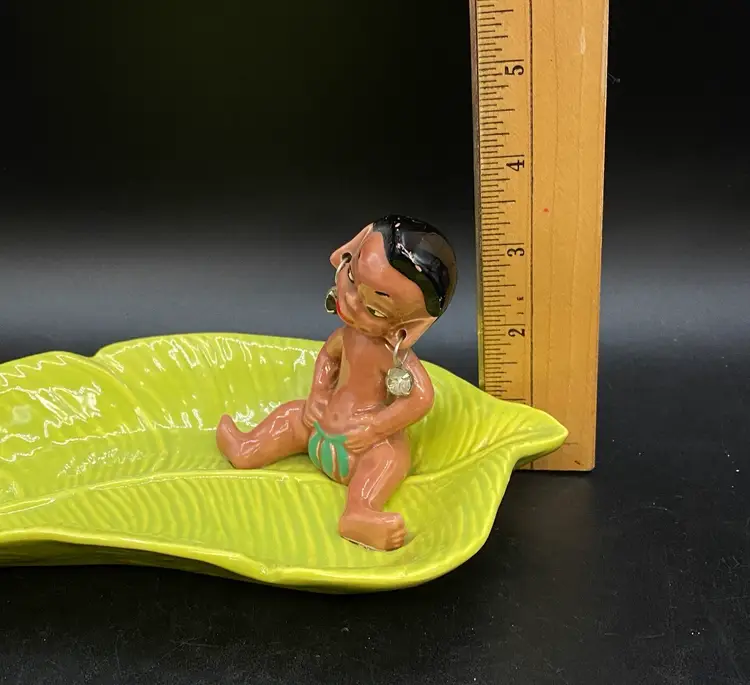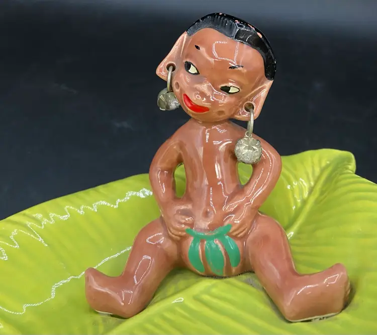 Gilner Pottery Happy Cannibal Native Pixie Elf Dish Banana Leaf. This is a very hard to find dish with it in good condition. It has its earrings as well. He is so cute and has pointed ears like an elf.