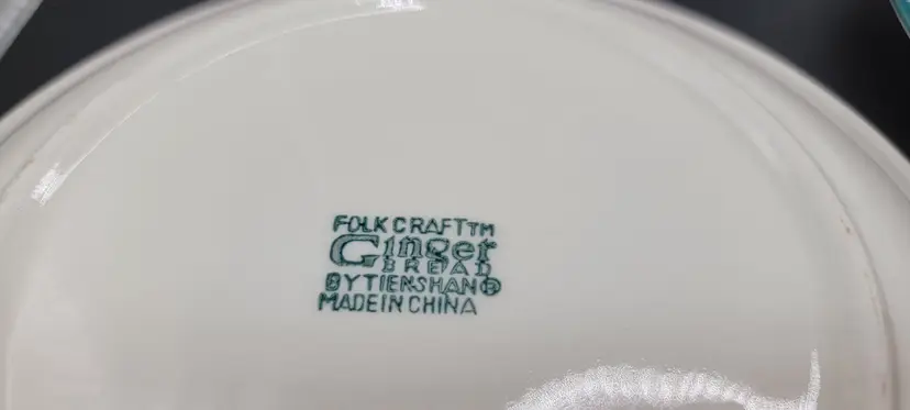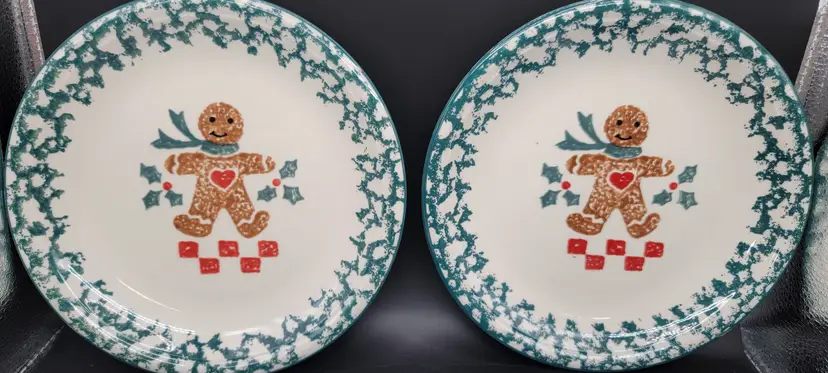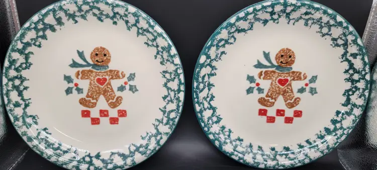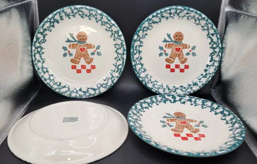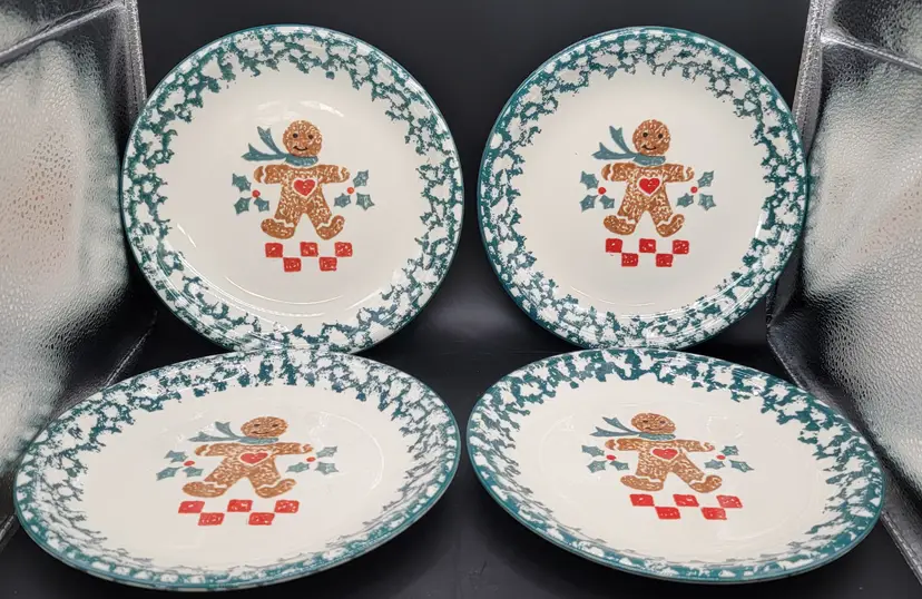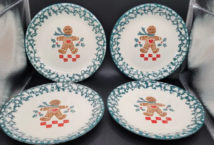 Set of 4 - Gingerbread Folk Craft by Tienshan ceramic dessert/salad plates. These are so cute. Each plate is a 8 inch diameter wide. All plates are in great used vintage condition, NO CHIPS, NO CRACKS. Made in China 1995-2002 gingerbread pattern with green sponge effect edge. Dishwasher Safe, Microwave Safe. Super cute for the holidays, or anytime.