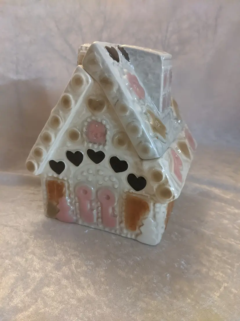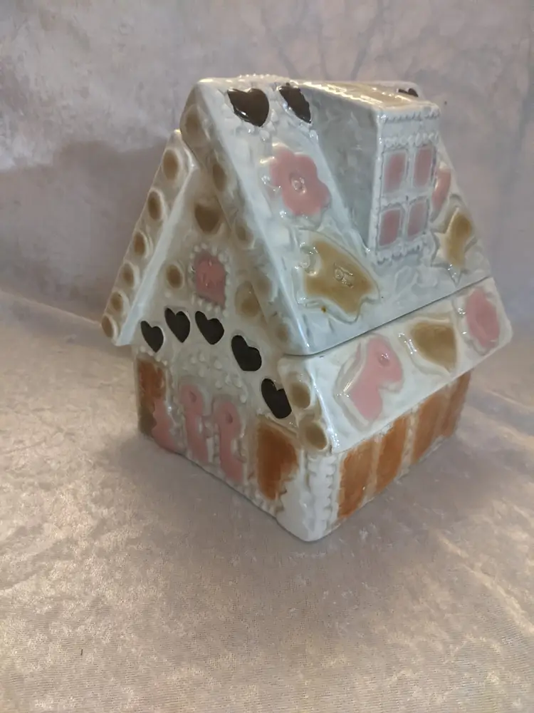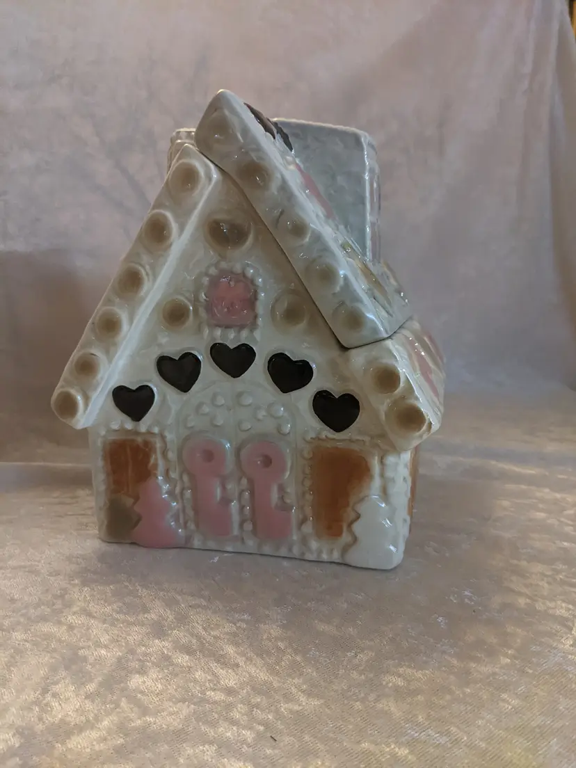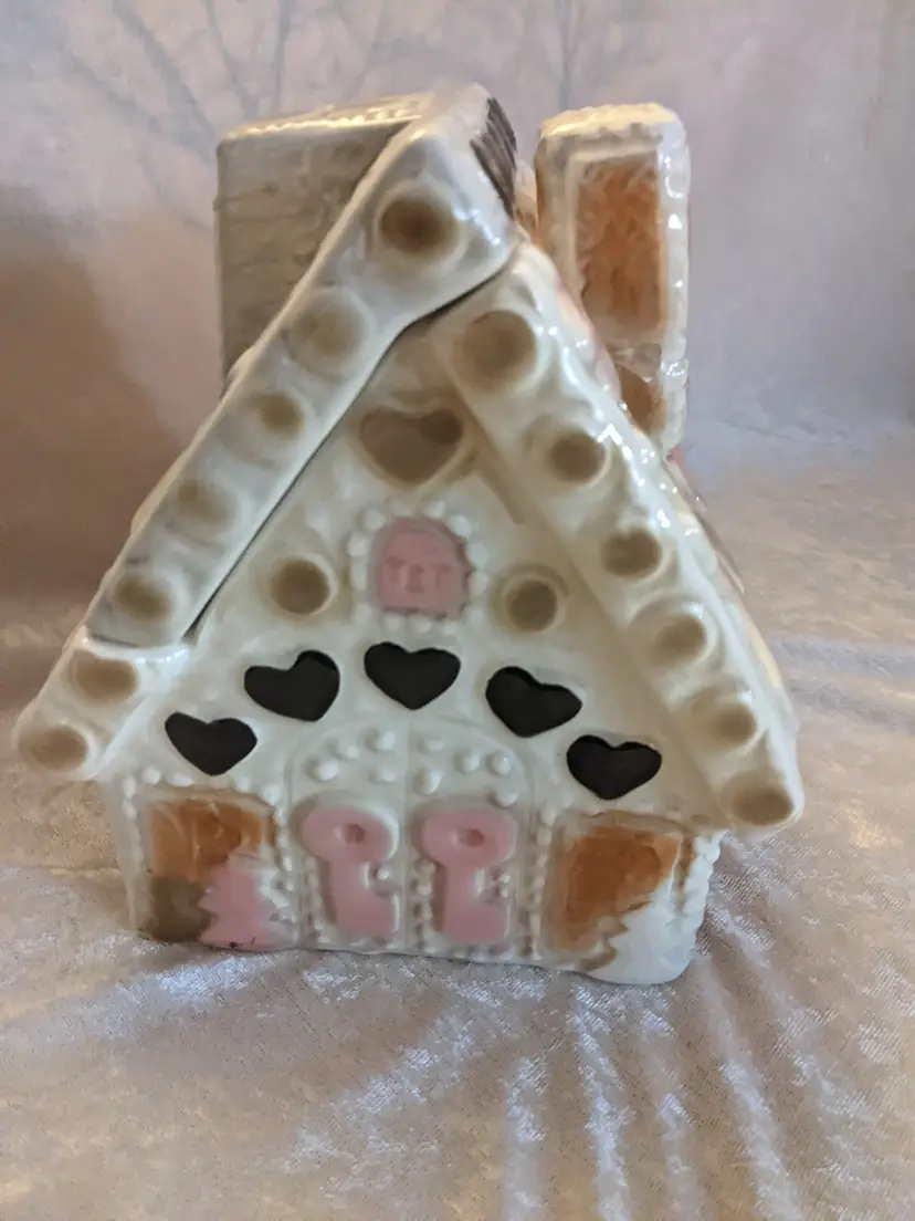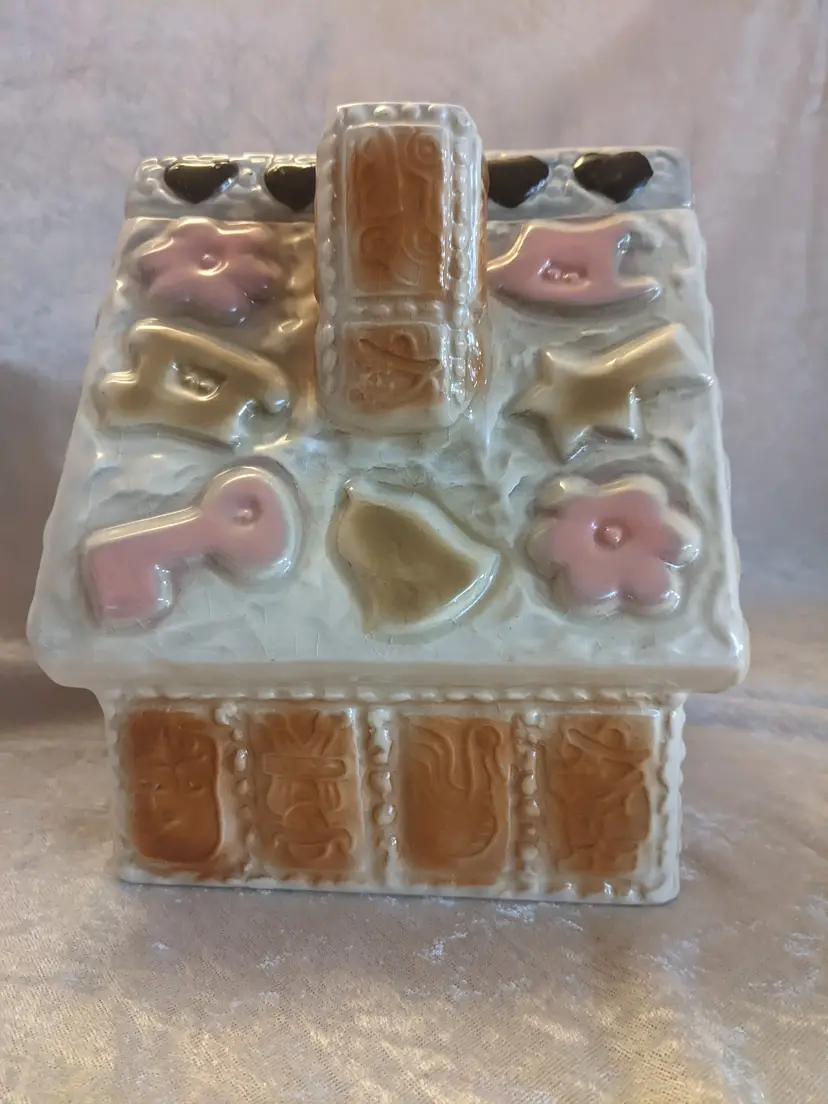 Gingerbread House Cookie Jar VTG for Bahlsen Cookie company could be made by Duncan enterprises.Made of Ceramic Perfect for. Christmas It has Black Heart cookies around the door and other shape round , trees, keys cookies. It measures 9in tall 8in wide . Gift Very good condition Clean with no damage,no chips or cracks no weird smells. Please check the photos for details. Comes from a smoke free home. We do have pets. It is kept away from them