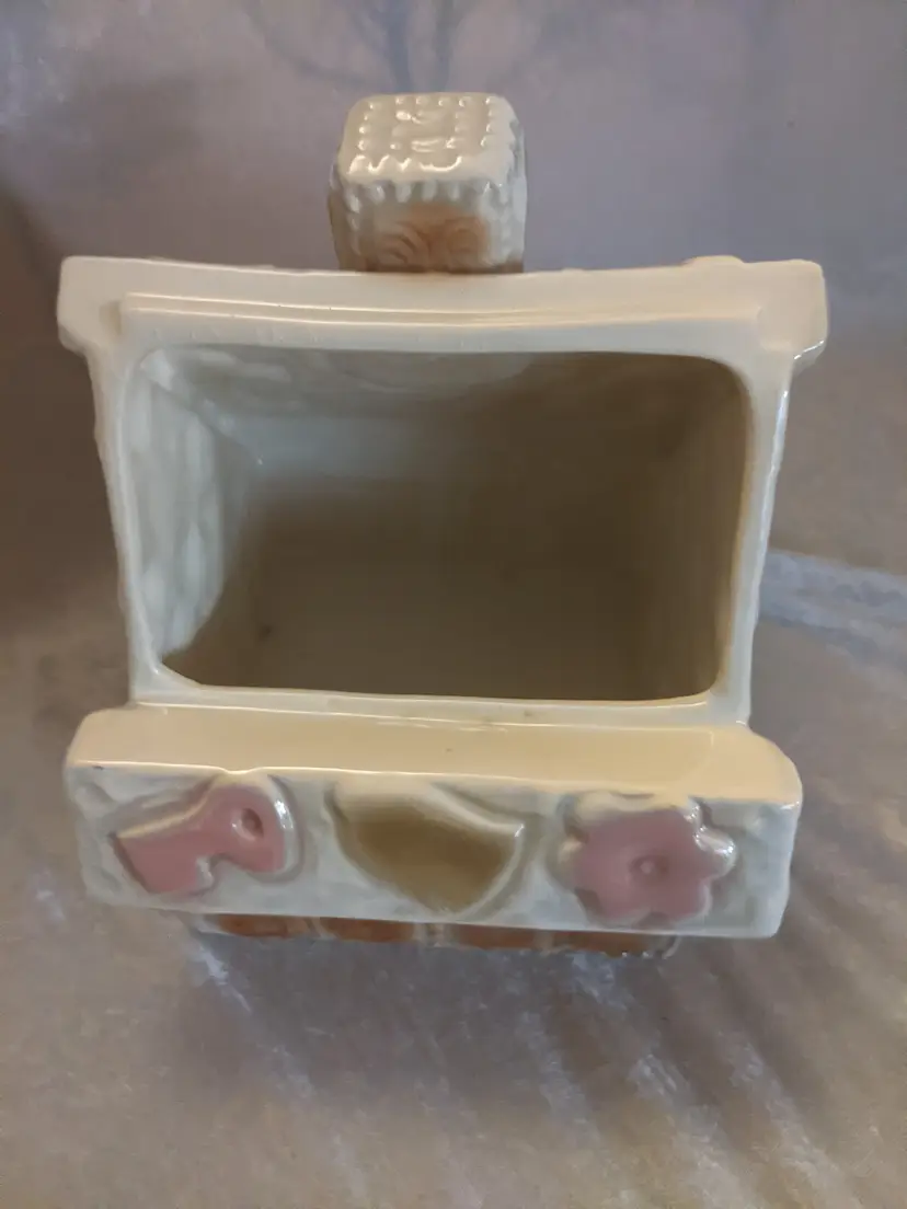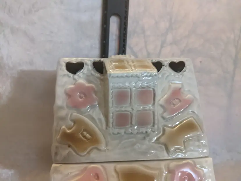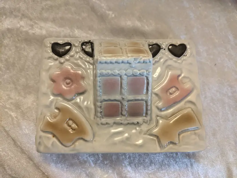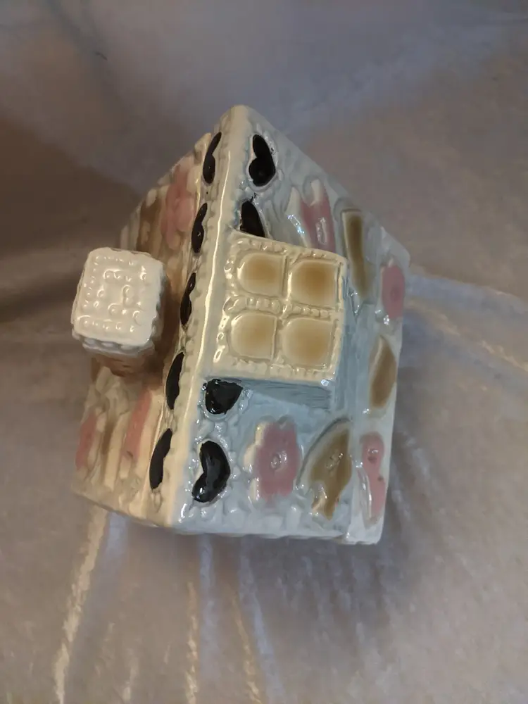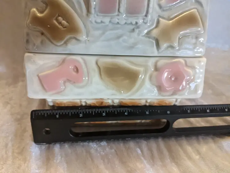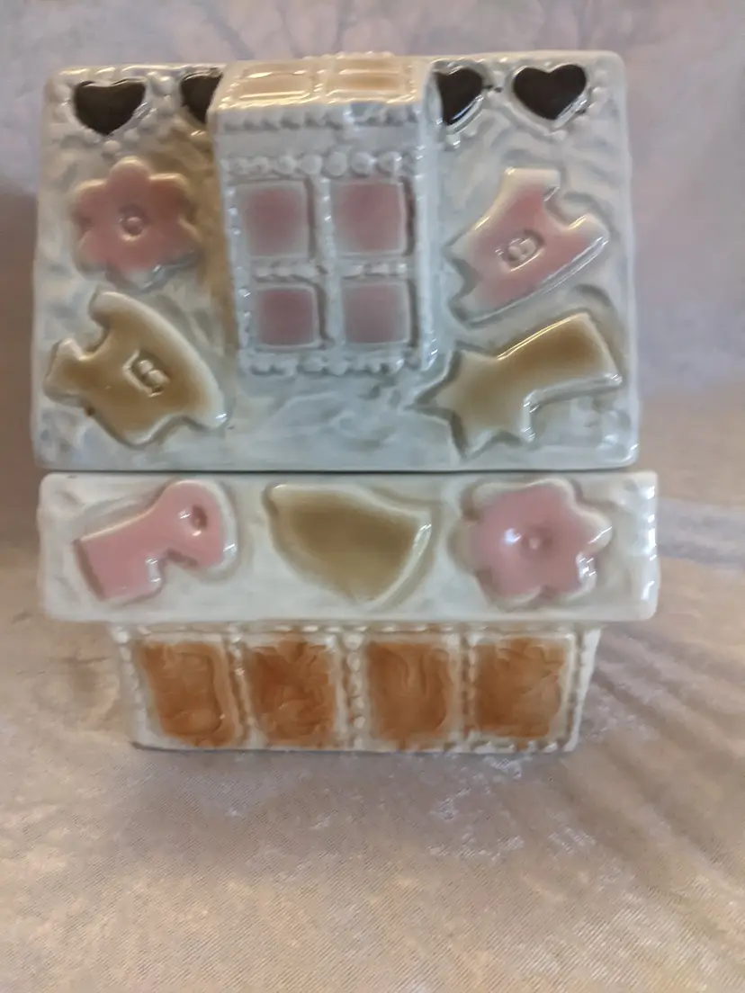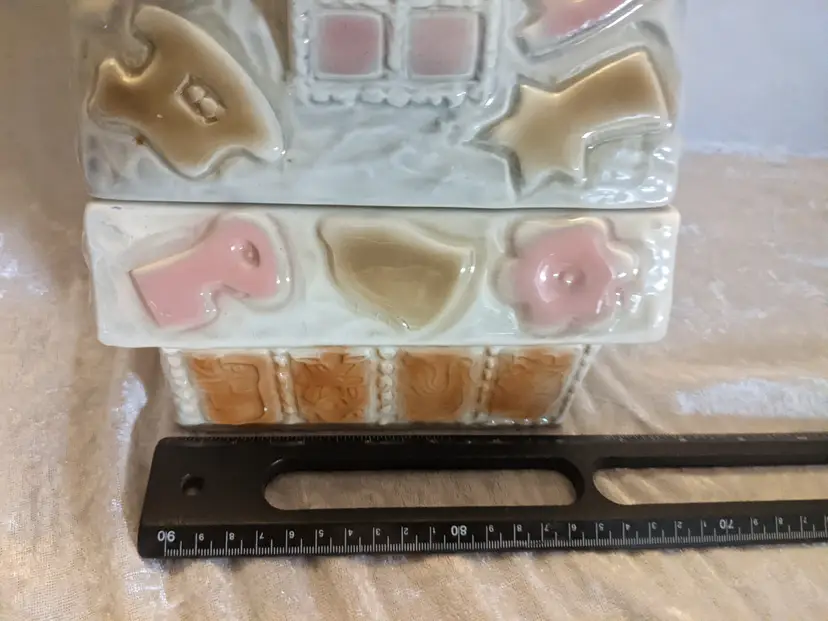 Gingerbread House Cookie Jar VTG for Bahlsen Cookie company could be made by Duncan enterprises.Made of Ceramic Perfect for. Christmas It has Black Heart cookies around the door and other shape round , trees, keys cookies. It measures 9in tall 8in wide . Gift Very good condition Clean with no damage,no chips or cracks no weird smells. Please check the photos for details. Comes from a smoke free home. We do have pets. It is kept away from them