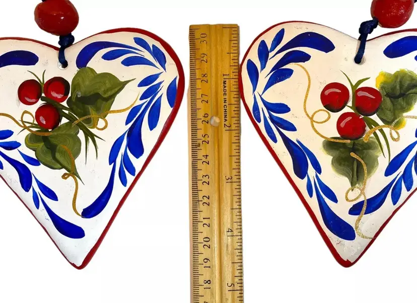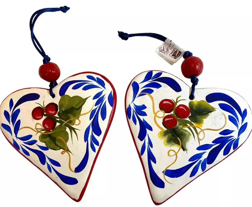 Heart Shaped, Hand Painted Heart Ornaments, Set of 2. Height 4.5”, length 4.5”, width .25”. No chips or cracks.