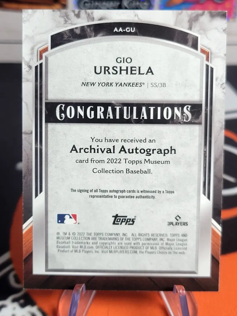 Up for sale is a 2022 Topps Museum Collection Archival On-Card Auto featuring Gio Urshela, serial-numbered /50 with the striking Copper parallel finish. This is an authenticated on-card signature from the high-end Museum Collection release, making it a standout addition for collectors.