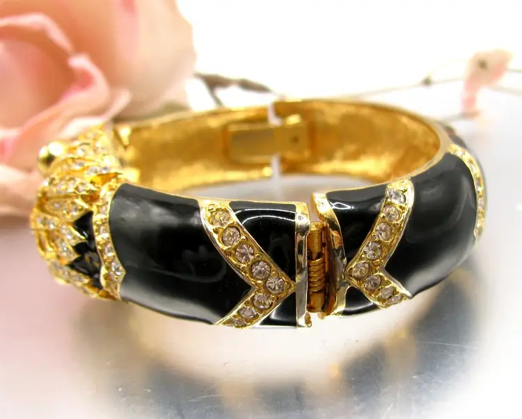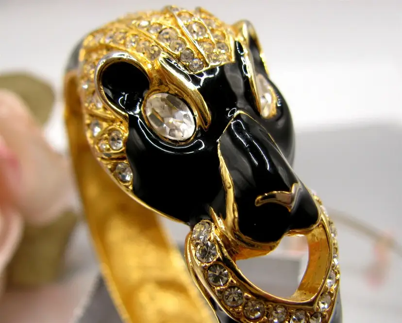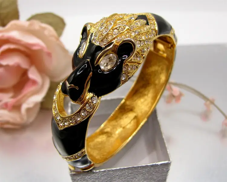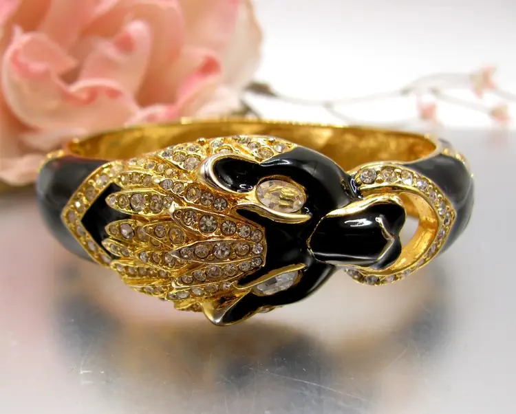 This wonderful vintage signed Giorgio gold tone bracelet features a hinged bangle design of a sparkling rhinestone black panther or leopard.