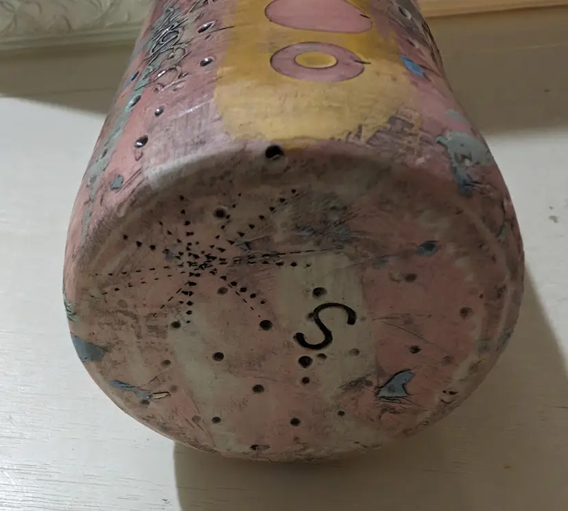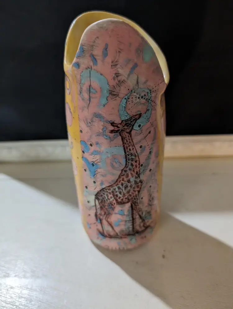 Very cute and unique looking piece that is a giraffe on hand painted pottery. Piece is used but is in Amazing shape with no cracks or chips and no signs of wear and tare. Great use of colors with pink baby blue and brown with a solid yellow color on the inside of vase. Piece is approximately 7 inches height with a 3 inch width. Design appears to be a safari background in pink and blue colors and is definitely hand made with a abstract top design. Very nice looking piece.