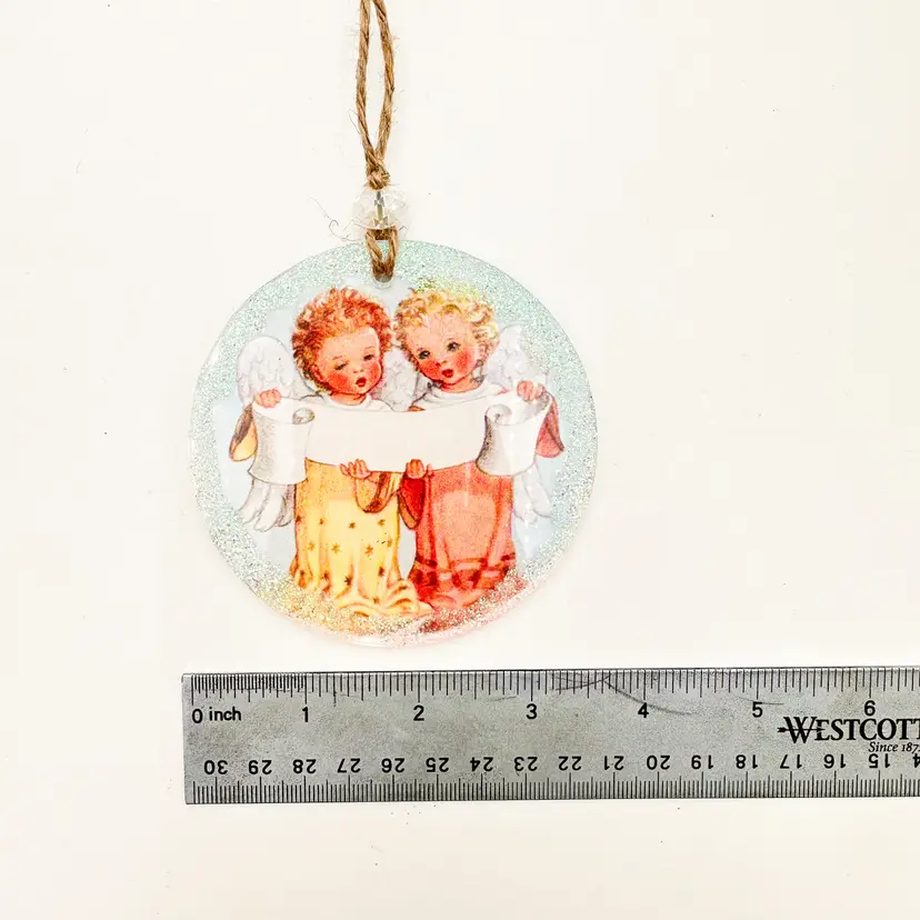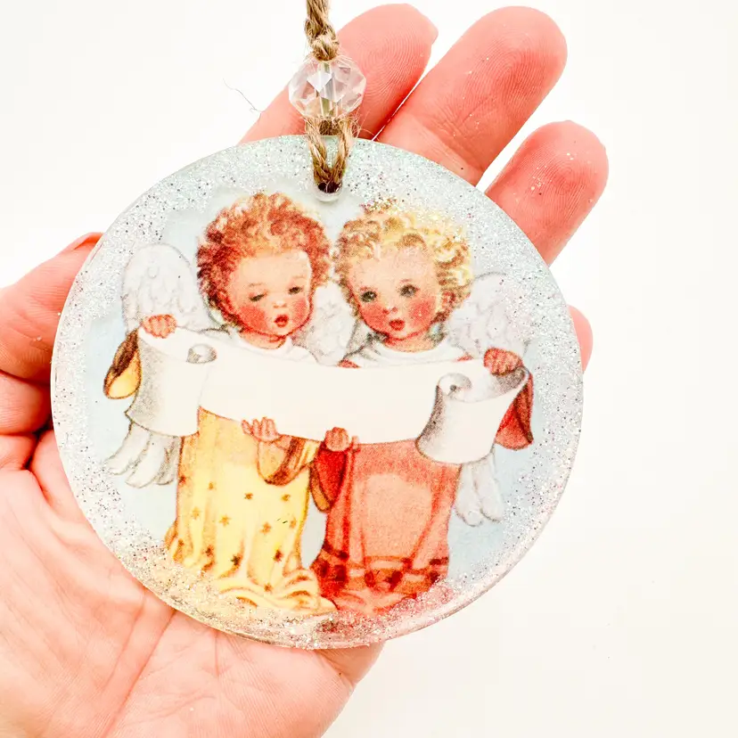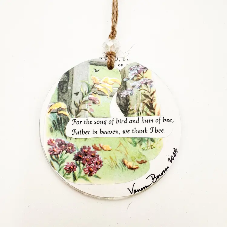 3.5" D New, handmade This series of ornaments was made using clear acrylic discs and illustrations from the Little Golden Book, Prayers for Children. The reverse side is finished with a prayer from the book and a black and white illustration which I painted with watercolors. Watch me make these in my live, Meet Your Maker from 11/29/24 and complete them during the Art Hangout live from 12/7/24.