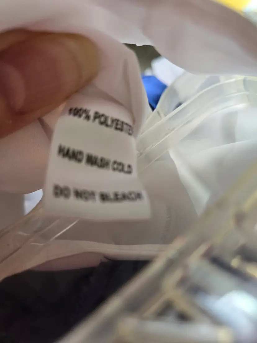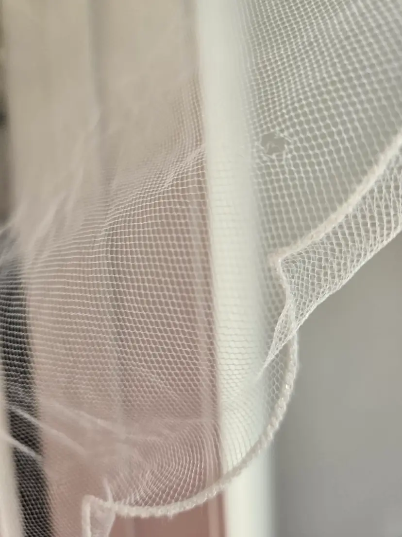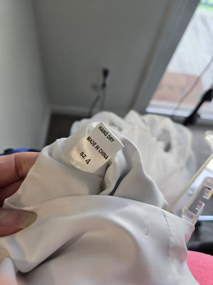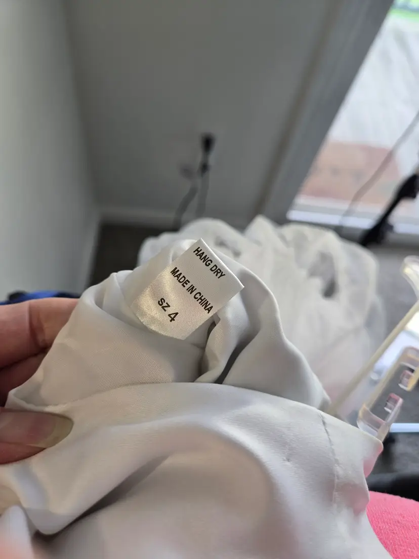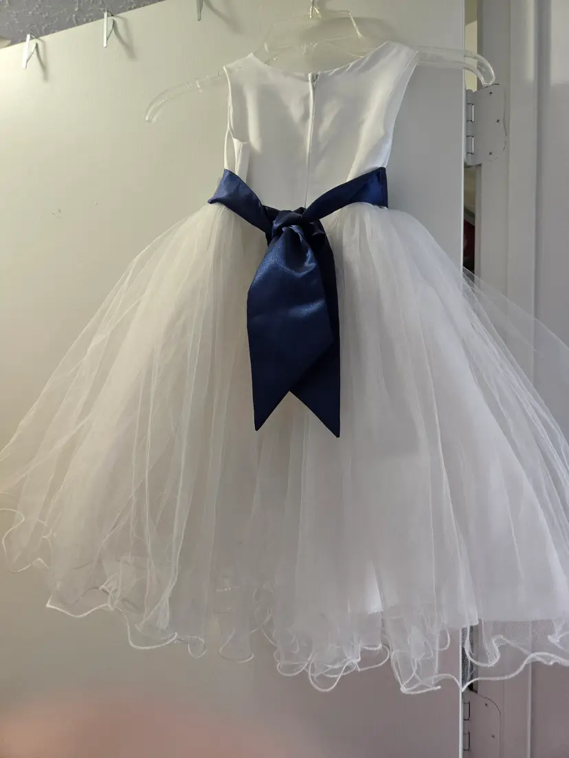 Girls Size 4 flower girl dress white with blue Sash and removable rosette. Has a couple of holes in the netting and some threads hanging. 100% polyester. Unbranded.