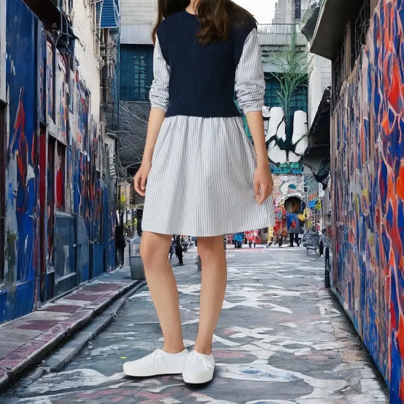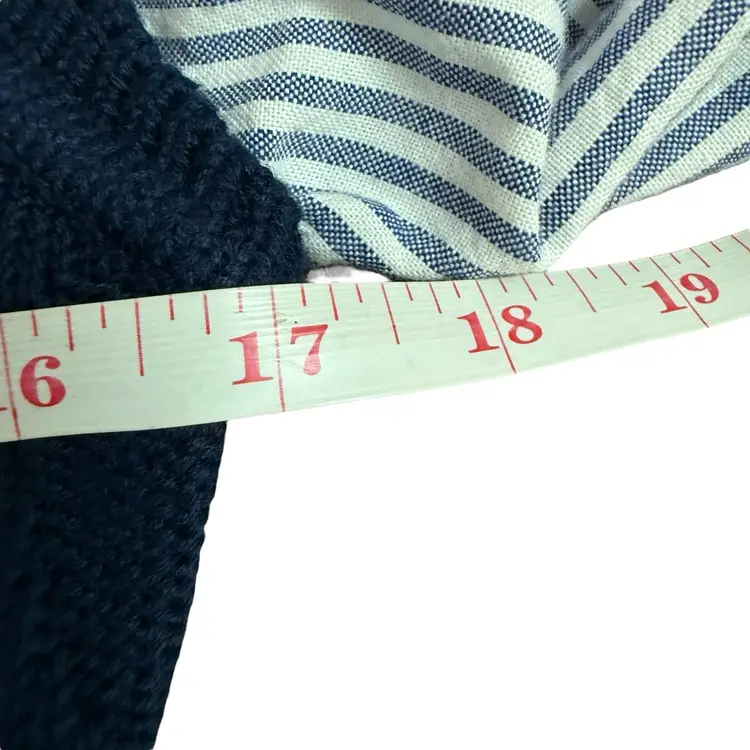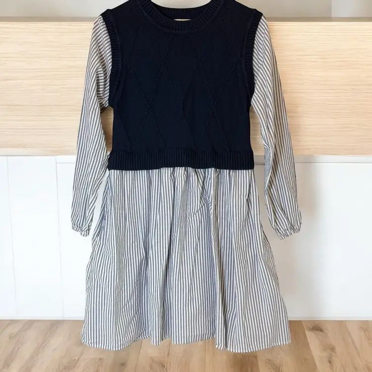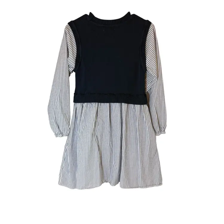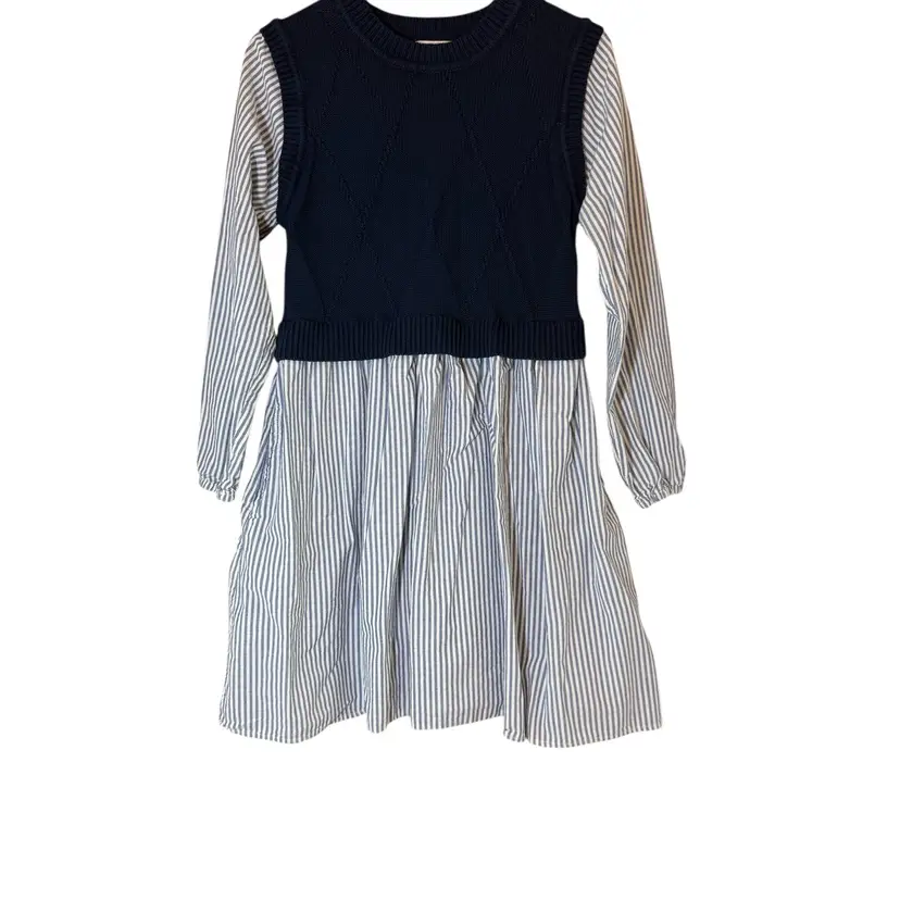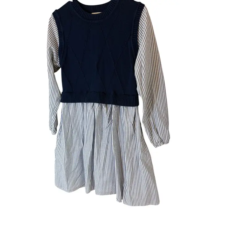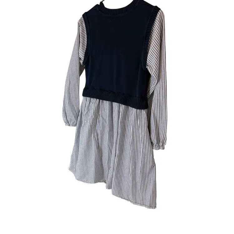 The Girls XXL Blue Striped Sweater Vest Dress by Free Assembly is a stylish and versatile addition to any young girl's wardrobe. This knee-length dress features a round neckline, long sleeves with elastic cuffs, and a pullover closure for easy wear. Made from a comfortable cotton blend fabric, this A-line dress is perfect for various occasions such as travel, parties, and casual wear. With its classic blue stripes and preppy schoolgirl theme, this dress is both fashionable and practical for all seasons.