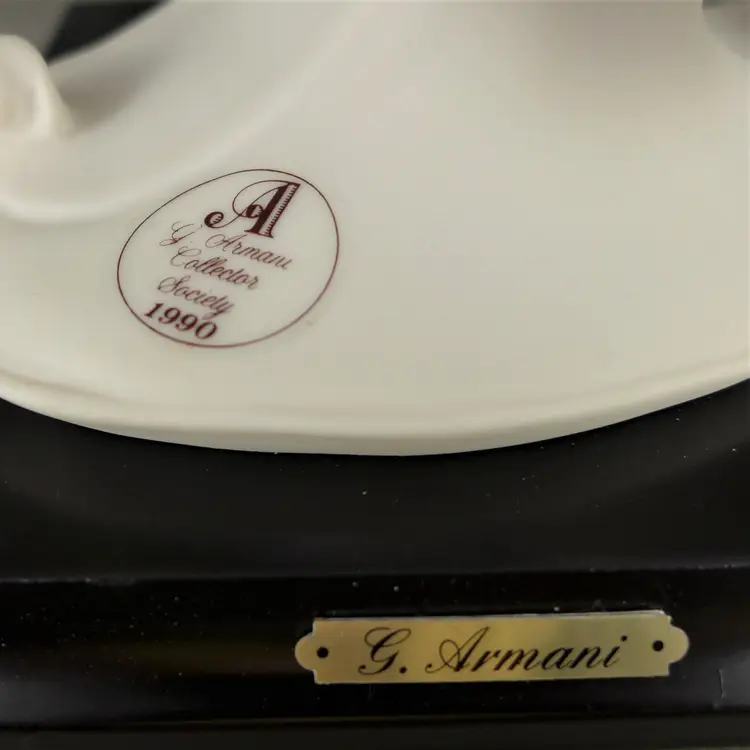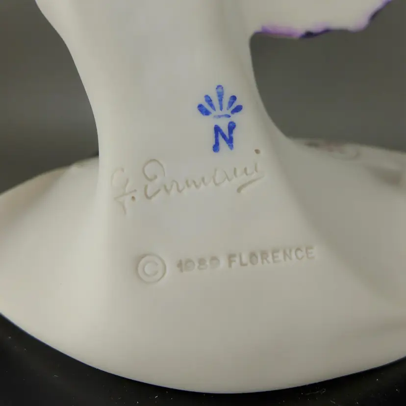 Measurements - it stands 13.5 inches tall, is 8 inches wide, and approximately 4.5 inches deep. Markings - The lower end of the figurine is marked with the collectors club mark, is incised G. Armani, Florence 1989, and stamped with the blue Capodimonte mark. Condition - it has been carefully examined and is in perfect condition, with no defects of any kind.