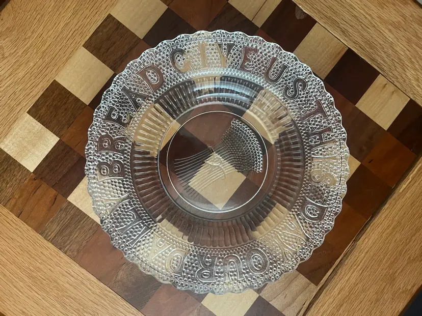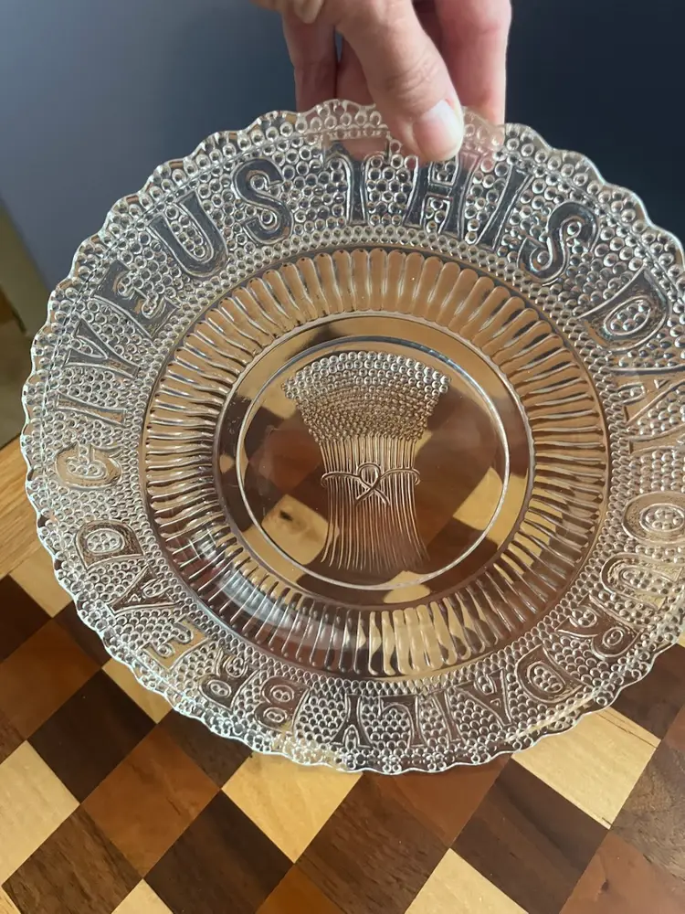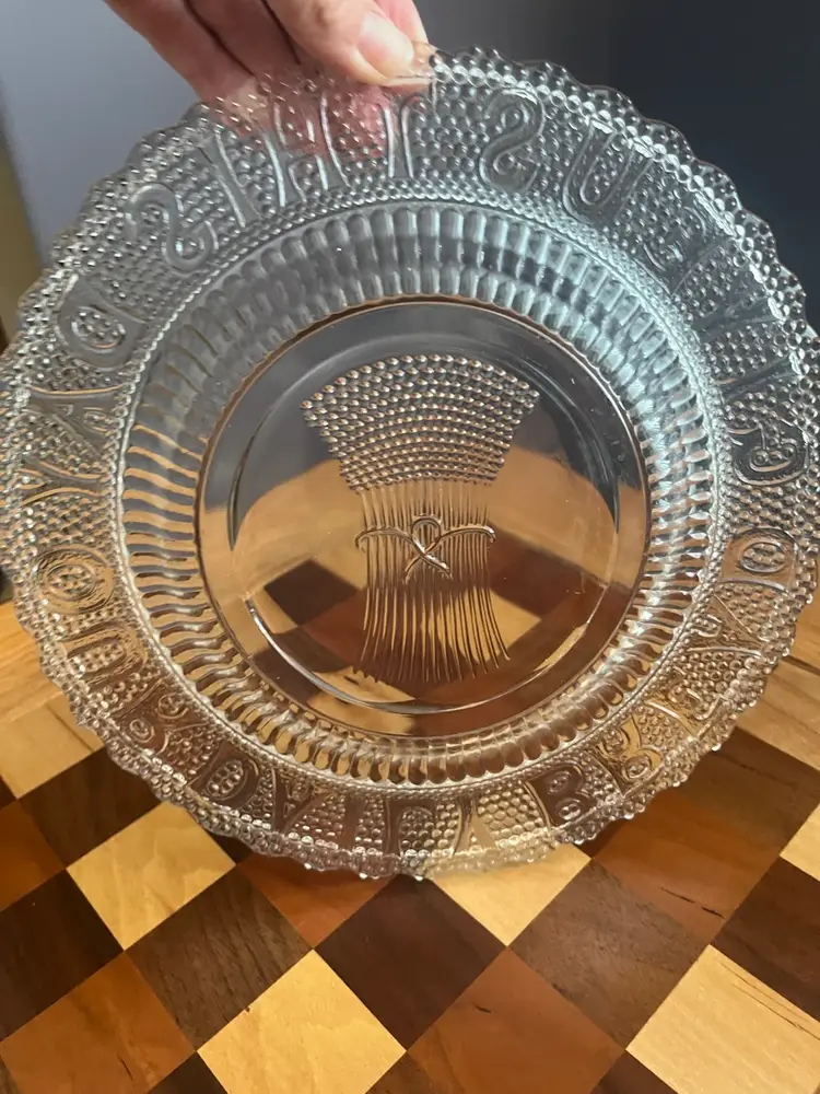 American pressed glass 10 inch plate- in glass it notes “ give us this day our daily bread. “ Wheat bundle and center of glass