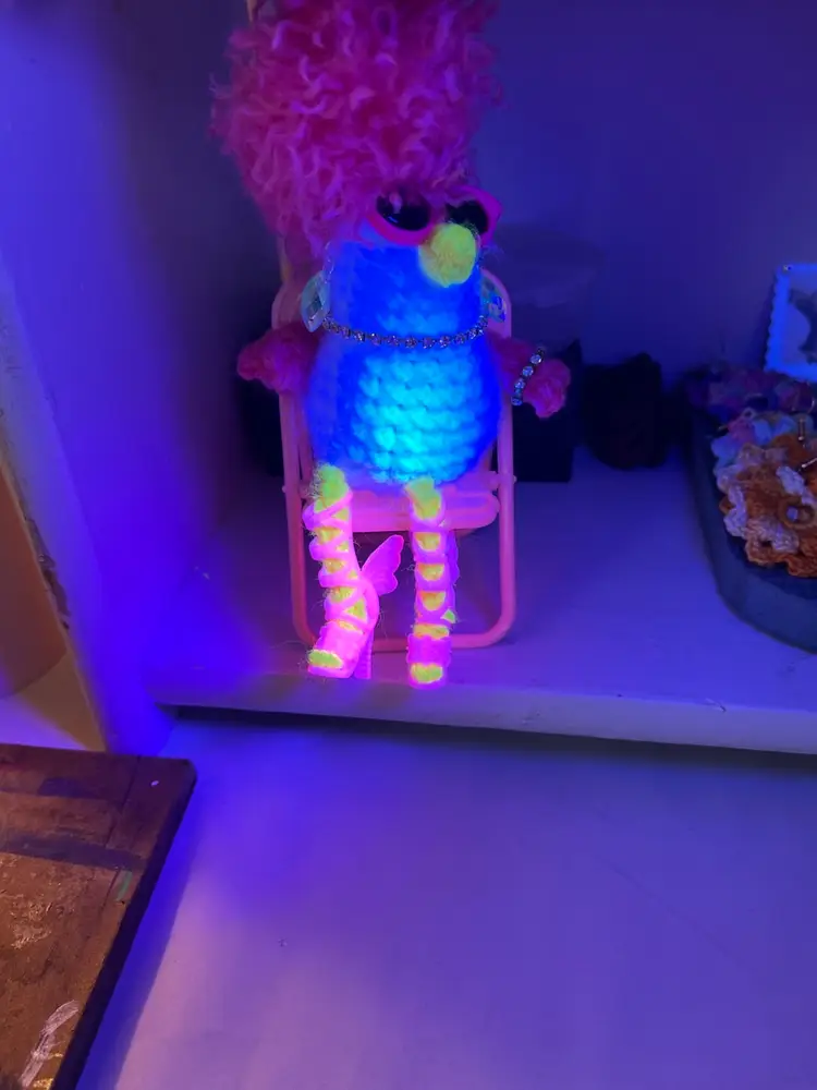 Fancy flame chick glasses, bracelet, necklace, dangling earrings, and fabulous pink heels with wings on the back that glow. Comes with her chair as well.