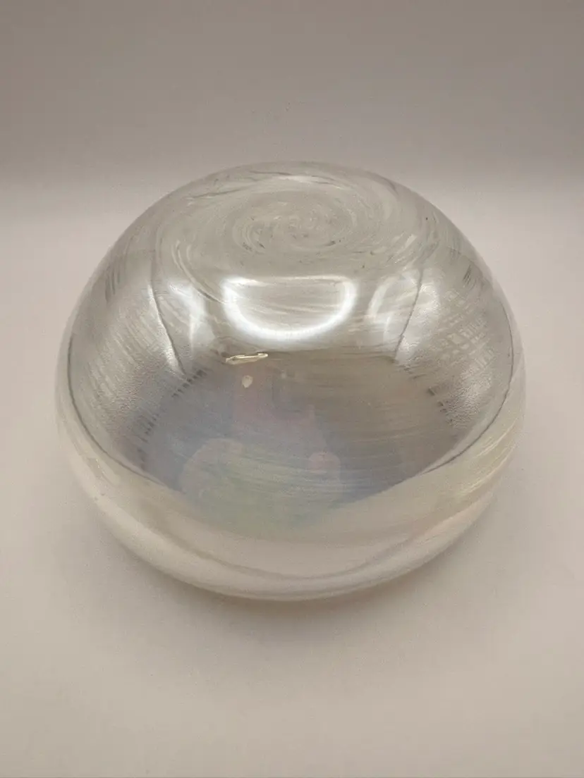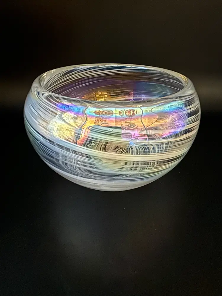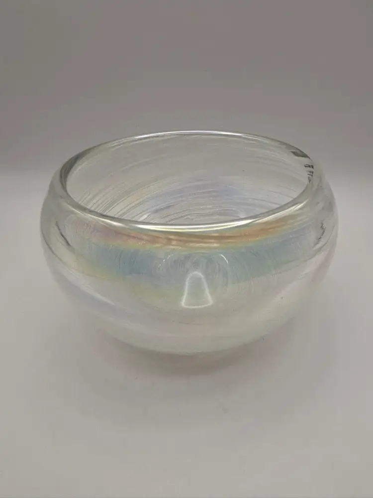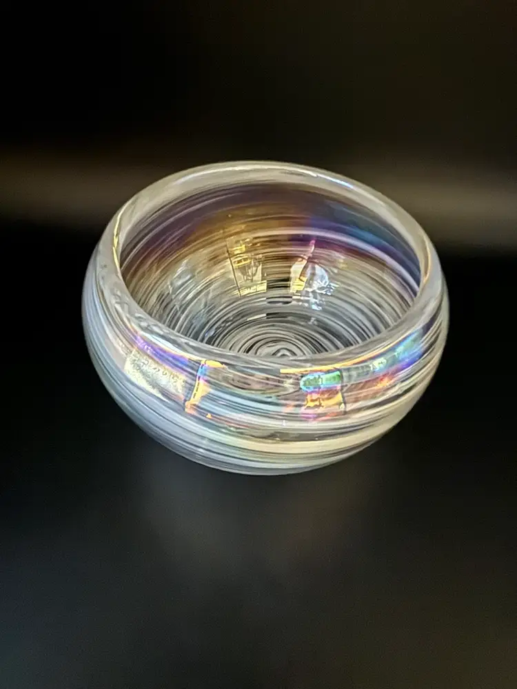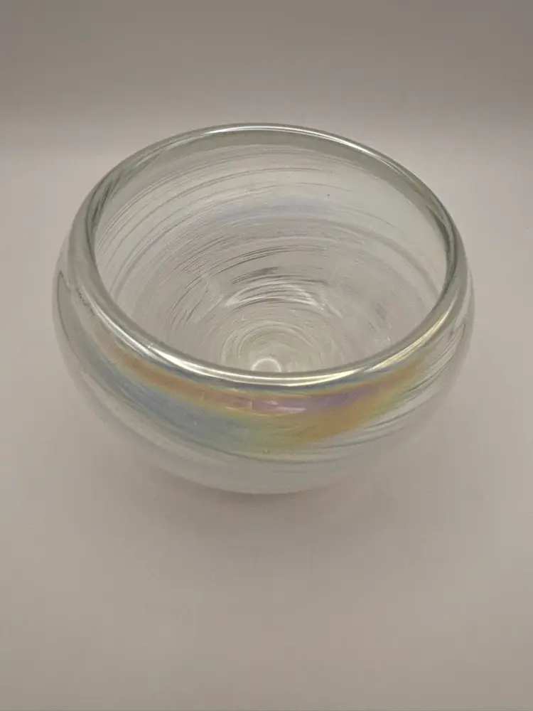 Glass bowl would make a nice candy dish or use for bookshelf decor. The glass is heavy and thick with a beautiful glimmer and shine (The glass has some manufacturing bubbles Look closely at pictures ) No chips or cracks 3” tall and 4” in diameter