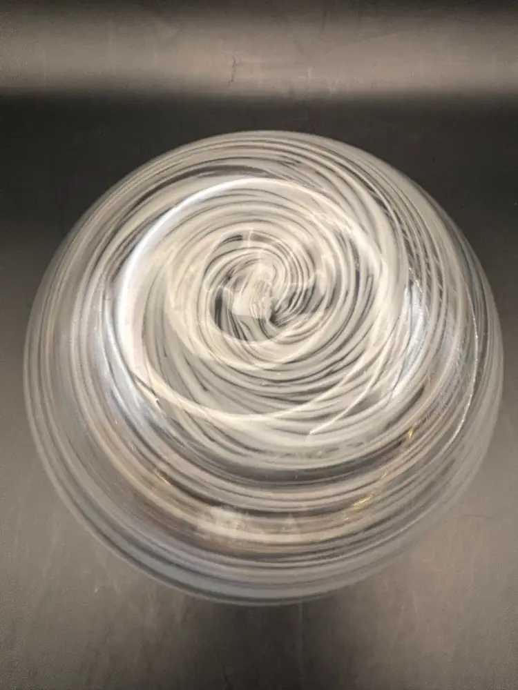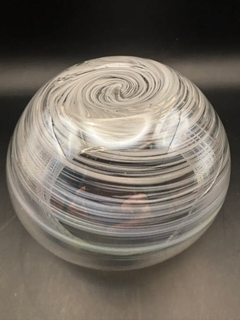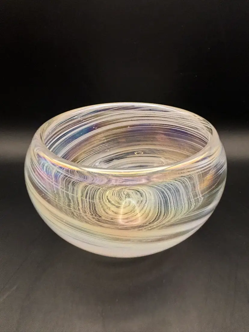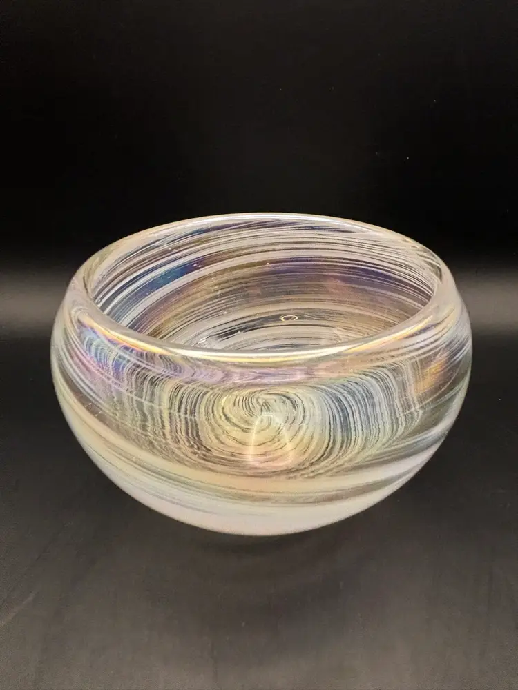 Glass bowl would make a nice candy dish or use for bookshelf decor. The glass is heavy and thick with a beautiful glimmer and shine (The glass has some manufacturing bubbles Look closely at pictures ) No chips or cracks 3” tall and 4” in diameter