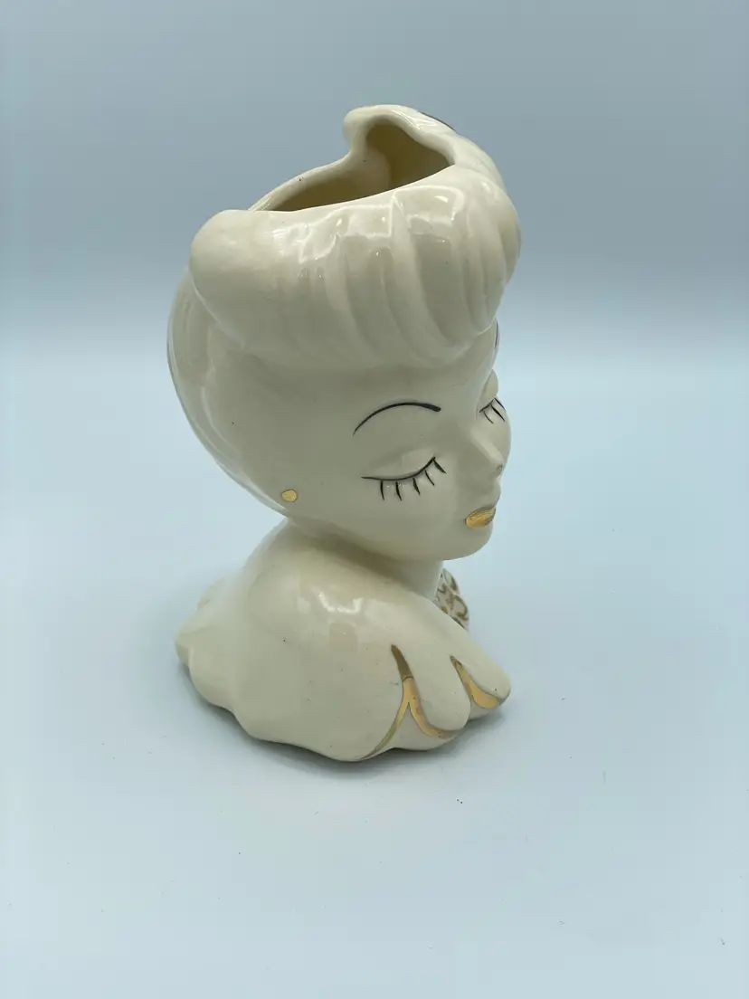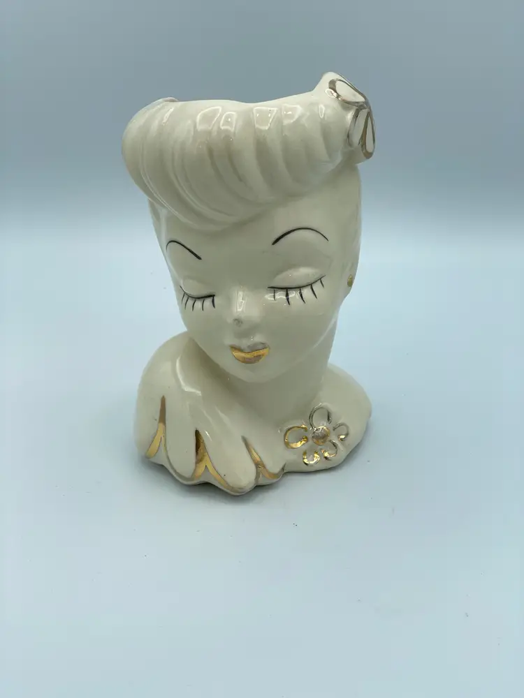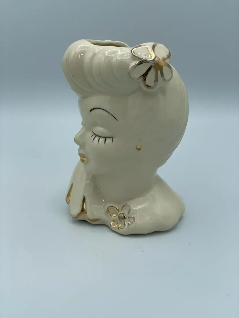 Vintage Glamour Girl Head Vase. Mid Century Hollywood Style With Gold Accents. Some Gold Paint Loss. No Chips/Cracks. Good Vintage Condition. 6 1/2" Tall X 4 1/4" W.
