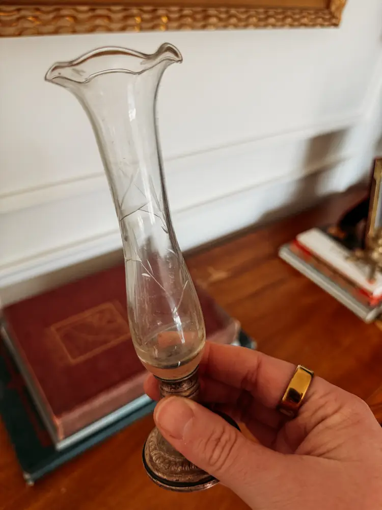 This is a vintage Empire etched glass bud vase with a weighted sterling silver or pewter base. The glass portion features a fluted, ruffled top and an etched leaf design 7" tall