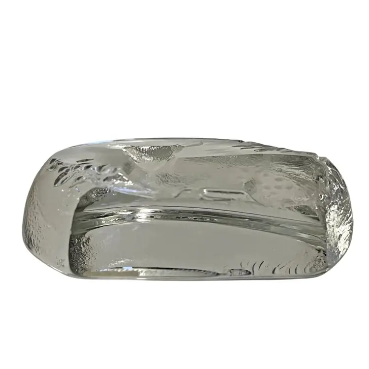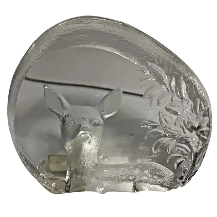 The Glass art paper weight is created by Mats Jonasson. The sculpture of Fawn in Lead Crystal is a vintage piece of art. This paperweight features a beautiful glossy finish and is adorned with a deer fawn subject, showcasing the artist's signature. Made in Sweden, this art glass sculpture adds a touch of elegance and charm to any space, perfect for collectors of decorative pottery and glassware.