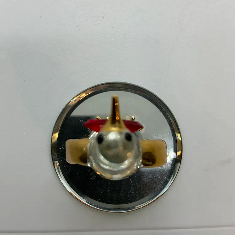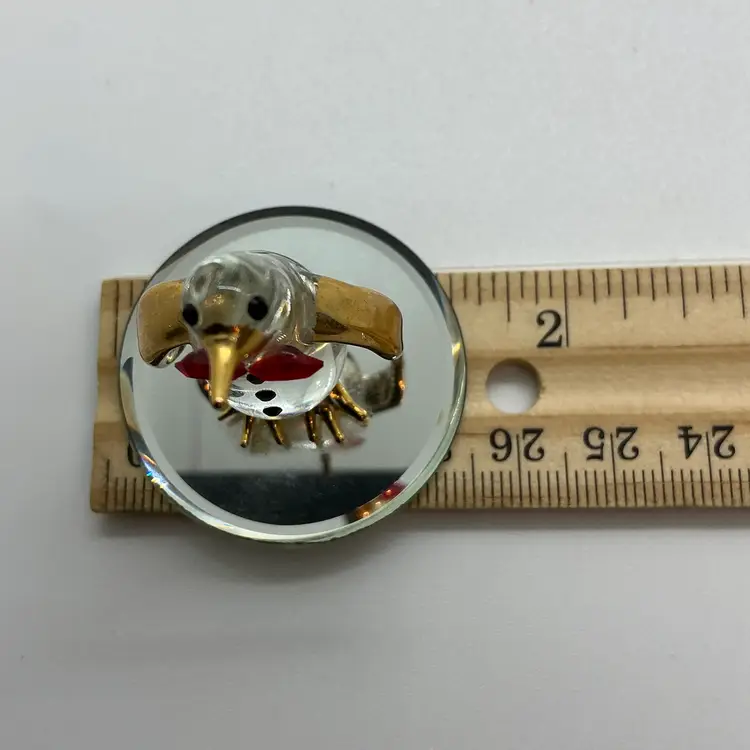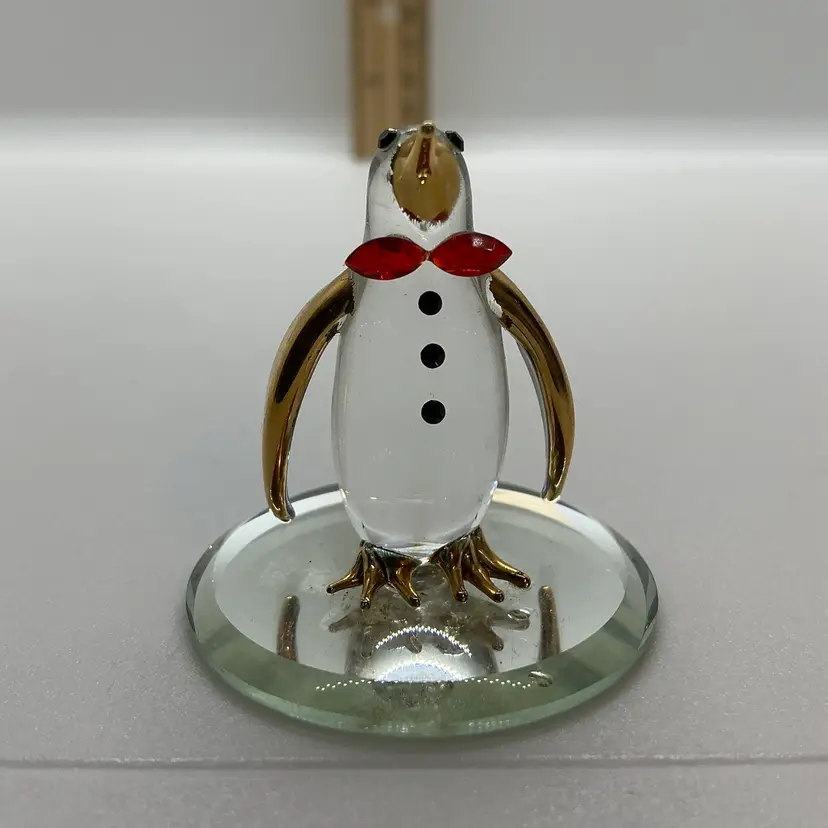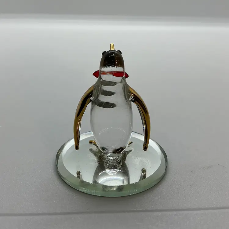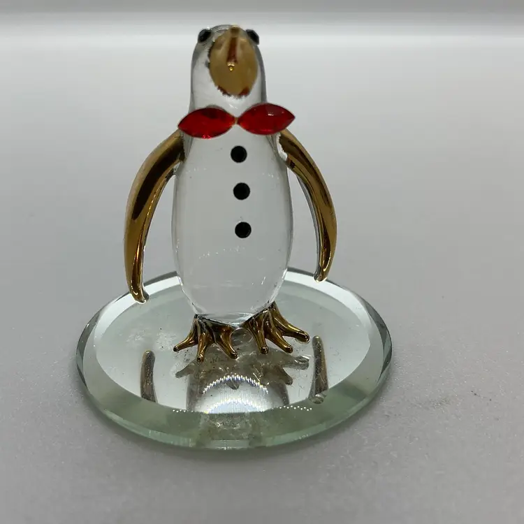 The Glass Baron Poppy Penguin Figurine is a meticulously handcrafted piece made of glass in the United States. It features a charming penguin design with a red bowtie, accented with 22 karat gold leaf. Comes from a non smoking home.