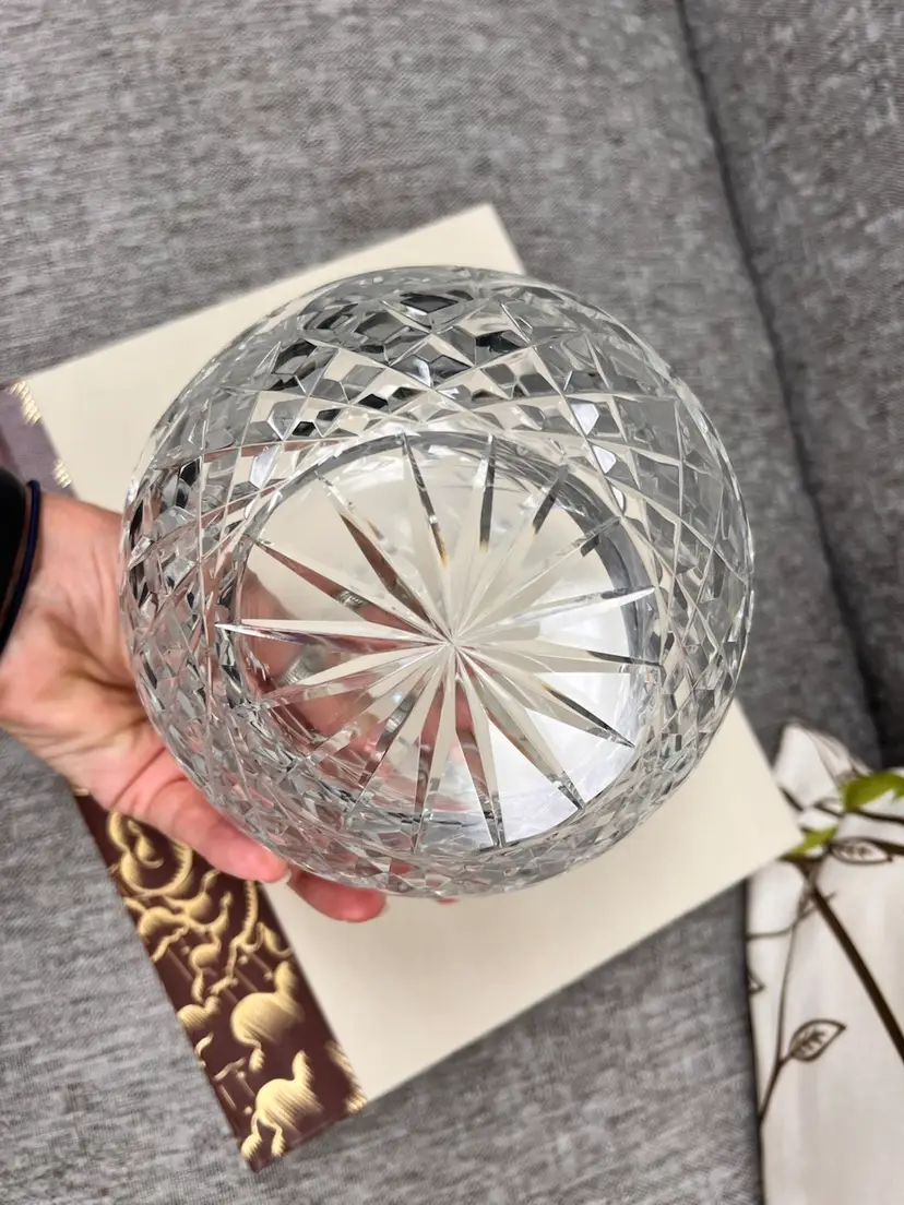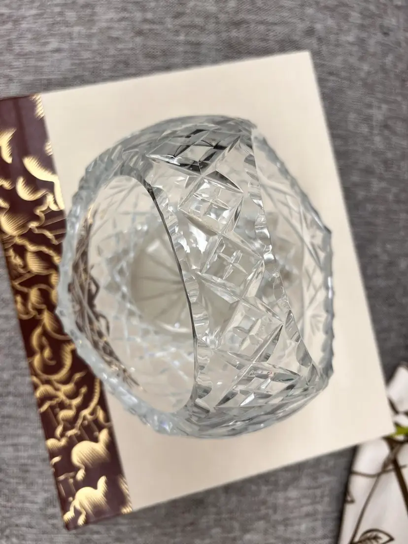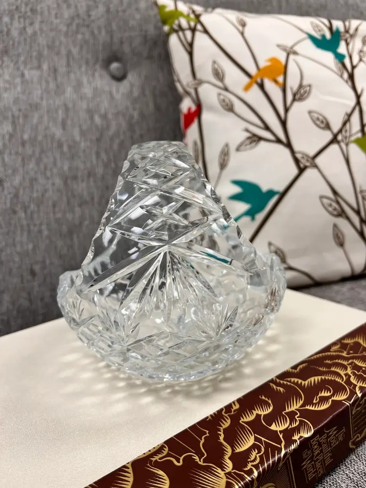 Glass Basket with Star Pattern. Approx. 5.5H X 5.5W and weighs 2b 1.6oz. Heavy and fancy. So many options for decorating or gifting.