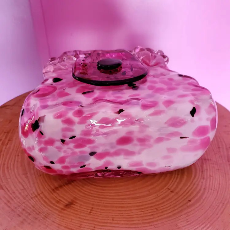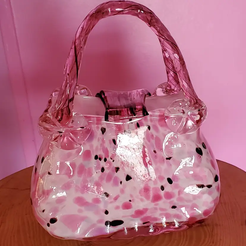 This vintage decorative purse figure is made of multicolored hand-blown glass in an Art Deco style. It features a leopard print design and has a glossy finish. The purse figure measures 8 inches in height, 6 and a half inches in length, and 3 and a half inches in width. It is a unique art piece reminiscent of Murano glass craftsmanship, with a weight of 3 pounds.
