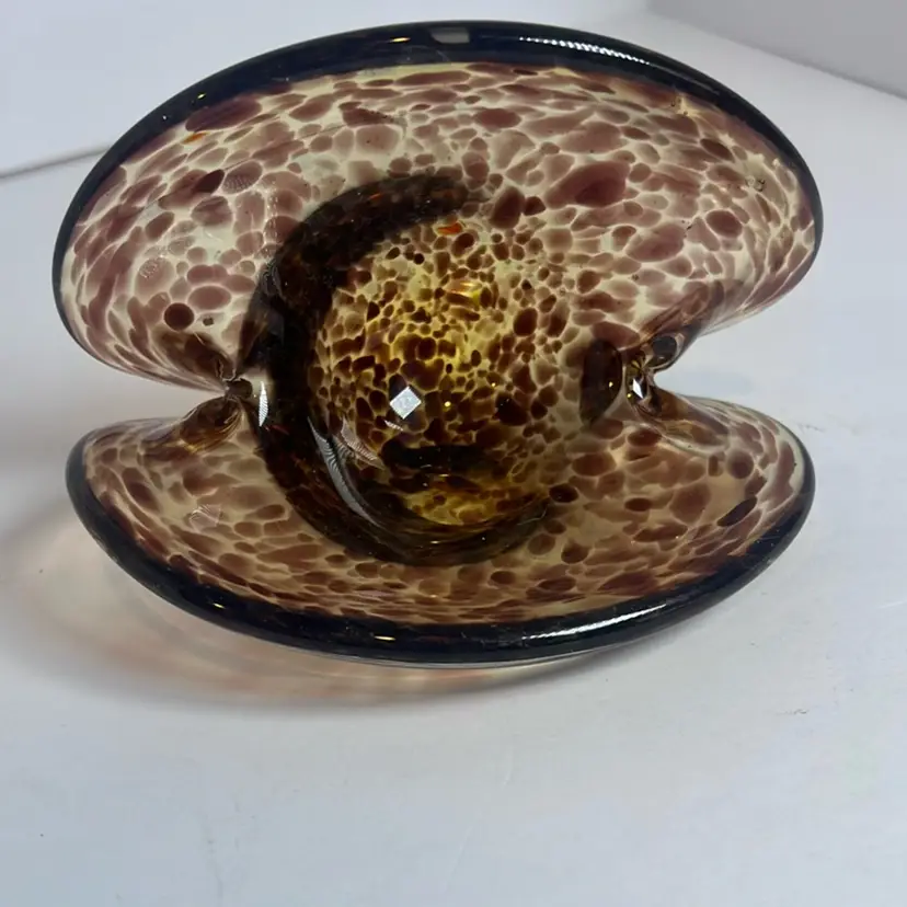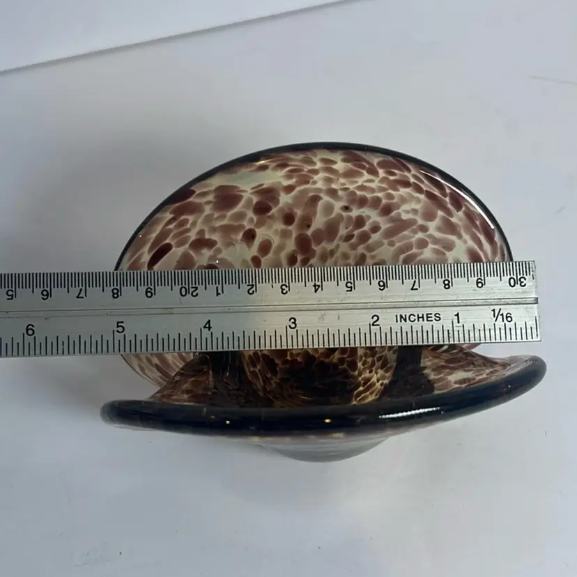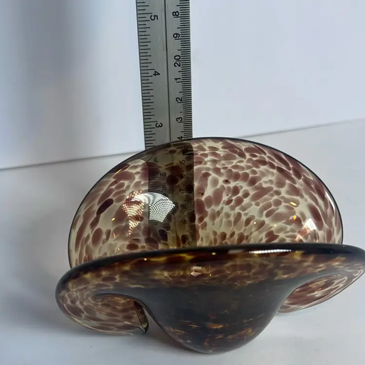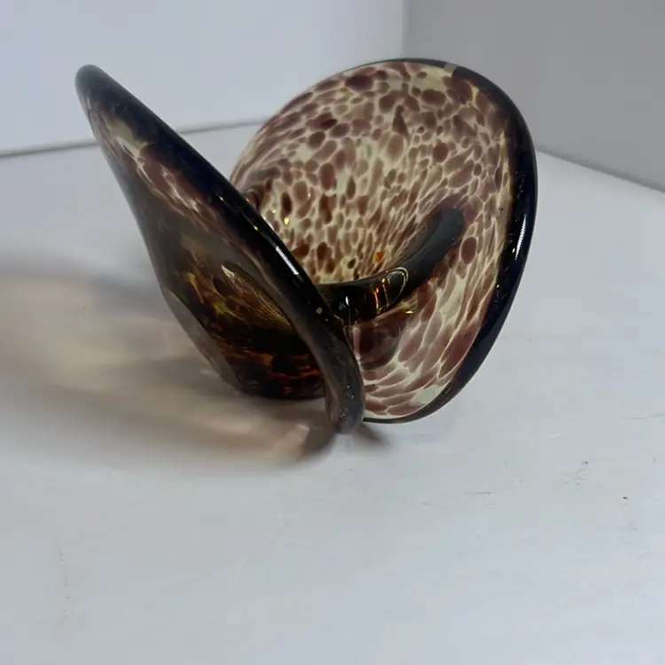 Got this cool little hand blown glass bowl or dish. It has a neat brown and tan speckled pattern that kind of looks like tortoiseshell. The shape is pretty unique with that folded over rim, definitely has a mid-century or art glass vibe to it. It's in good shape, no major chips or anything that I can see. Perfect for holding keys or just sitting on a shelf looking nice.