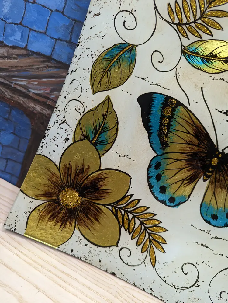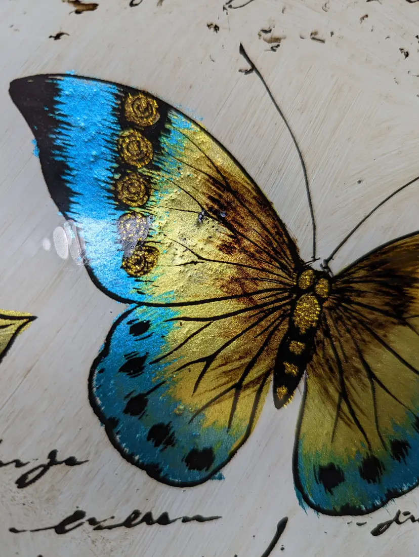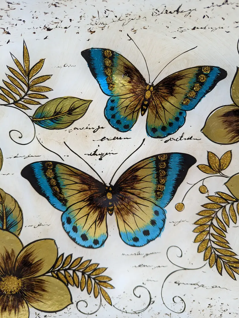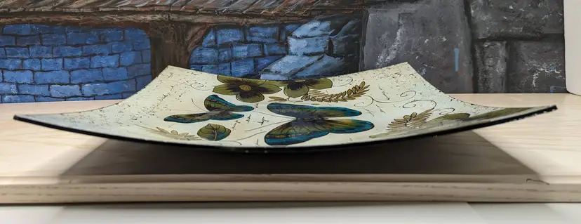 Butterfly Iridescent Fused Glass Square Plate or Platter 14in x 14 in,Perfect for holiday desserts , cake ,Charcuterie or any food item. This is gorgeous the pictures do not do it justice.Perfect gift Christmas Mothers Day Or Birthday. Excellent condition Please check our photos for detail Perfect for your spring summer table. Would make a wonderful wall art.