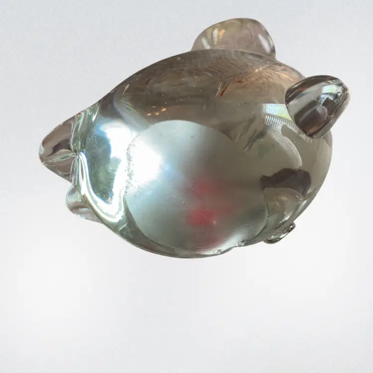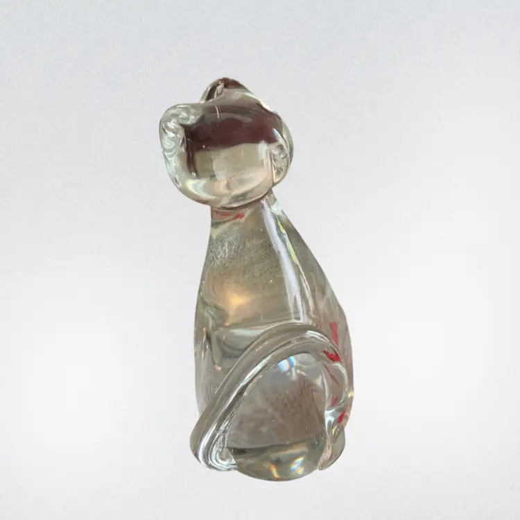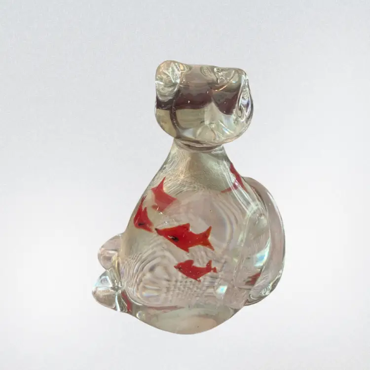 4.5” x 3.5” clear glass cat with two orange fish in belly. No cracks of chips